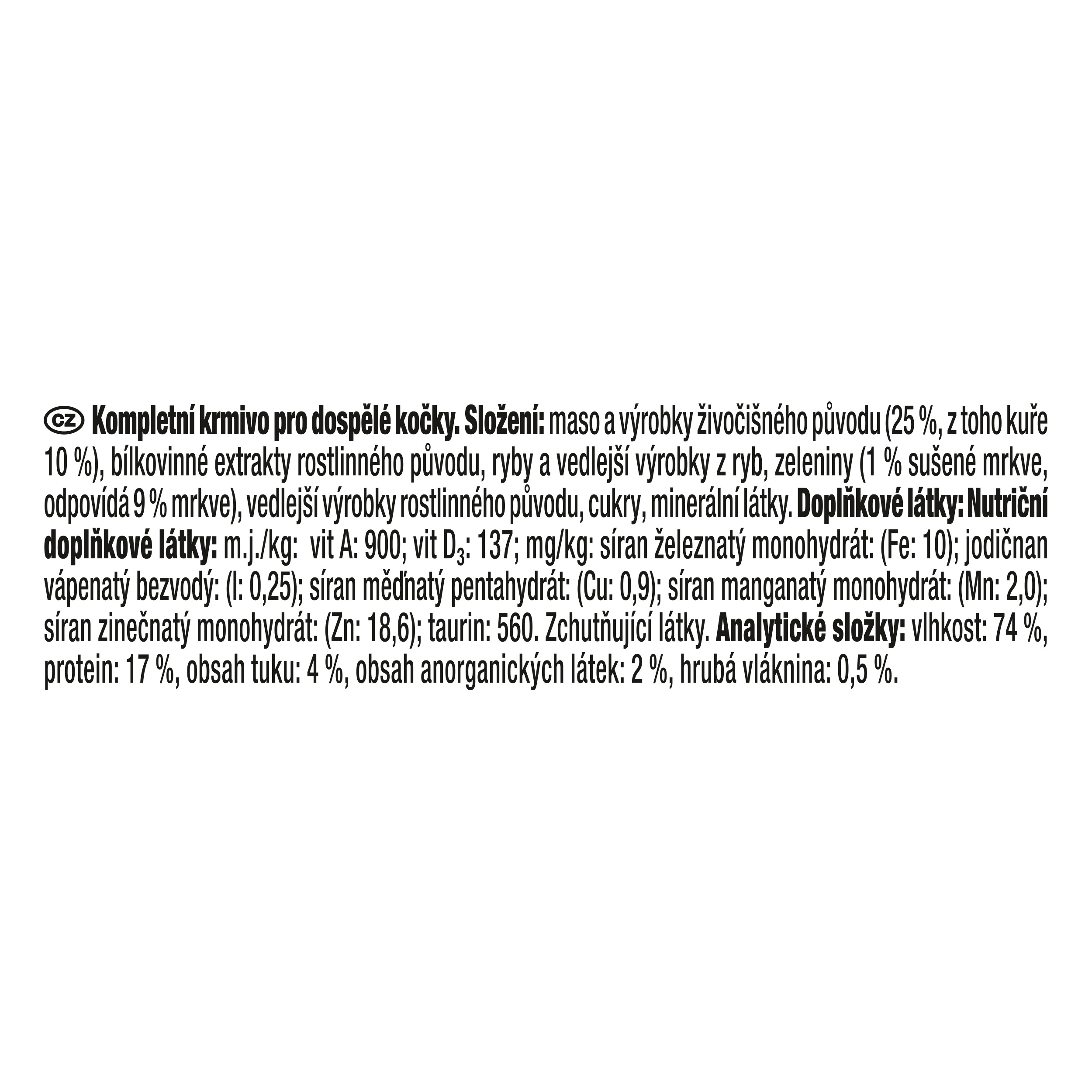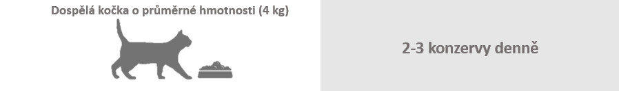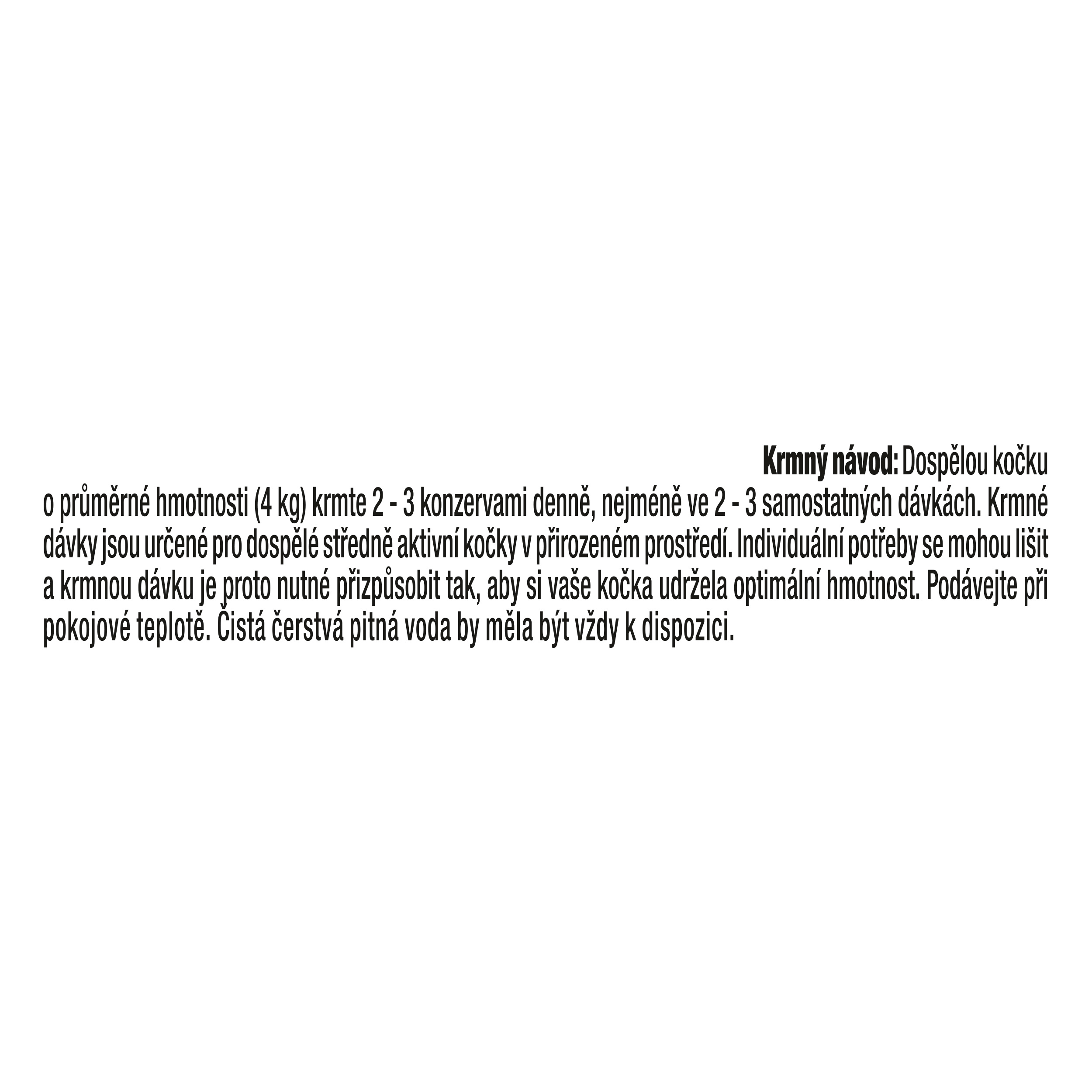 Krmný návod: Dospělou kočku o průměrné hmotnosti (4 kg) krmte 2 - 3 konzervami denně, nejméně ve 2 - 3 samostatných dávkách. Krmné dávky jsou určené pro dospělé středně aktivní kočky v přirozeném prostředí. Individuální potřeby se mohou lišit a krmnou dávku je proto nutné přizpůsobit tak, aby si vaše kočka udržela optimální hmotnost. Podávejte při pokojové teplotě. Čistá čerstvá pitná voda by měla být vždy k dispozici.