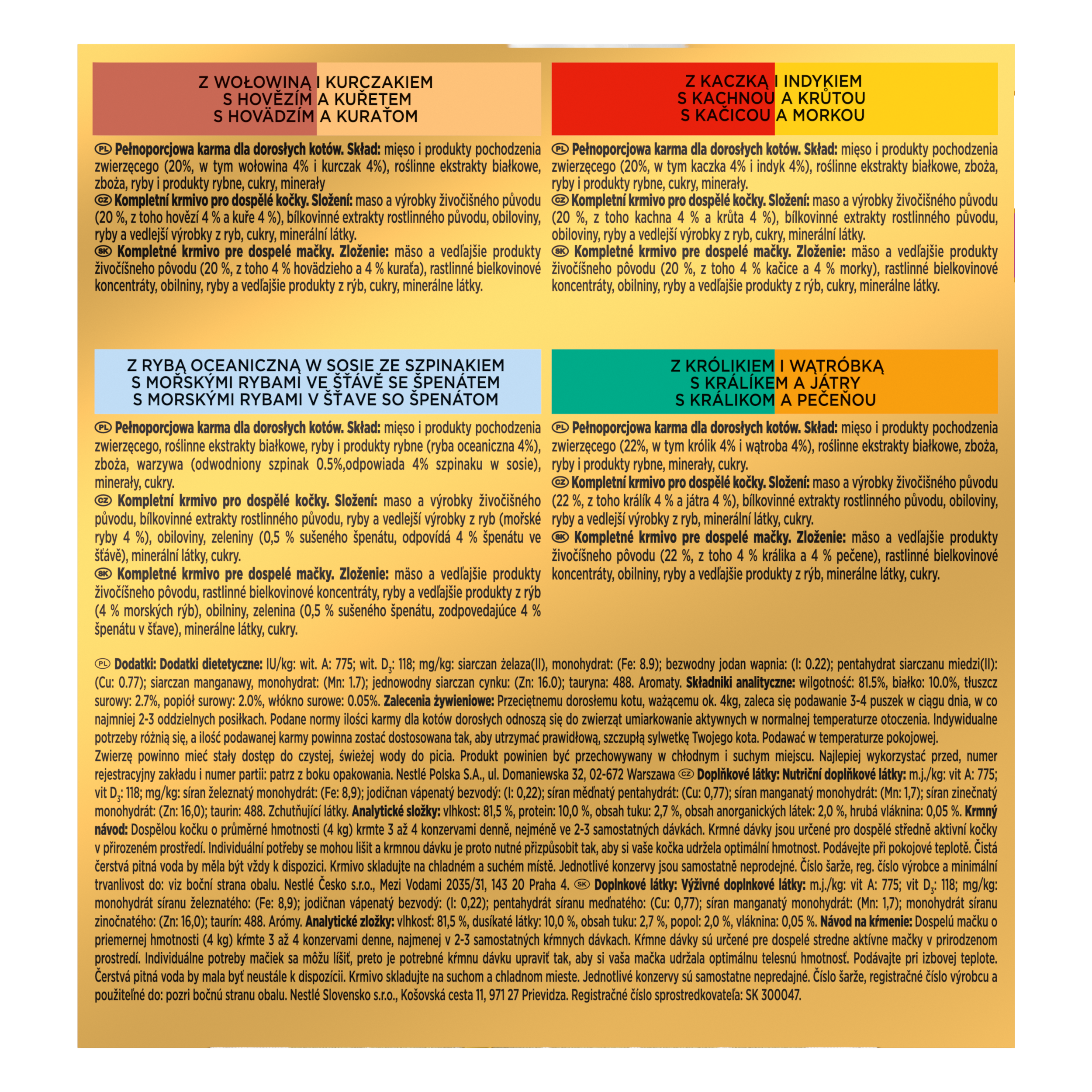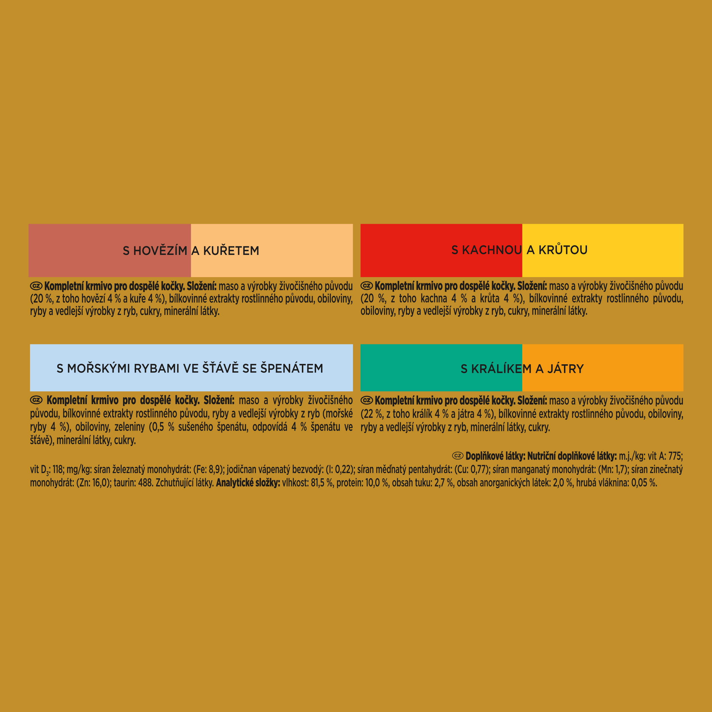 Složení: S hovězím a kuřetem: maso a výrobky živočišného původu (20 % z toho hovězí 4 % a kuře 4 %), bílkovinné extrakty rostlinného původu, obiloviny, ryby a vedlejší výrobky z ryb, cukry, minerální látky. S kachnou a krůtou: maso a výrobky živočišného původu (20 % z toho kachna 4 % a krůta 4 %), bílkovinné extrakty rostlinného původu, obiloviny, ryby a vedlejší výrobky z ryb, cukry, minerální látky. S mořskými rybami ve šťávě se špenátem: maso a výrobky živočišného původu, bílkovinné extrakty rostlinného původu, ryby a vedlejší výrobky z ryb (mořské ryby 4 %), obiloviny, zeleniny (0,5 % sušeného špenátu, odpovídá 4 % špenátu ve šťávě), minerální látky, cukry. S králíkem a játry: maso a výrobky živočišného původu (22 % z toho králík 4 % a játra 4 %), bílkovinné extrakty rostlinného původu, obiloviny, ryby a vedlejší výrobky z ryb, minerální látky, cukry.