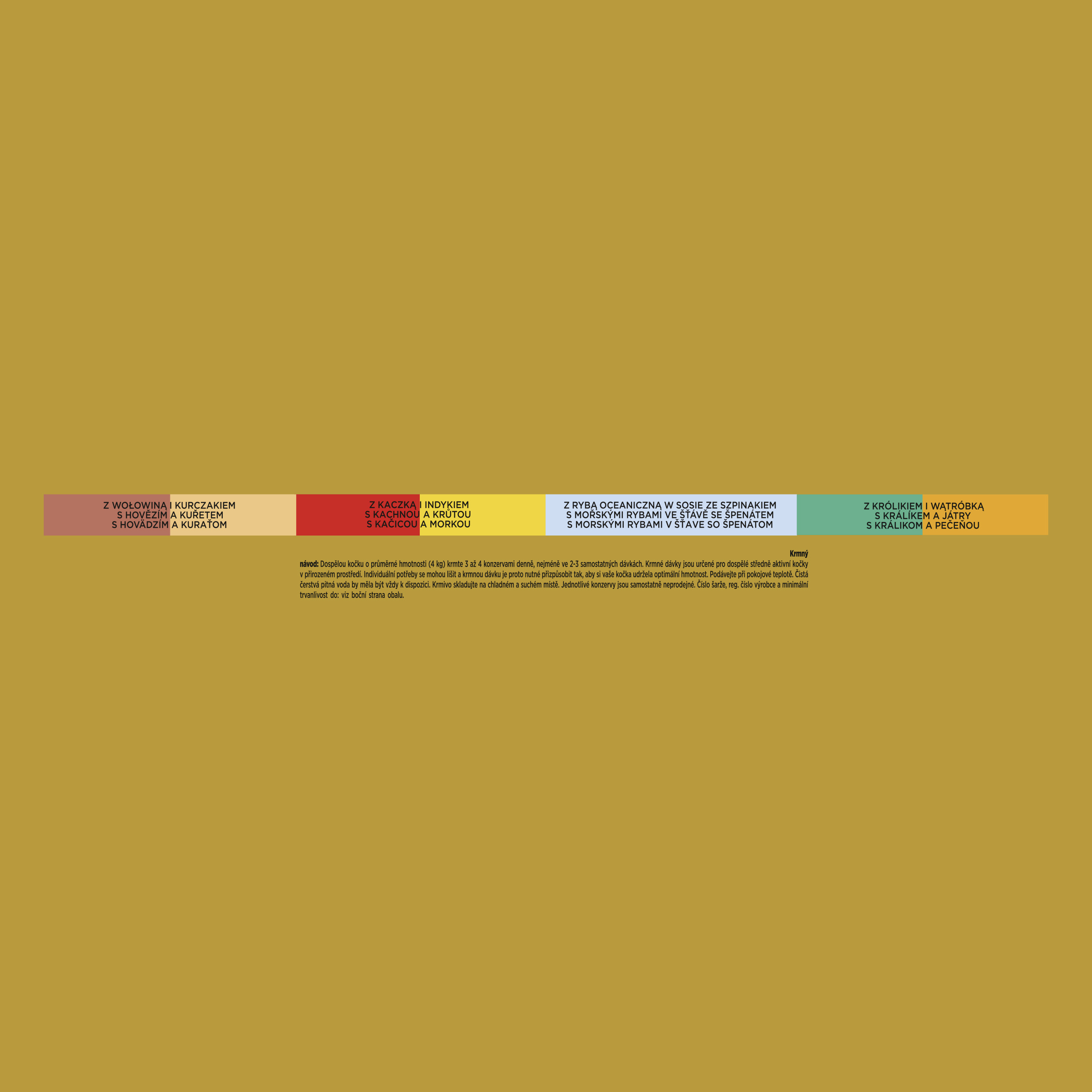 Krmný návod: Dospělou kočku o průměrné hmotnosti (4 kg) krmte 3 - 4 konzervami denně, nejméně ve 2 - 3 samostatných dávkách. Krmné dávky jsou určené pro dospělé středně aktivní kočky v přirozeném prostředí. Individuální potřeby se mohou lišit a krmnou dávku je proto nutné přizpůsobit tak, aby si vaše kočka udržela optimální hmotnost. Podávejte při pokojové teplotě. Čistá čerstvá pitná voda by měla být vždy k dispozici.