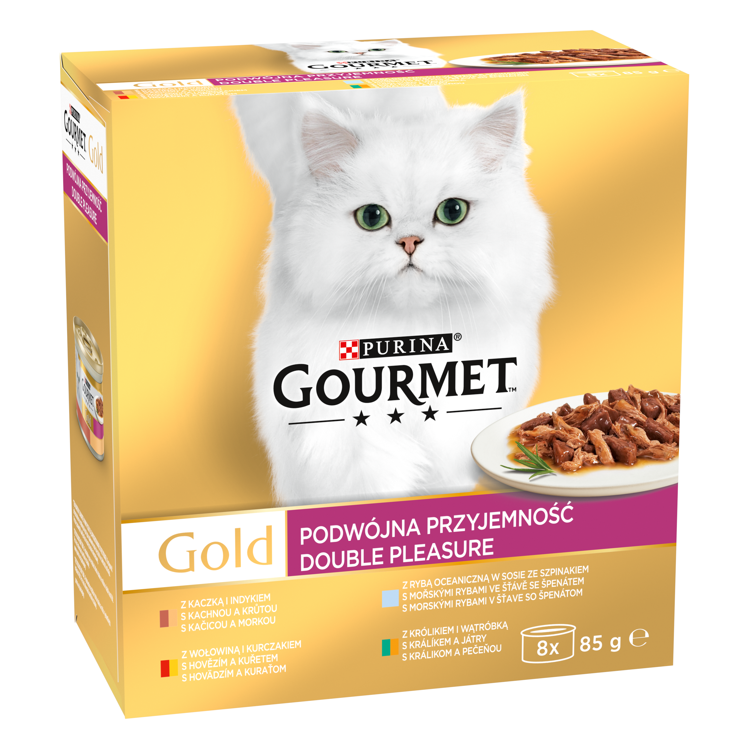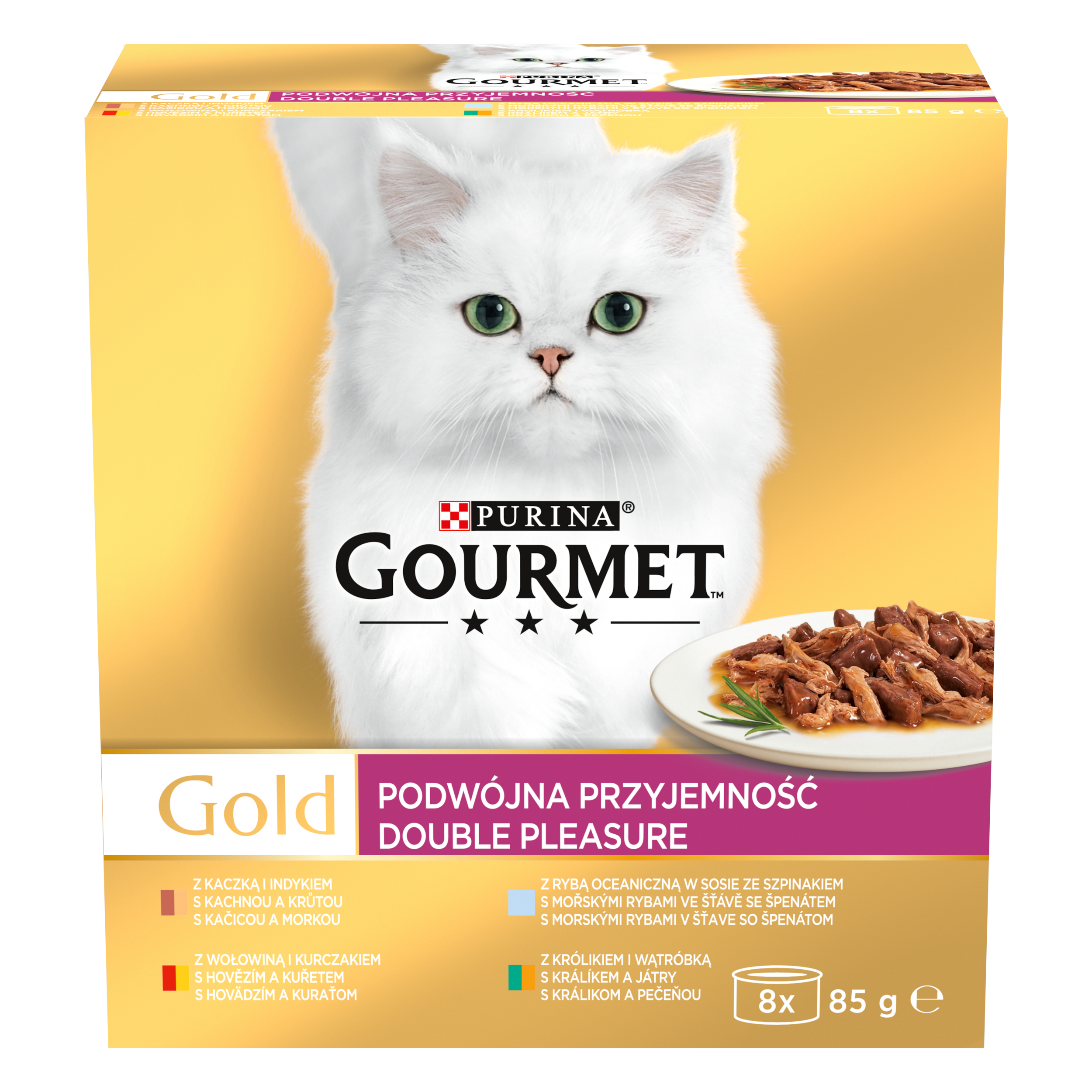 GOURMET GOLD Double Pleasure s hovězím a kuřetem, s kachnou a krůtou, s mořskými rybami ve šťávě se špenátem, s králíkem a játry
