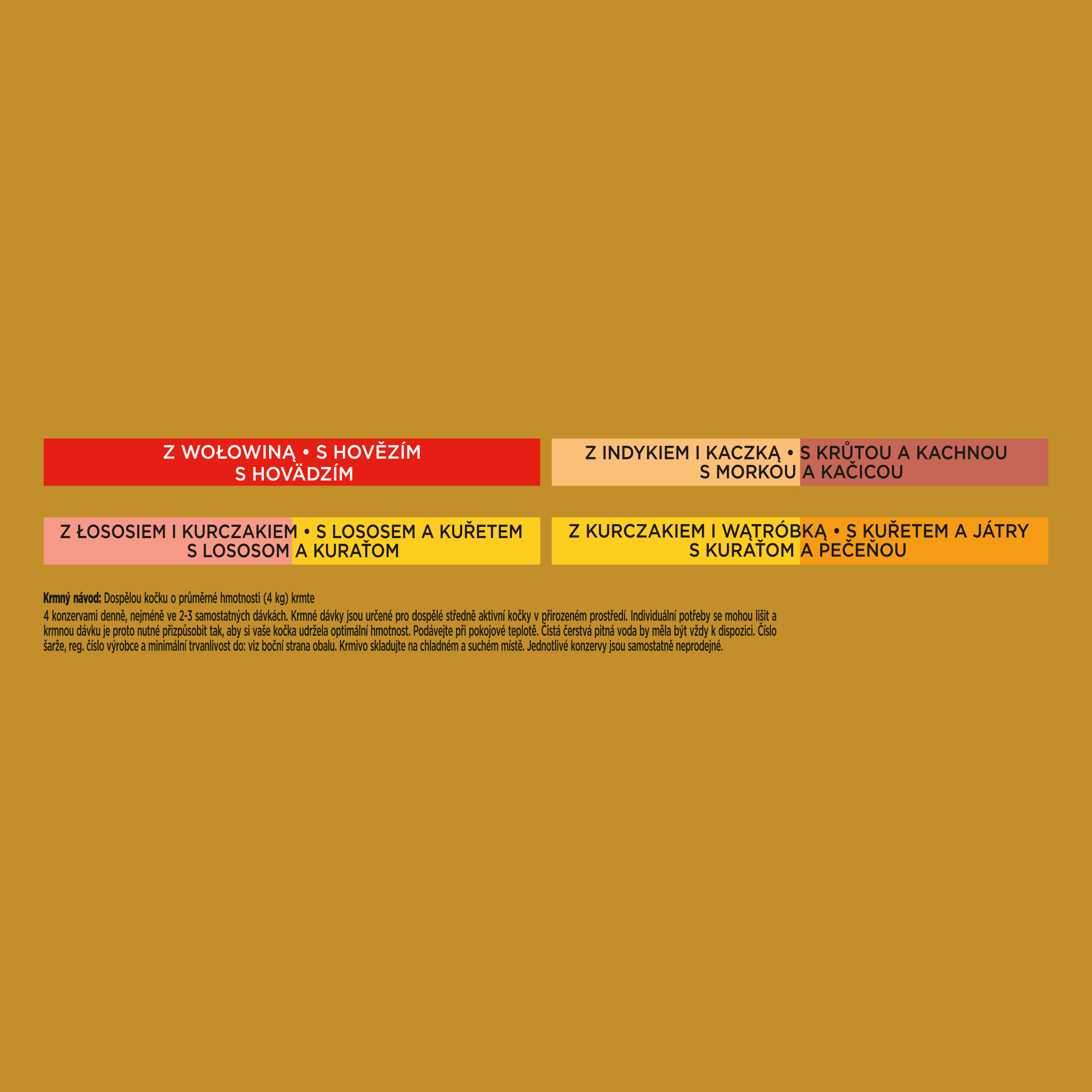 Složení: S hovězím: maso a výrobky živočišného původu (25 % z toho hovězí 4 %), obiloviny, minerální látky, cukry. S krůtou a kachnou: maso a výrobky živočišného původu (26 % z toho krůta 4 % a kachna 4 %), obiloviny, minerální látky, cukry. S lososem a kuřetem: maso a výrobky živočišného původu (21 % z toho kuře 4 %), obiloviny, ryby a vedlejší výrobky z ryb (losos 4 %), minerální látky, cukry. S kuřetem a játry: maso a výrobky živočišného původu (26 % z toho kuře 4 % a játra 4 %), obiloviny, minerální látky, cukry.