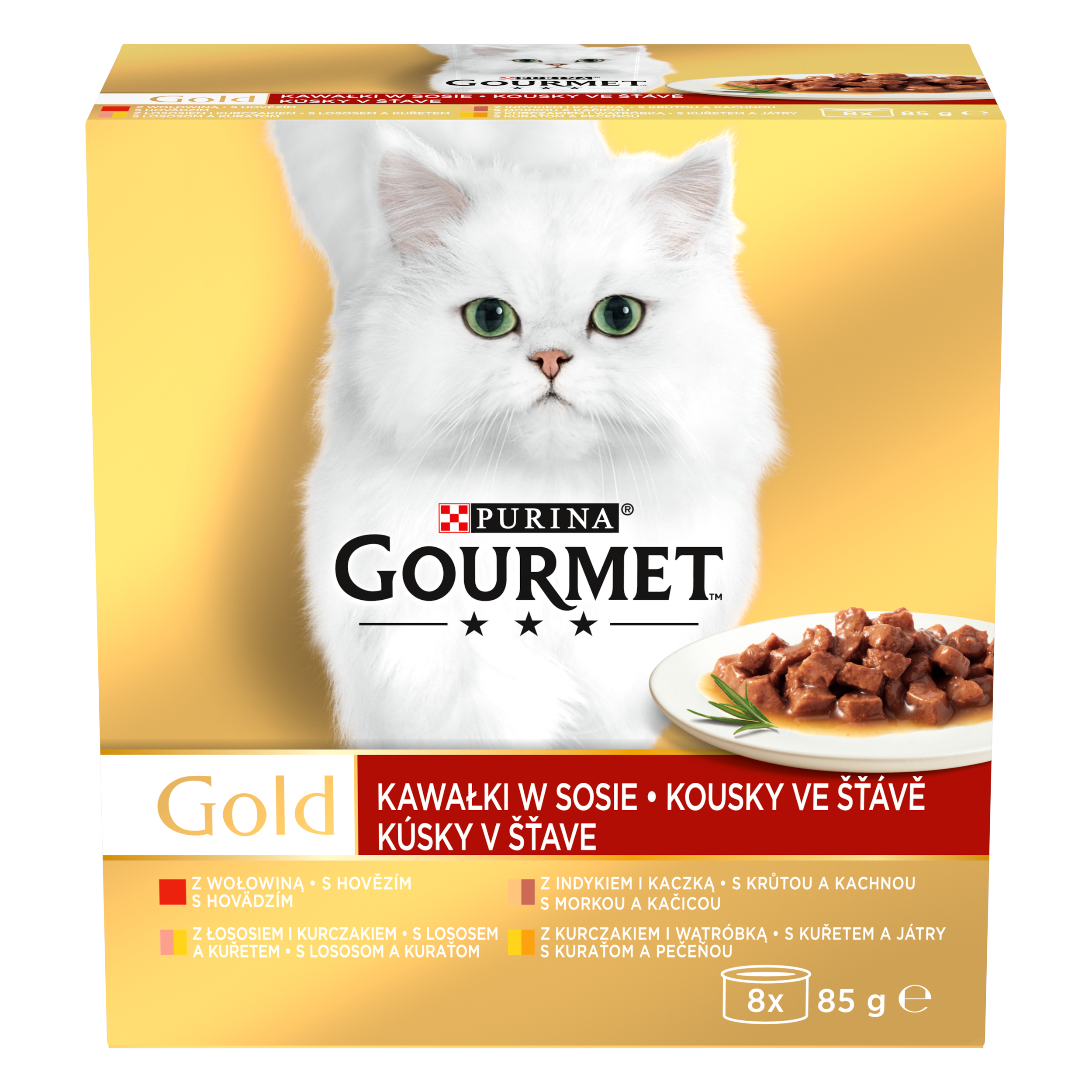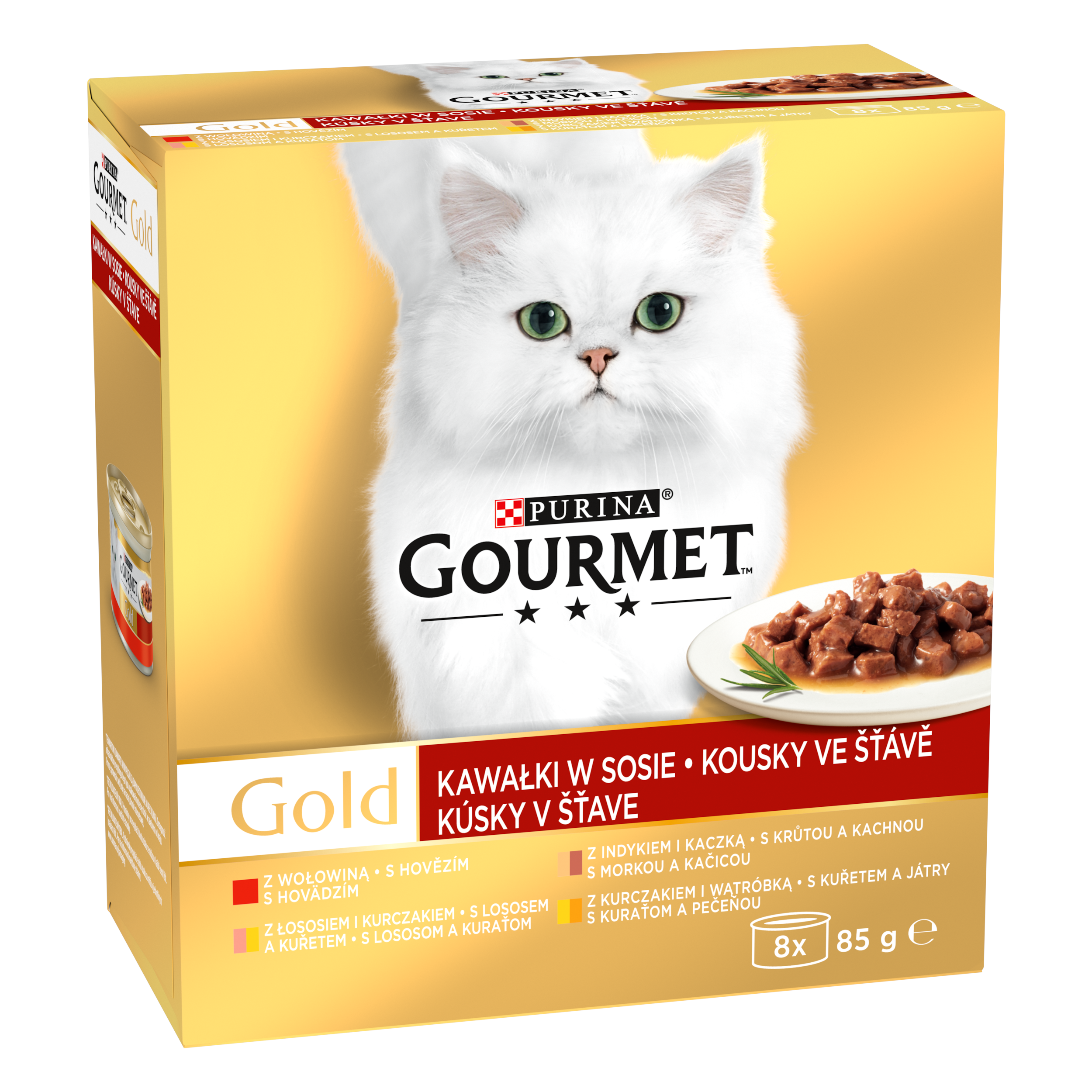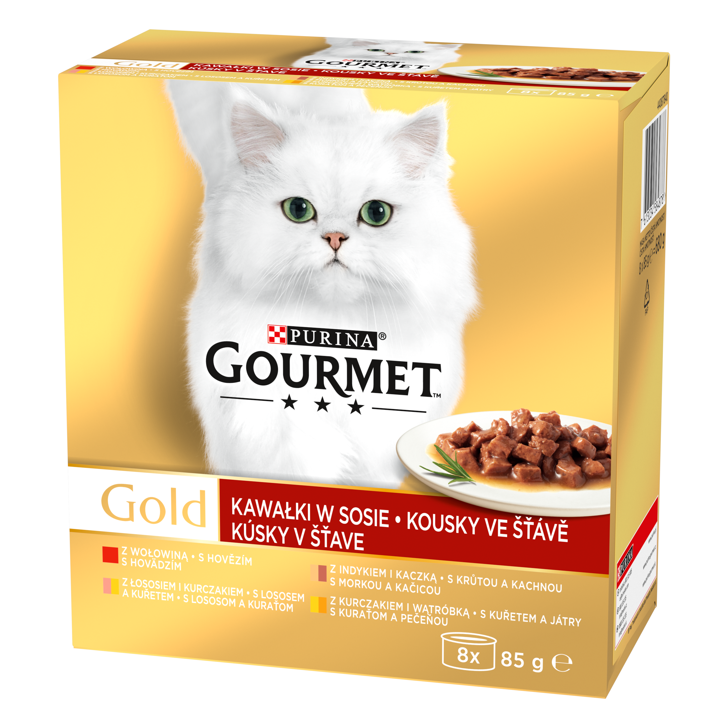 GOURMET Gold kousky ve šťávě jsou jemné kousky s hovězím, kuřecím, lososem a dalšími vynikajícími příchutěmi, jemně povařené k dokonalosti a obklopené lahodnou šťávou tak, aby vaší kočce nabídly potěšení z báječné a plné chuti. Všechna krmiva GOURMET Gold jsou vyrobena z vysoce kvalitních surovin a jsou bez přidaných barviv a umělých konzervantů.