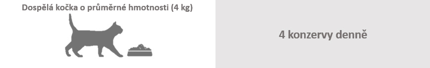 Krmný návod: Dospělou kočku o průměrné hmotnosti (4 kg) krmte 4 konzervami denně, nejméně ve 2 - 3 samostatných dávkách. Krmné dávky jsou určené pro dospělé středně aktivní kočky v přirozeném prostředí. Individuální potřeby se mohou lišit a krmnou dávku je proto nutné přizpůsobit tak, aby si vaše kočka udržela optimální hmotnost. Podávejte při pokojové teplotě.
