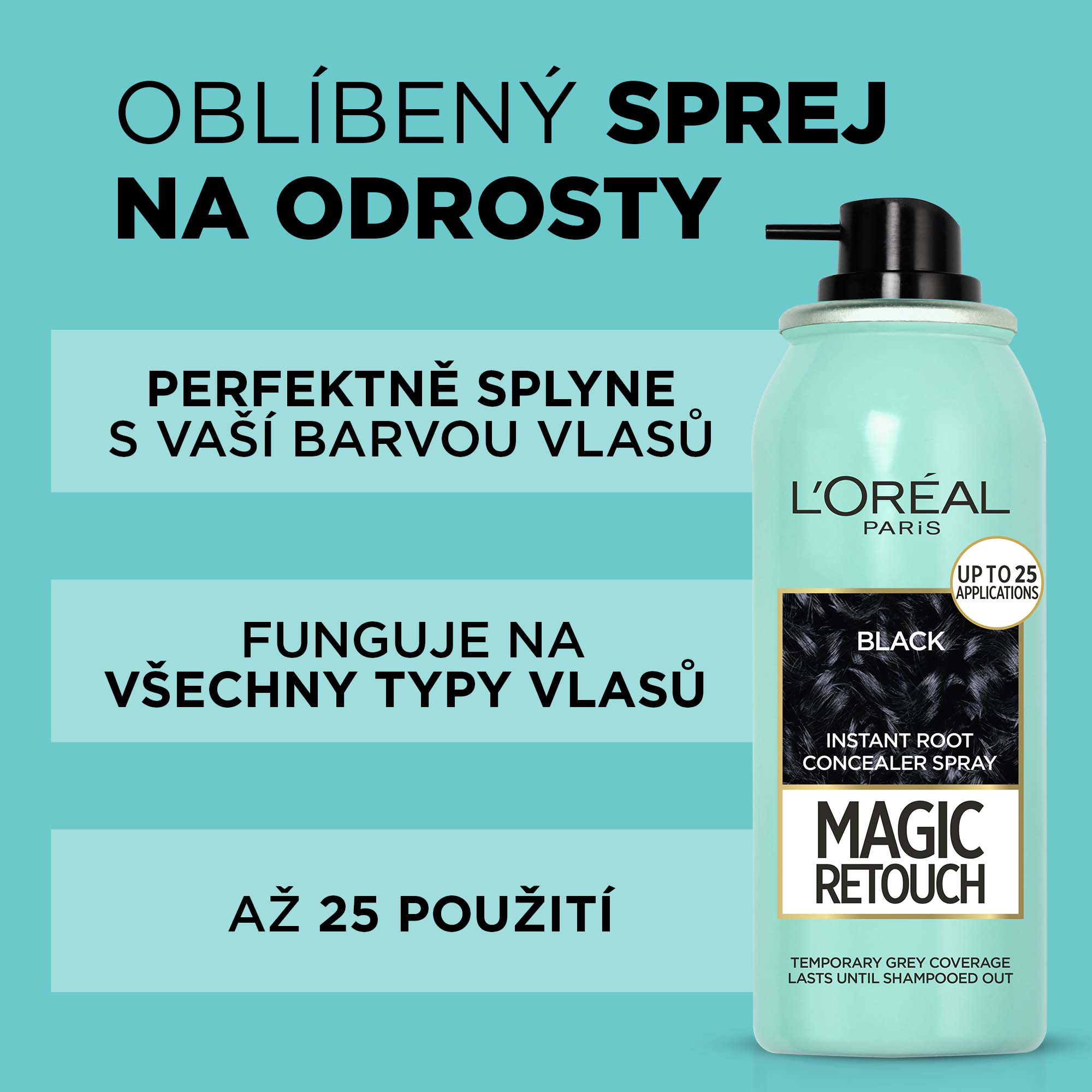 Sprej na vlasy pro okamžité zakrytí odrostů L’Oréal Paris Magic Retouch je dočasný barevný sprej v několika přírodních odstínech, který v jediném kroku překryje šedivé či barevné odrosty. Tajemstvím spreje je barevný pigment, který dokonale přilne k vlasu a bezpečně vydrží až do dalšího umytí vlasů šamponem. Díky spreji L’Oréal Paris Magic Retouch dosáhnete okamžitého překrytí šedin za několik málo vteřin. Po aplikaci zjemňuje Magic Retouch barevný přechod vlasů a k vlasu dokonale přilne. Zároveň rychle zasychá a dodává vlasům jemnou texturu.