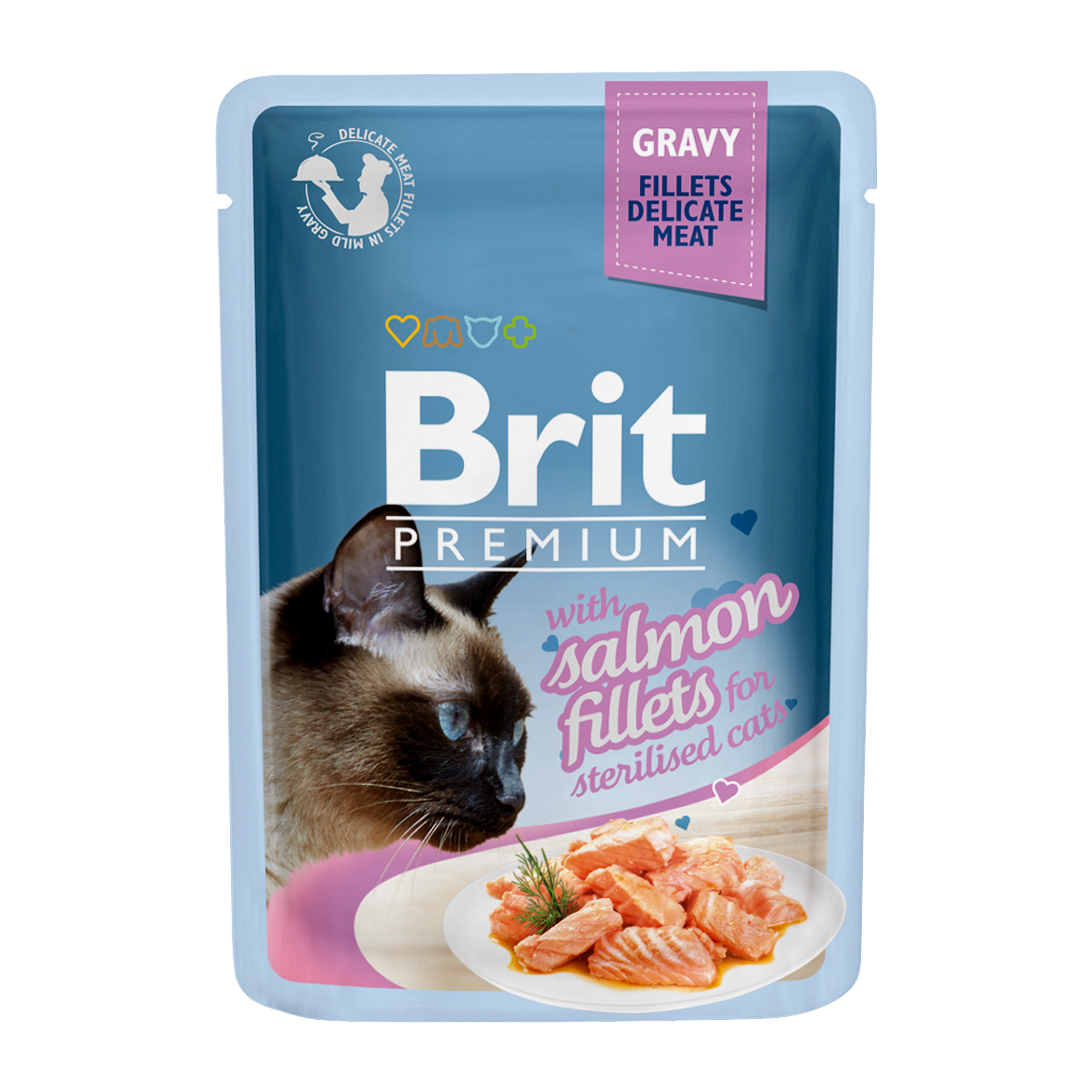 Brit Premium filety s lososem ve šťávě. Ideální pro kastrované kočky, bez umělých aromat a konzervantů. Obsah masa 74 %.