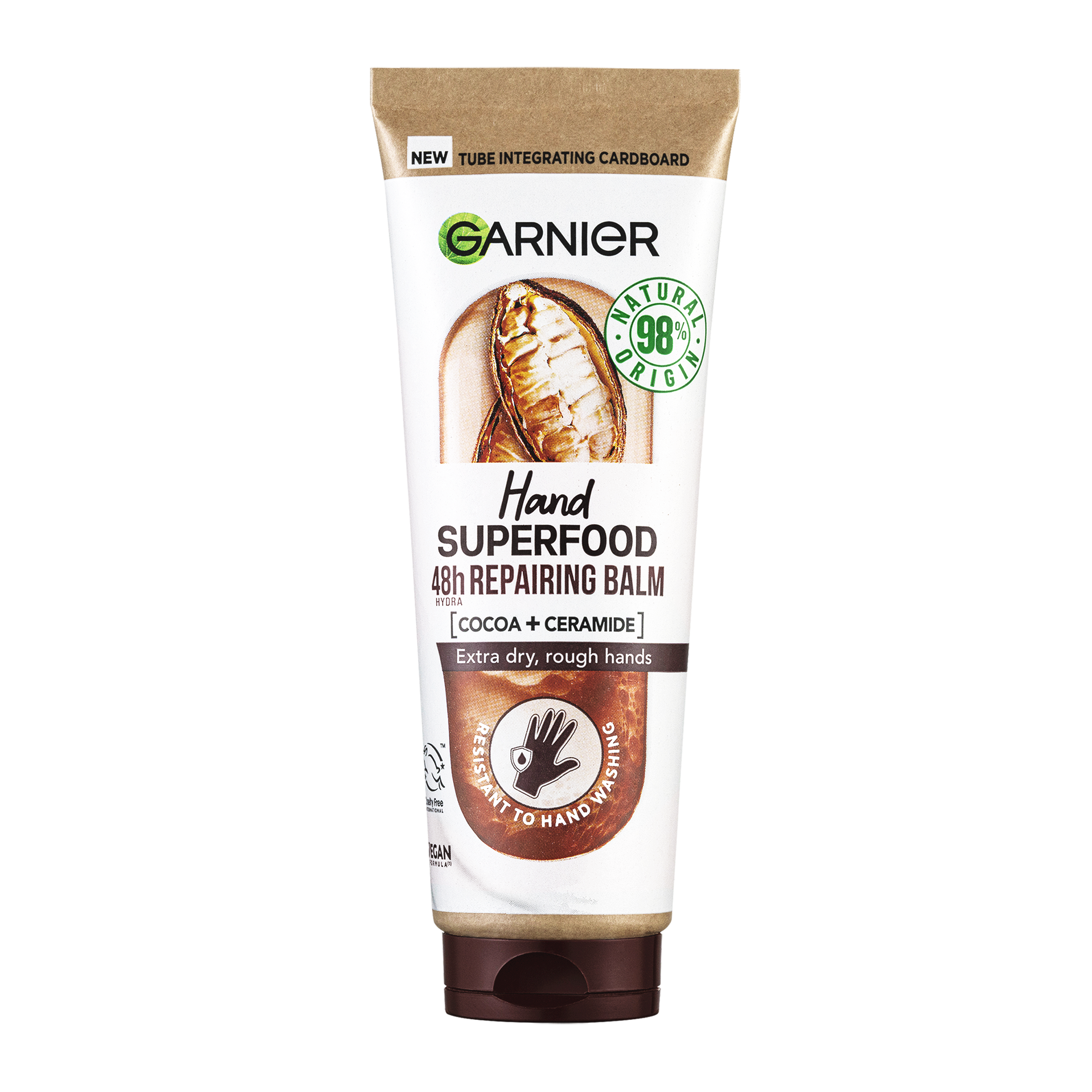 Superfood regenerační krém na ruce s kakaem a ceramidem. Bez složek živočišného původu nebo odvozených vedlejších produktů. Pro velmi suché, namáhané ruce.