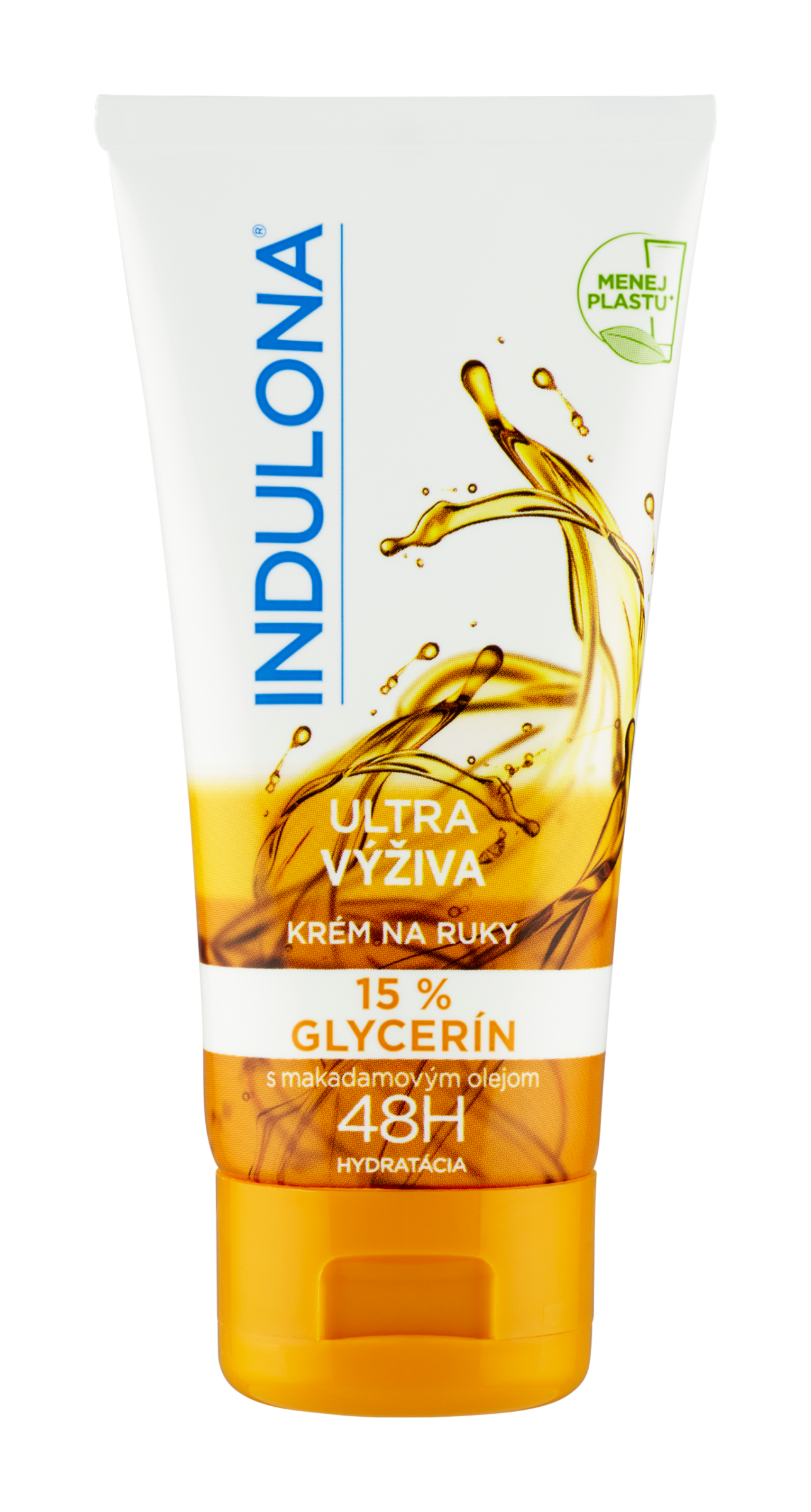 Indulona Krém na ruce ultra výživa je obohacený o 15 % glycerinu, efektivní hydratační látky, která podporuje zdravý vzhled pokožky. Glycerin udržuje v pokožce přirozenou úroveň hydratace a chrání suchou pokožku před vnějšími vlivy. Makadamový olej, bohatý na vitamin E, pomáhá vyživovat suchou pokožku. Krém je vhodný pro suché ruce, poskytuje intenzivní hydrataci a výživu a zanechává pokožku rukou jemnou a vláčnou. O 13,7 % méně plastu ve srovnání s předchozím obalem (bez víčka).