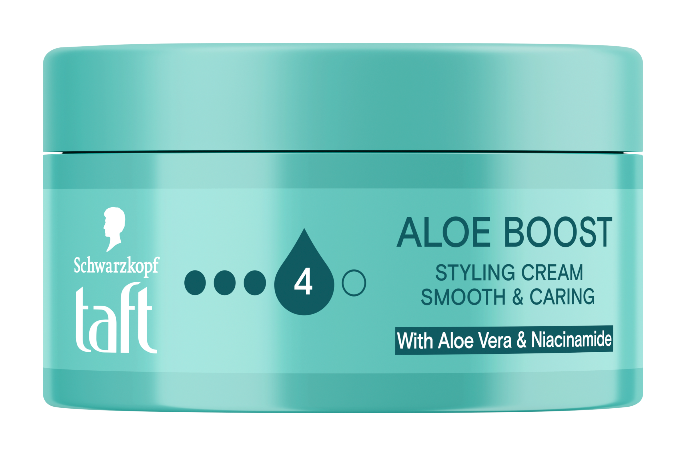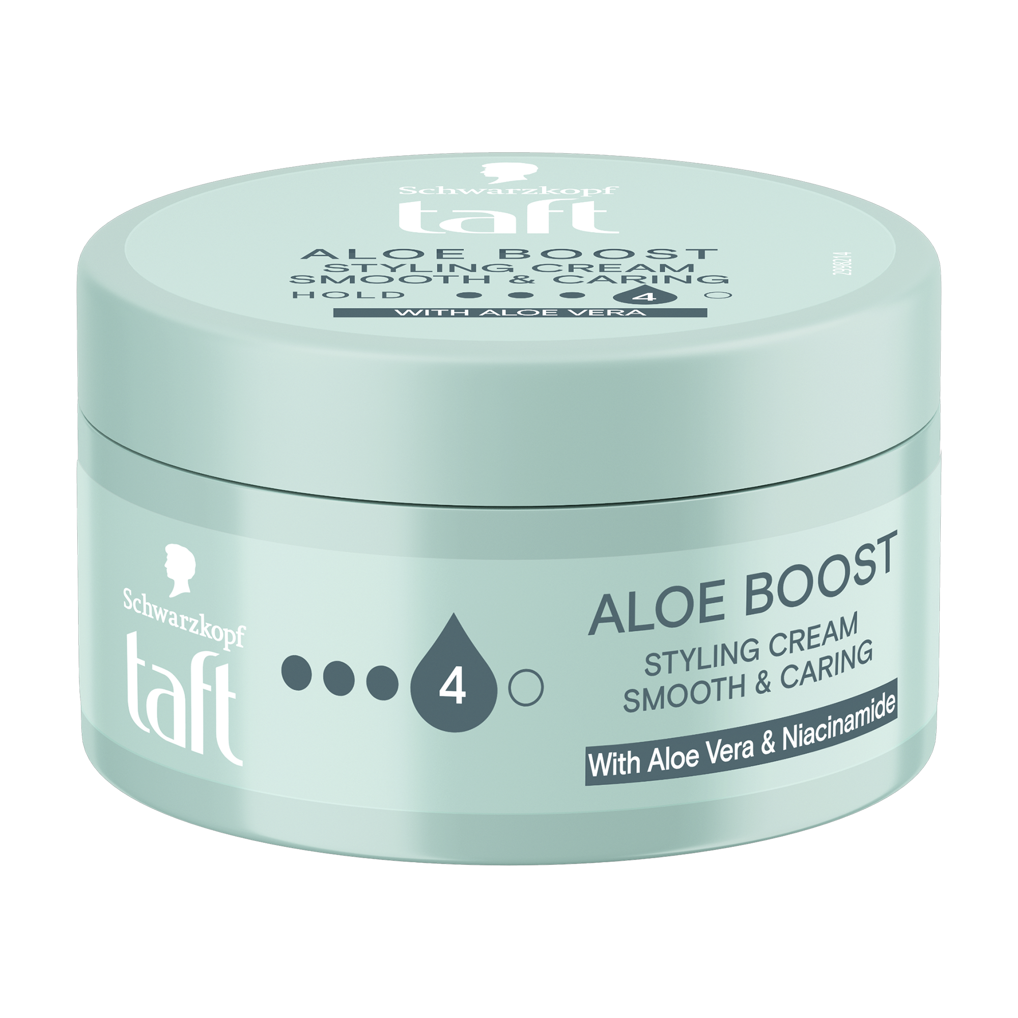 Stylingový krém s hydratačním komplexem Aloe Vera a posilujícím niacinamidem. Hladká textura pro přirozený vzhled a dlouhotrvající fixaci. Lehká receptura. Inovativní lehké složení Schwarzkopf Taft Aloe Boost dodává vlasům sílu a péči pro dlouhotrvající fixaci a hladkou texturu s přirozeným vzhledem. Tento krém obsahuje aloe vera pro hydrataci vlasů a niacinamid pro jejich posílení. Složení je veganské a schválené organizací PETA*.