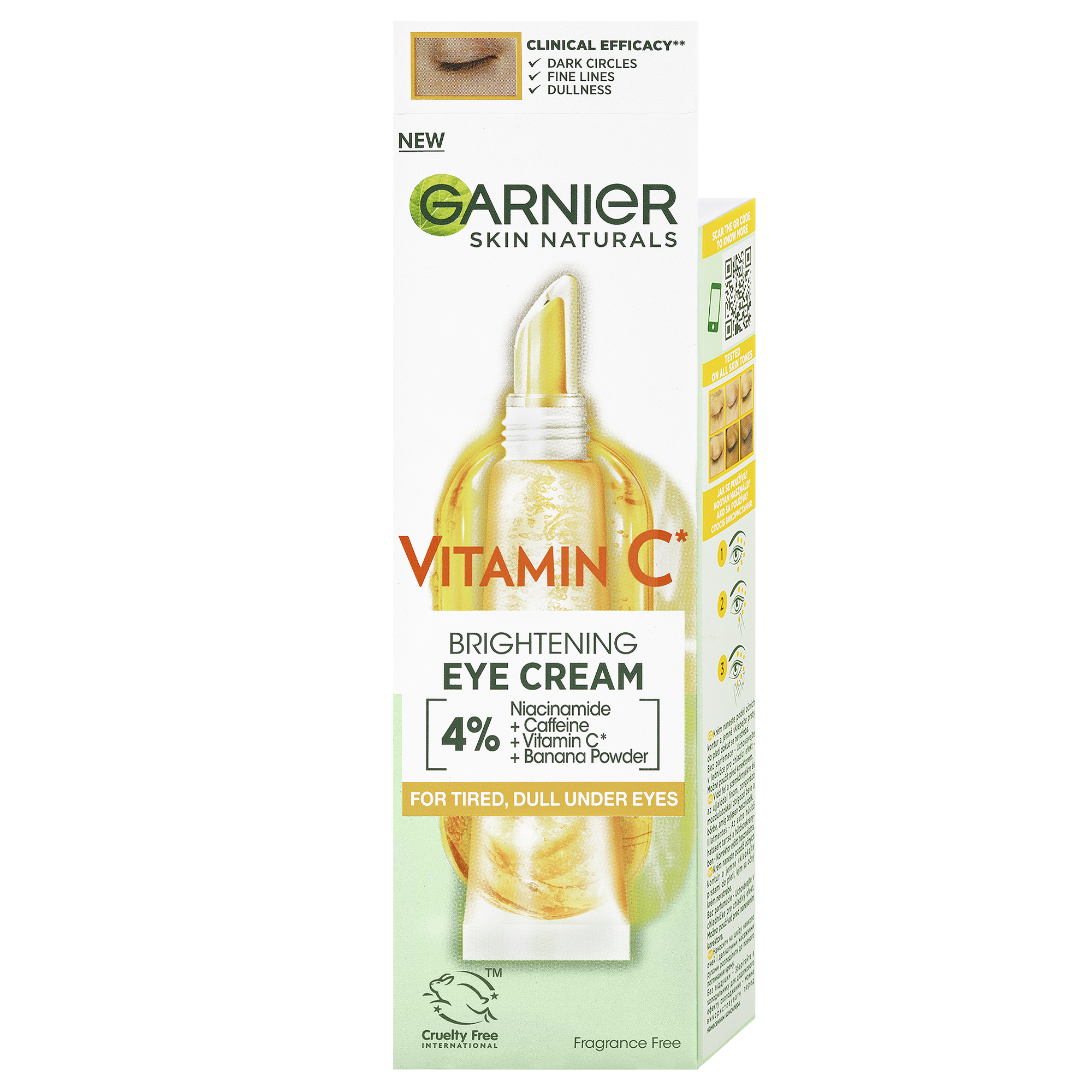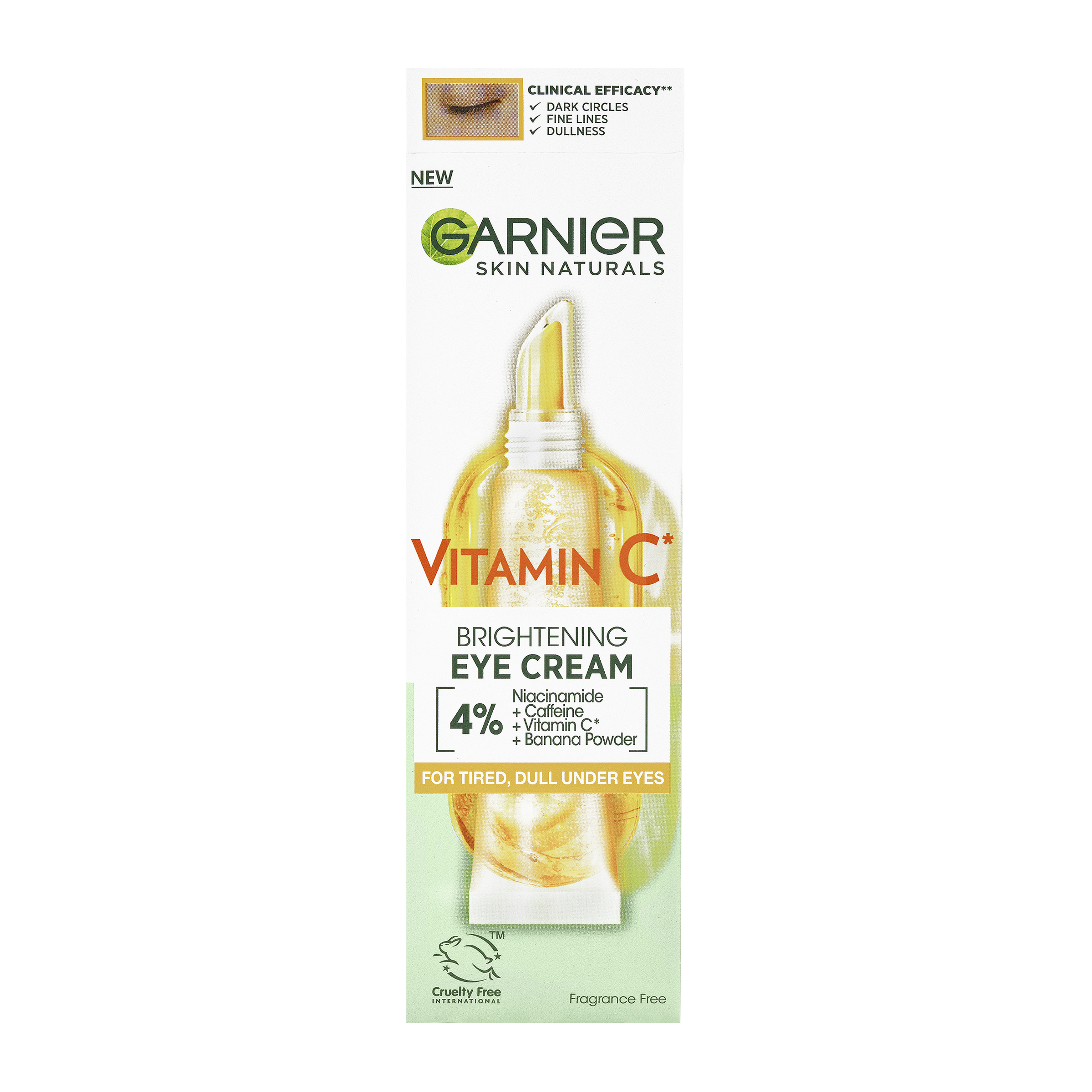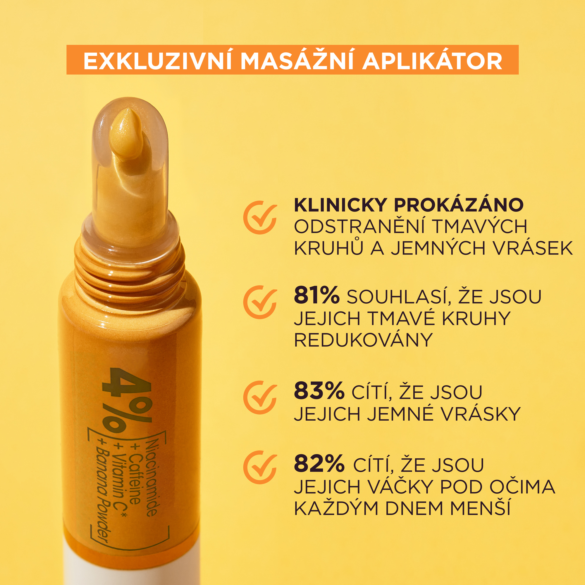Rozjasňující oční krém s vitaminem C*. Krém s obsahem 4% koncentrace směsi vitaminu C*, niacinamidu, kofeinu a extraktu z banánu redukuje známky únavy, tmavé kruhy pod očima a jemné vrásky.