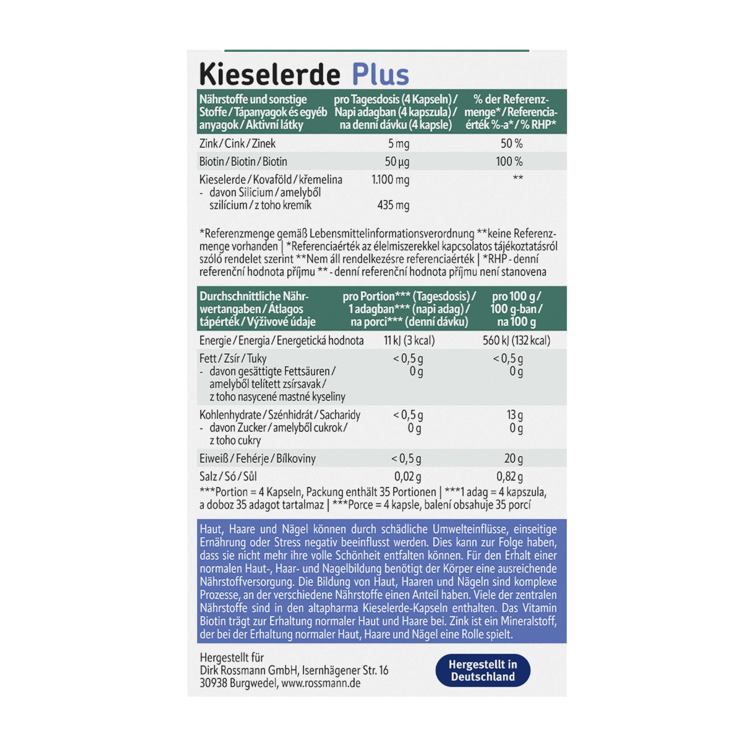 Vitamin biotin přispívá k udržení normálního stavu pokožky a vlasů. Zinek je minerál, který se podílí na udržení normální pokožky, vlasů a nehtů. Vápník přispívá k udržení normálních kostí a zubů. Denní dávka přípravku altapharma Siliceous Earth PLUS navíc poskytuje 900 mg oxidu křemičitého.