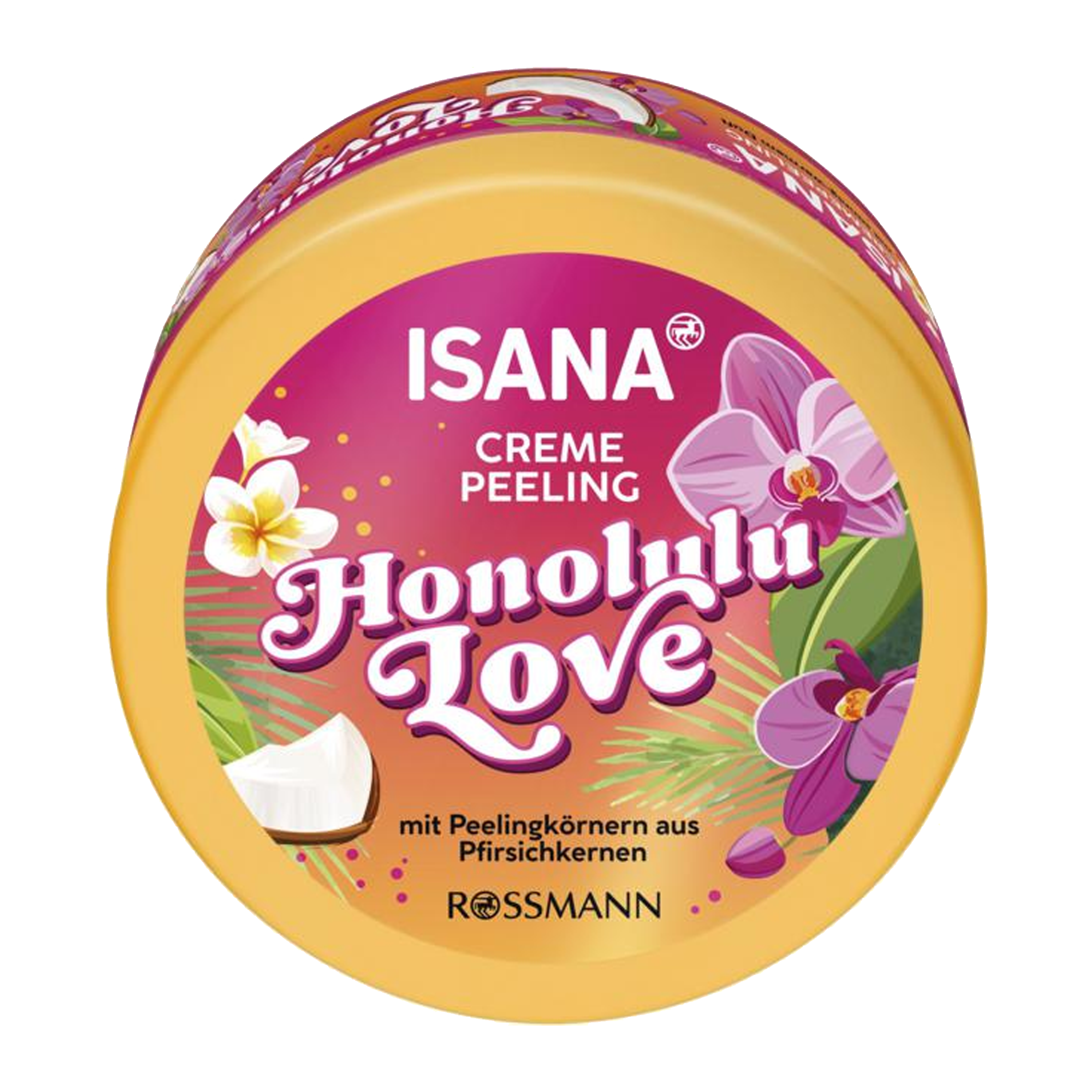 ISANA Krémový peeling Honolulu Love s exotickou vůní kokosu, vanilky a tropických květů jemně odstraňuje přebytečné odumřelé kožní buňky a zanechává vaši pokožku jemnou a opečovanou.