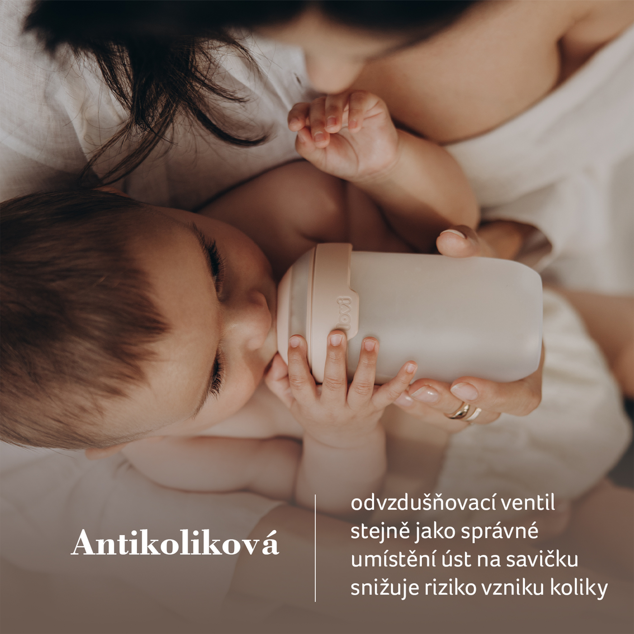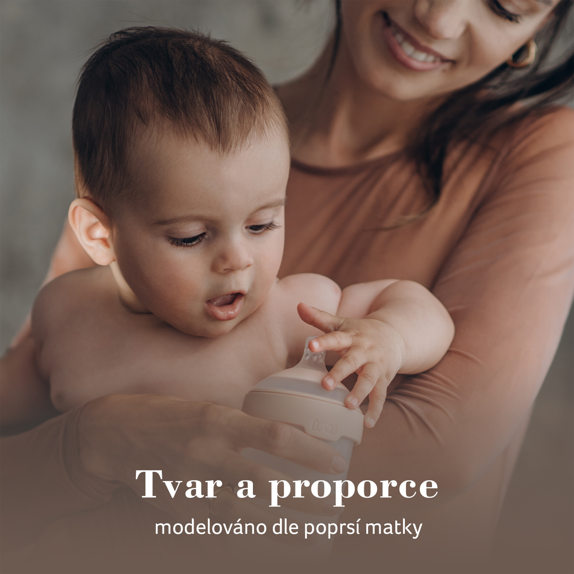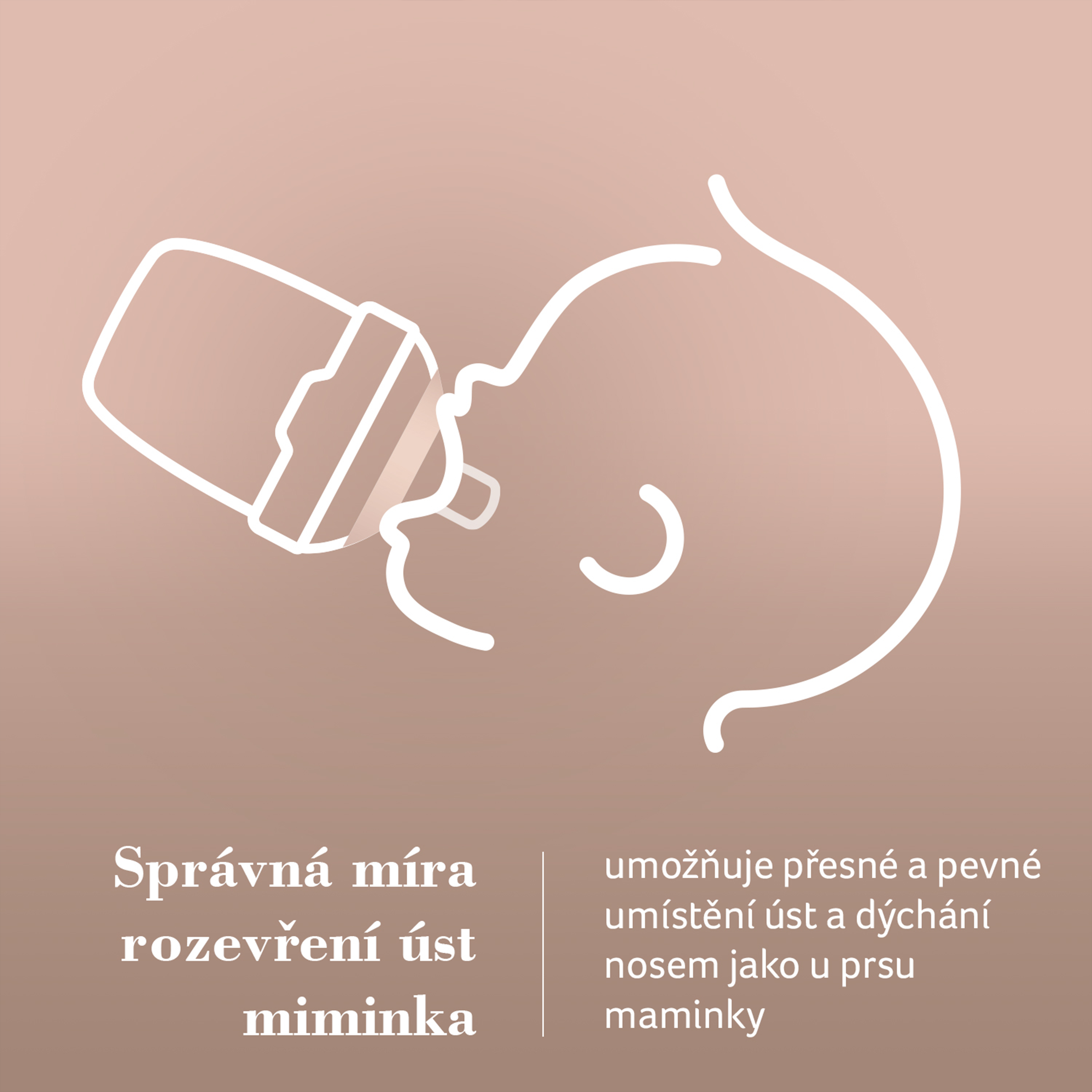 • Tvar a proporce - Široký, profilovaný tvar po vzoru maminčiných prsou a dokonalé proporce zajišťují, že ústa dítěte jsou umístěna ve správném úhlu, rty jsou pevně sevřené a dítě může volně dýchat nosem, což snižuje riziko vzniku koliky.
