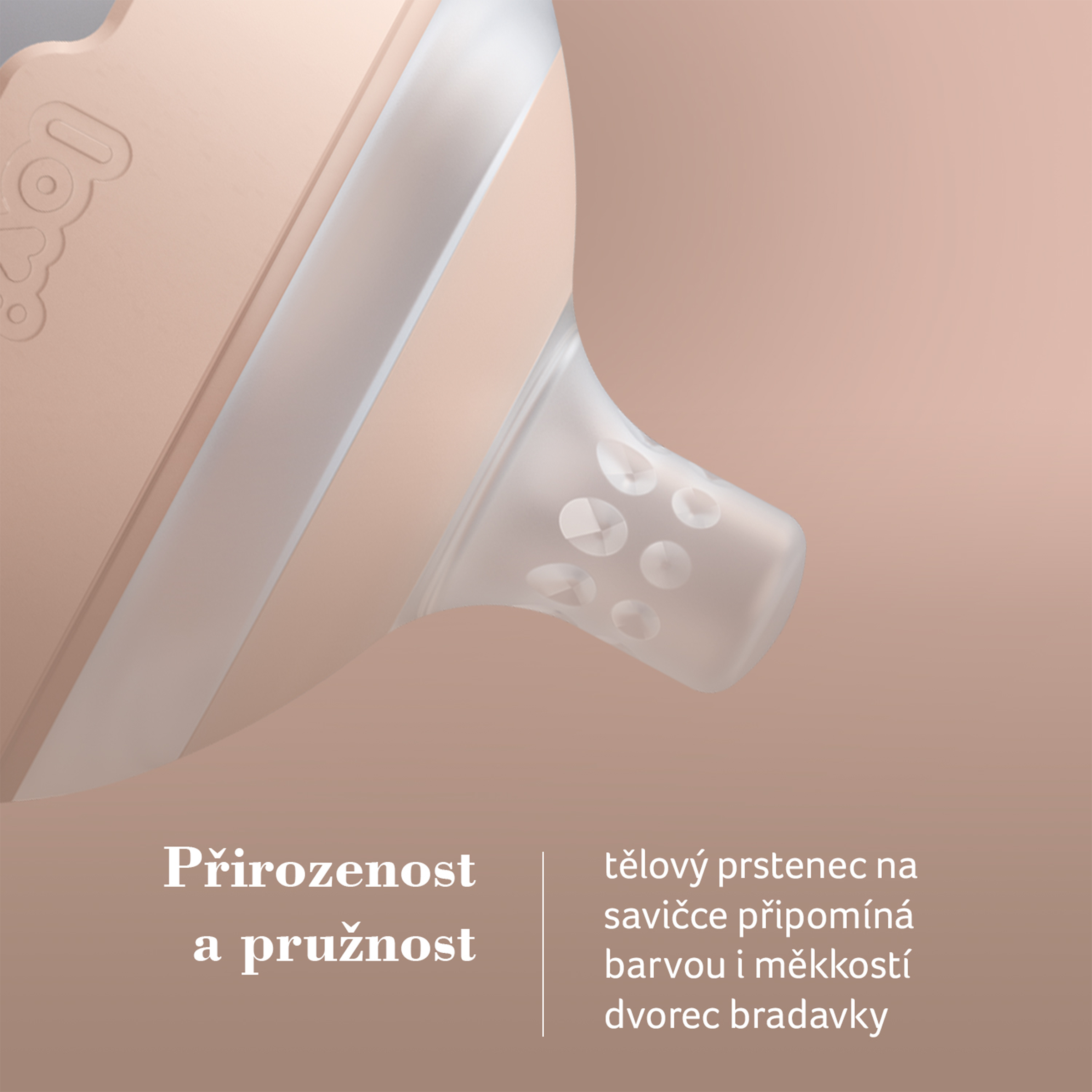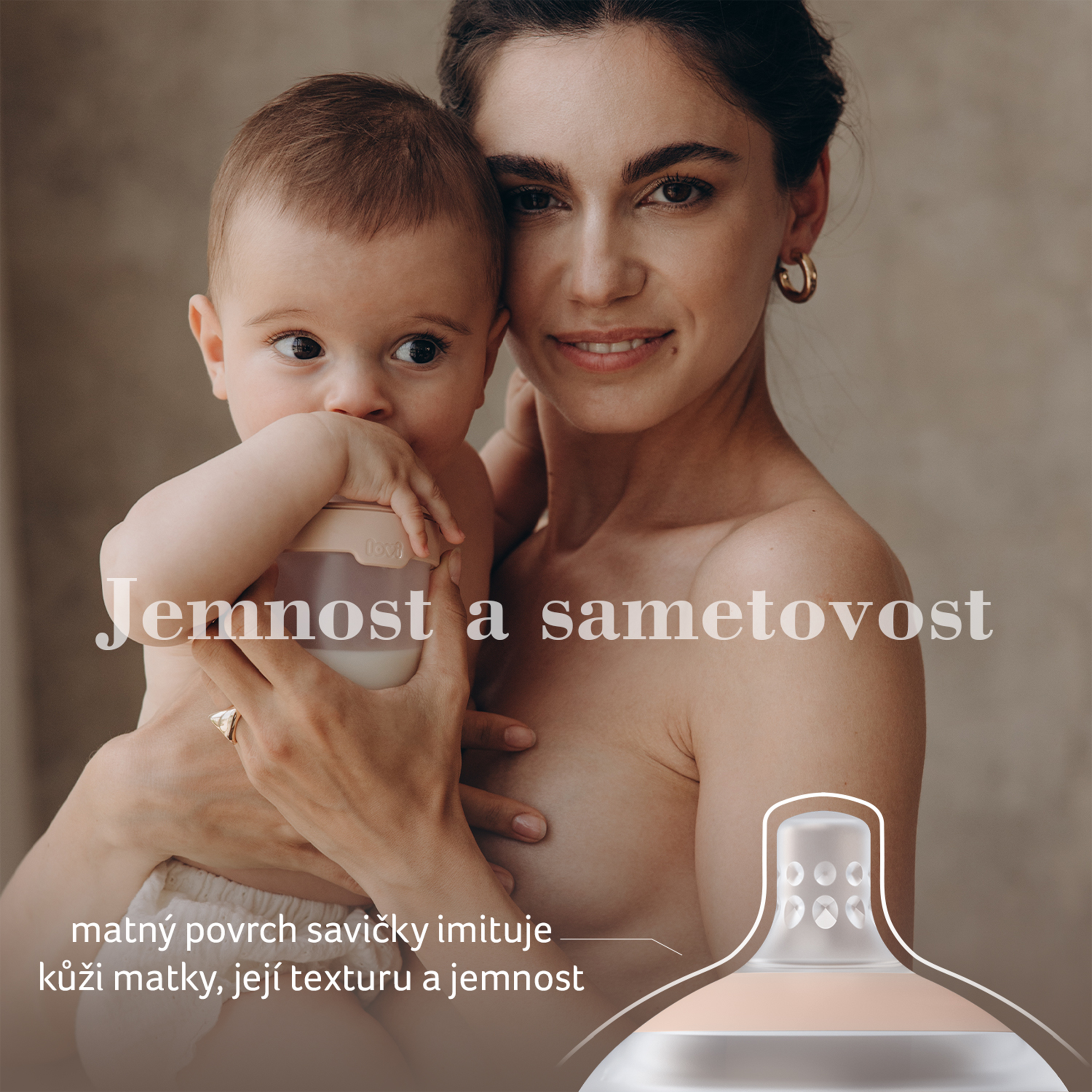 • Jemnost a sametový pocit - matný, jemný povrch savičky napodobuje maminčinu pokožku, její texturu a jemnost.