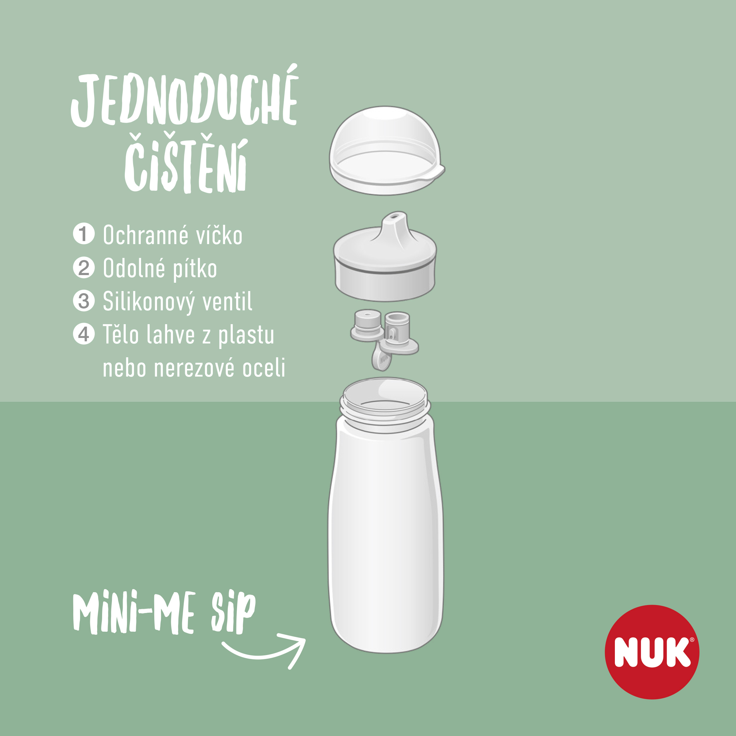 Váš vzhled – Váš životní styl NUK Mini-Me je systém, který roste spolu s dítětem. Vybírat můžete mezi nerezovou ocelí a nerozbitným plastem. Vyberte si z různých velikostí. Zvolte si pevné nebo vyklápěcí pítko. A můžete si sestavit přesně takovou láhev, jakou pro své dítě potřebujete. Láhev je netekoucí a velmi odolná, ať už si vyberete jakýkoliv model. Stvořená pro první dobrodružství a vše, co přijde po nich. Nová láhev NUK Mini-Me reprezentuje vzhled a životní styl, který byste rádi sdíleli se svými dětmi. Poznámky Láhve na pití NUK jsou v souladu s evropskou normou EN14350. Láhve na pití a pítka NUK jsou kompatibilní pouze s příslušnou výrobkovou řadou.
