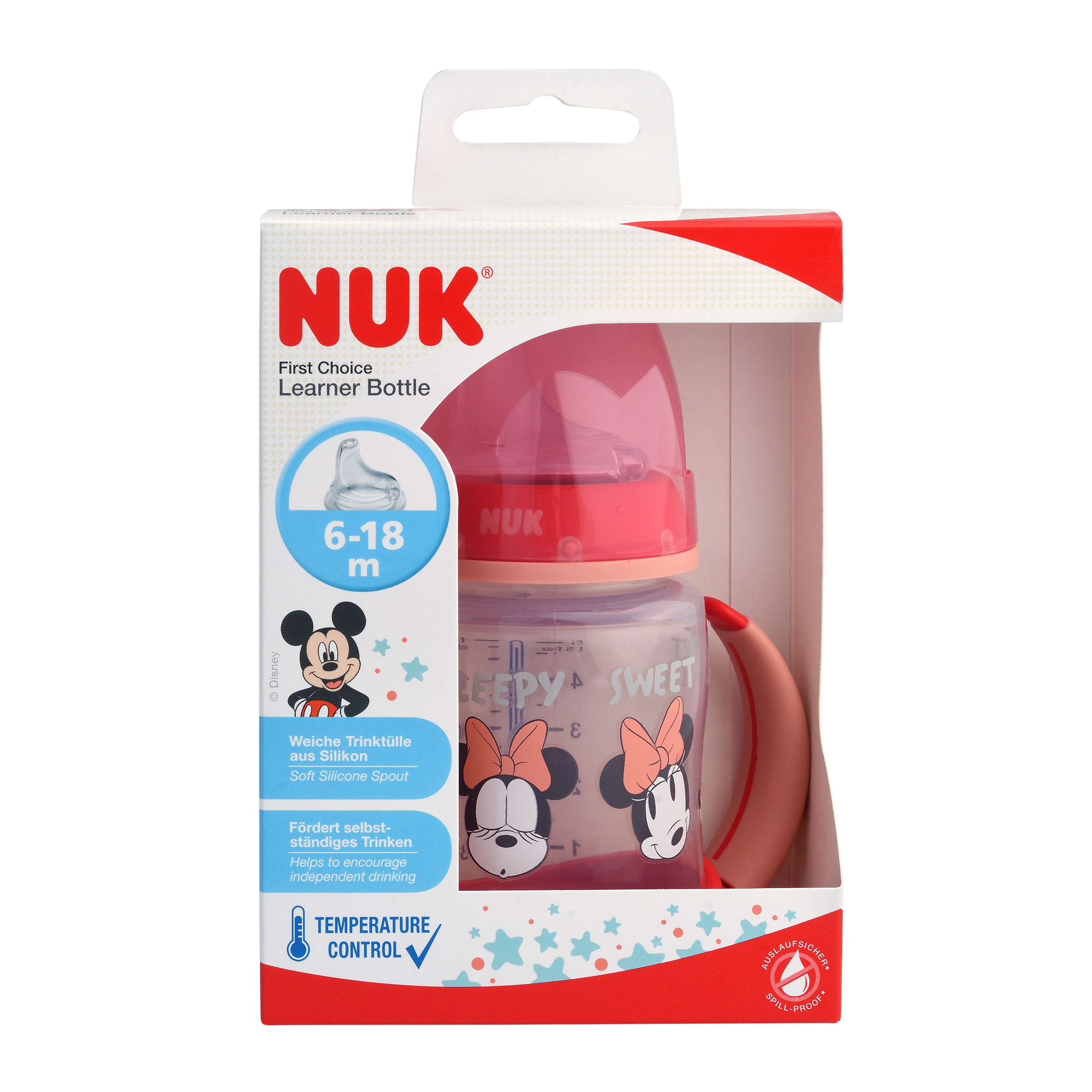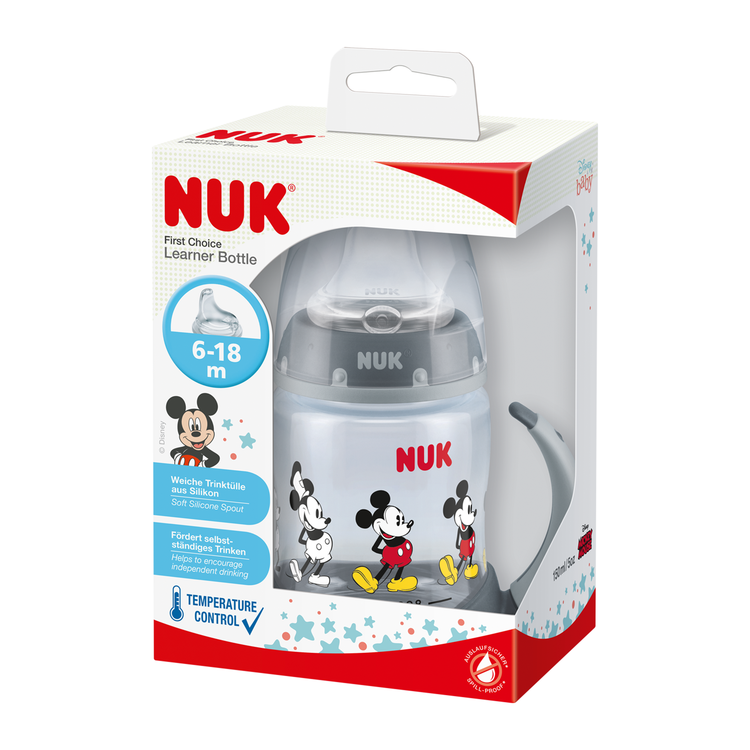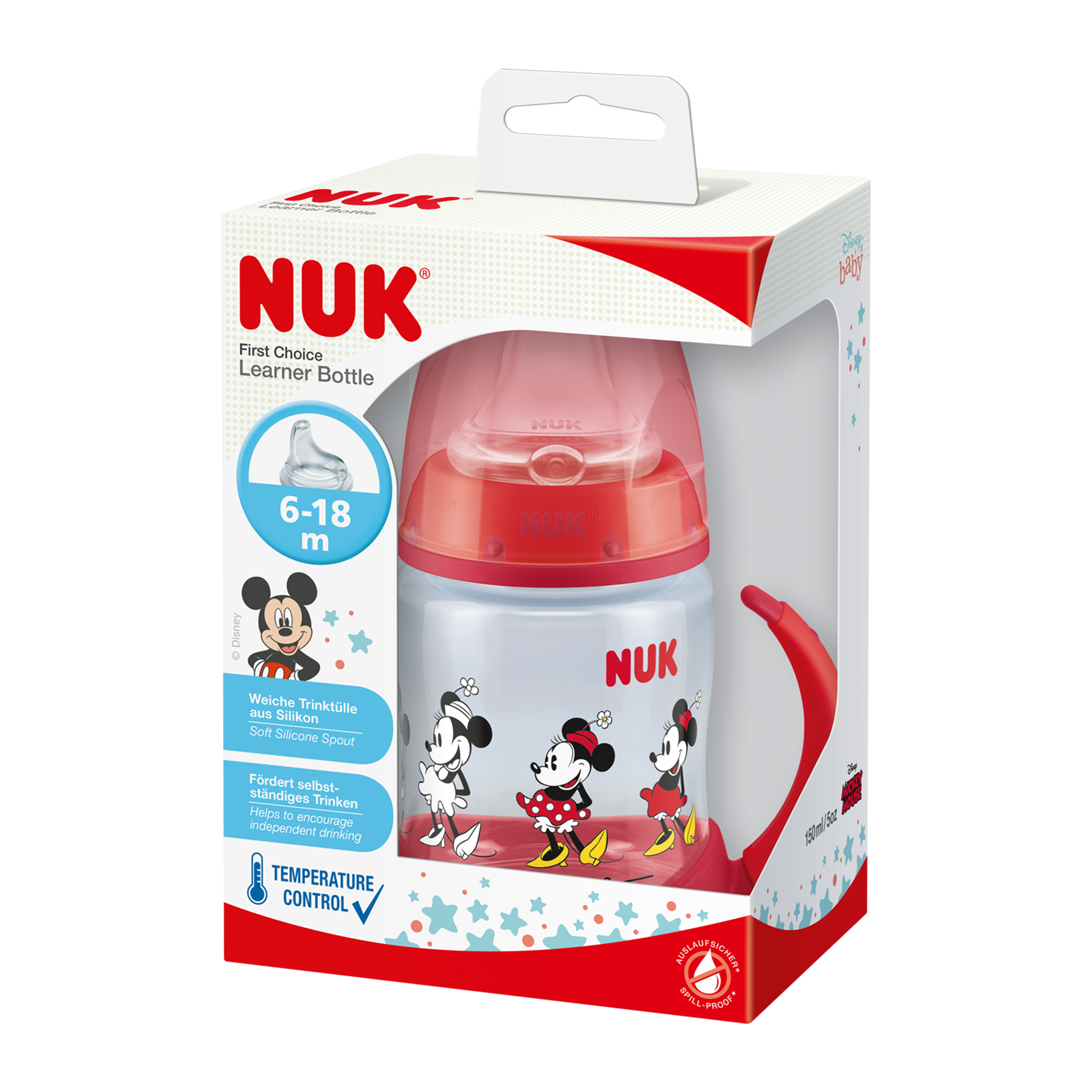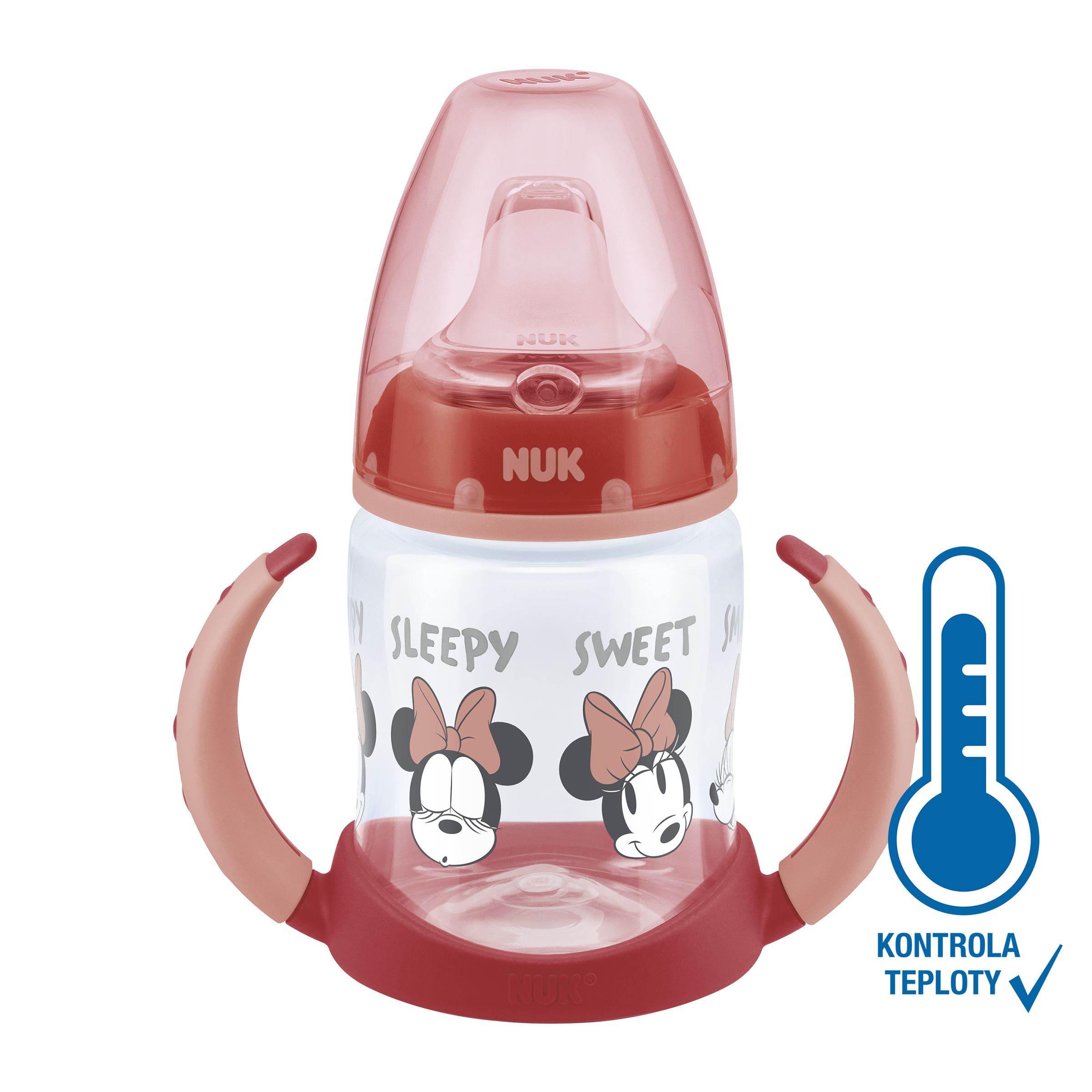 Řada NUK s oblíbenými Disney postavičkami Mickey Mouse a Minnie Naše dětské lahvičky na učení s Mickey Mousem a Minnie pomáhají dětem naučit se samostatně pít. Klasické moderní vzory zdobí dětské lahvičky na učení NUK a potěší malé i velké fanoušky Disneyho pohádek. Ponořte se do jedinečného světa Mickeyho a Minnie! Dětská lahvička na učení NUK First Choice s kontrolou teploty To je dobrý pocit! Když nastane shon a zmatek, je dobré vědět, že nejste na všechno sama. Když se z miminka stane batole, dětská lahvička NUK First Choice s kontrolou teploty pomůže bezproblémovému přechodu k samostatnému pití. Dětská lahvička na učení NUK First Choice s kontrolou teploty ukáže, kdy má obsah láhve tu správnou teplotu – máte tak jistotu, že nápoj vašeho dítěte není příliš horký. Pokud je nápoj příliš horký, modrá barva indikátoru se změní na bílou. Tekutina by měla mít ideálně tělesnou teplotu (37 °C = středně modrý odstín). Pozor: NUK kontrola teploty je určena pro dodatečnou kontrolu. Proto před podáním nápoje dítěti teplotu znovu zkontrolujte. S vysoce kvalitním silikonovým pítkem Dětská lahvička na učení NUK First Choice má měkké silikonové pítko, které je příjemně měkké a nekapající. Integrovaný antikolikový systém NUK vyrovnává tlak v lahvičce a tím, že dítě spolyká méně vzduchu, pomáhá snižovat riziko koliky. Průhledný silikon se snadno čistí a je obzvláště odolný vůči teplu. Neobsahuje škodlivé látky, je možné ho vyvařit, je bez zápachu, průhledný a má hladký povrch – všechny vlastnosti, které jsou pro pítko důležité. Jednoduché čištění a ideální pro přípravu výživy.