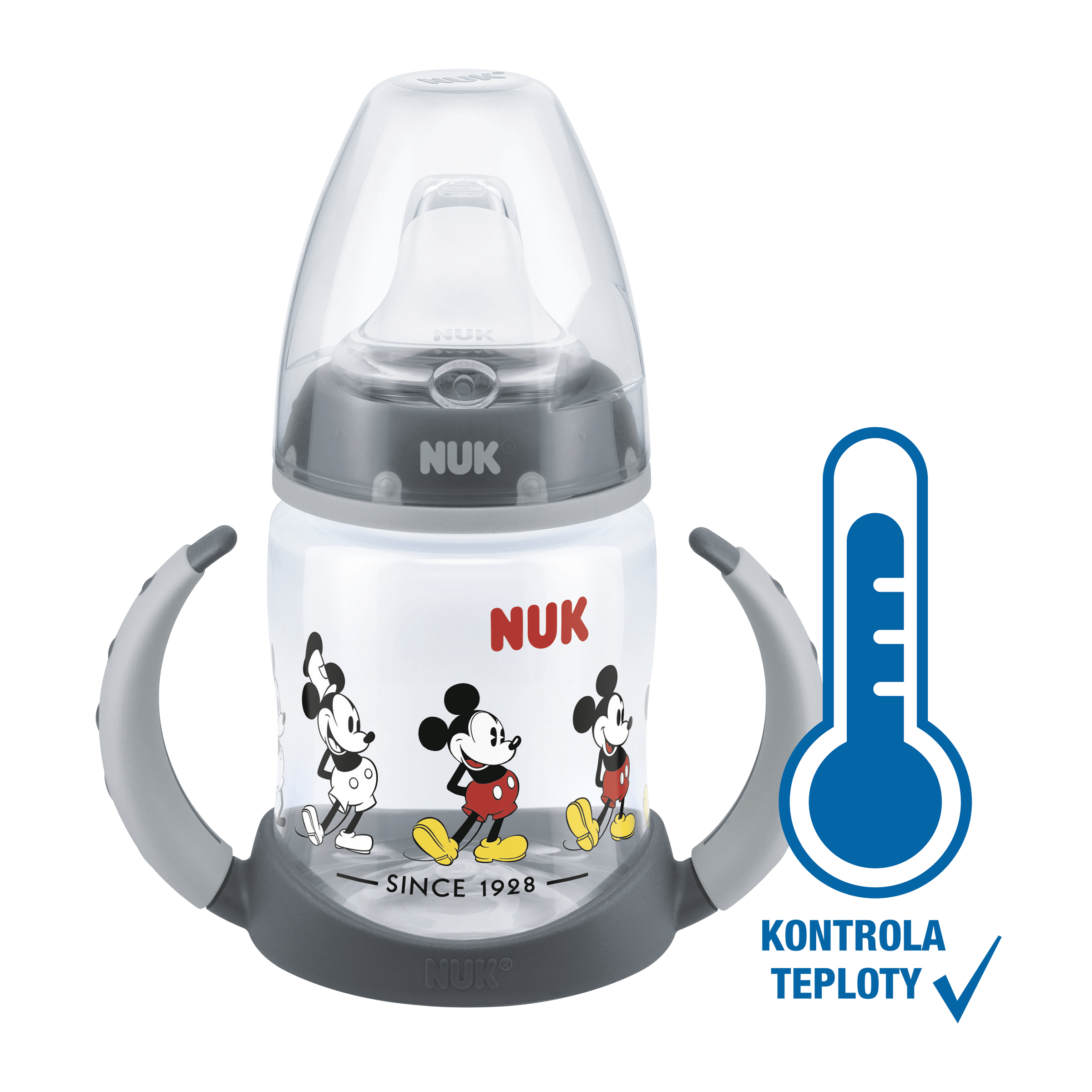 Dětská lahvička na učení NUK Disney Mickey Mouse s kontrolou teploty, 150 ml, nekapající, 6-18 měsíců. Pro hladký přechod od kojení nebo krmení z láhve k nezávislému a samostatnému pití dítěte.
