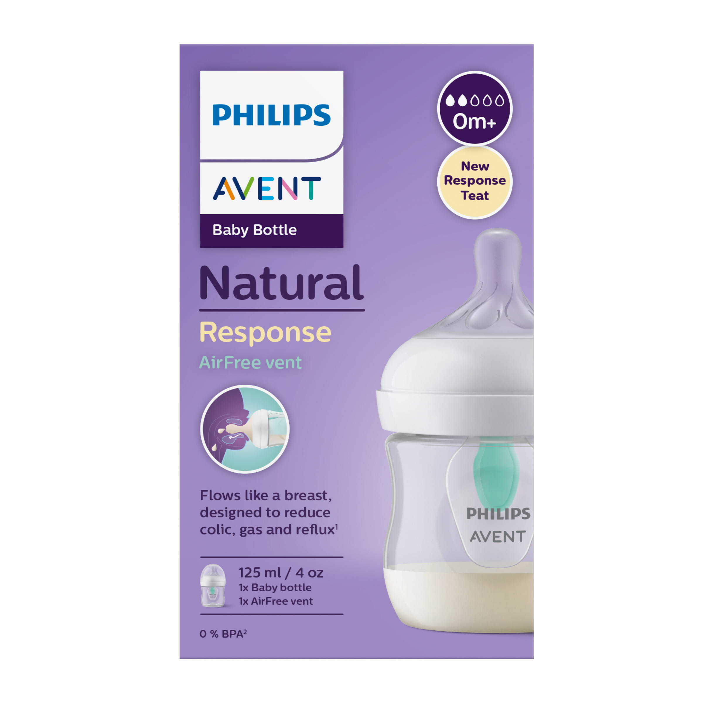 Dudlík Natural Response podporuje přirozený rytmus sání, polykání a dýchání dítěte a ventil AirFree je navržen tak, aby odváděl vzduch z láhve, a chránil tak proti kolice, plynatosti a refluxu. Snadná kombinace kojení a krmení z lahve - Přirozené přisátí díky dudlíku ve tvaru prsu - Dudlík uvolňuje mléko, když dítě aktivně pije