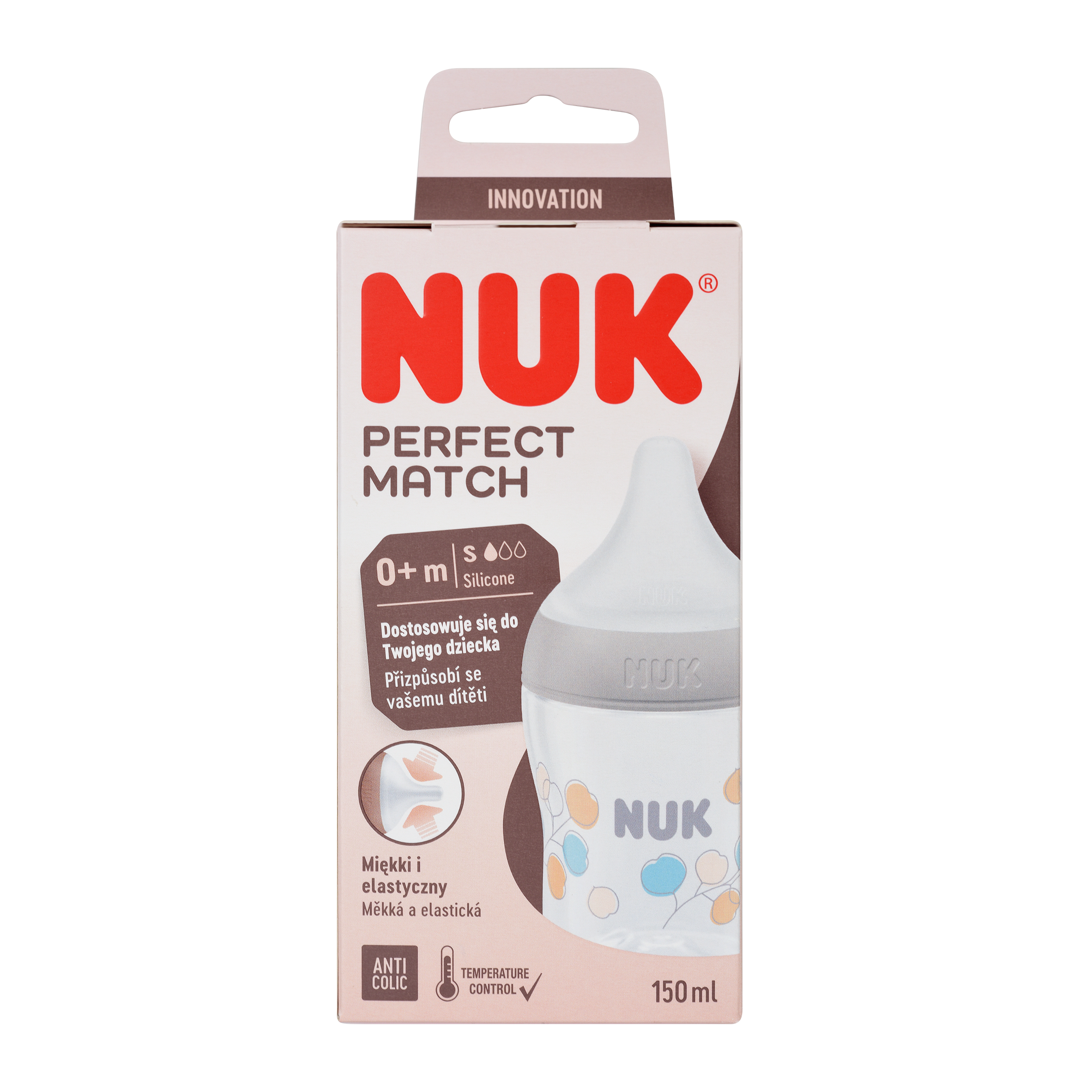 Kojenecká láhev NUK Perfect Match, s měkkou silikonovou savičkou, 150 ml, od narození, neobsahuje BPA, antikolikový systém, s kontrolou teploty.