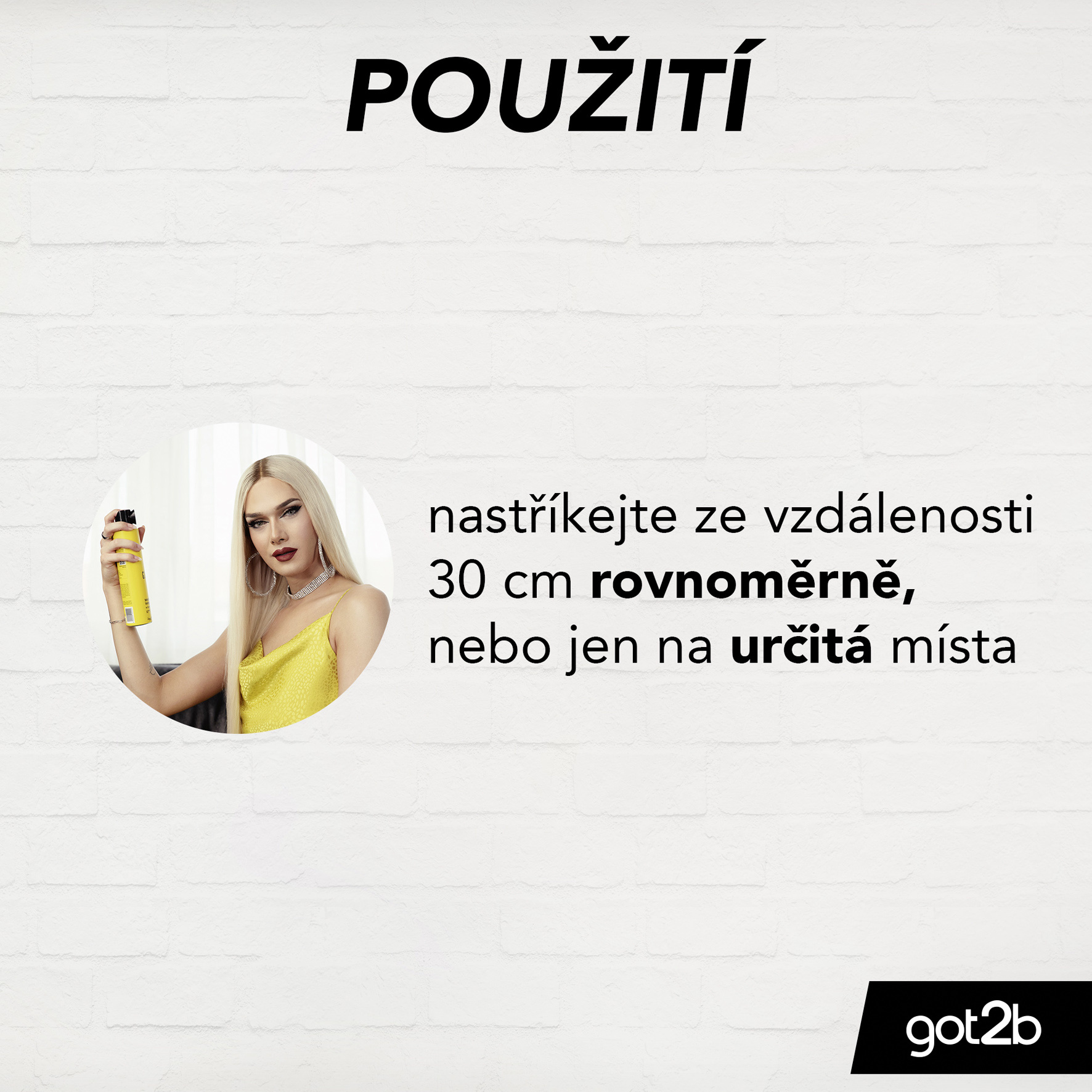Pro celkovou fixaci rovnoměrně nastříkejte na vlasy ze vzdálenosti 30 cm. Pro zafixování jen některých částí nastříkejte pouze na vybrané prameny vlasů. Tipy: Pro extra zpevnění začněte s Glued gelem got2b, který aplikujte na mokré vlasy, zatočte konečky a štědře nastříkejte Glued lakem na vlasy, abyste výsledek zafixovali. Nechte zaschnout a dokončete další dávkou laku.
