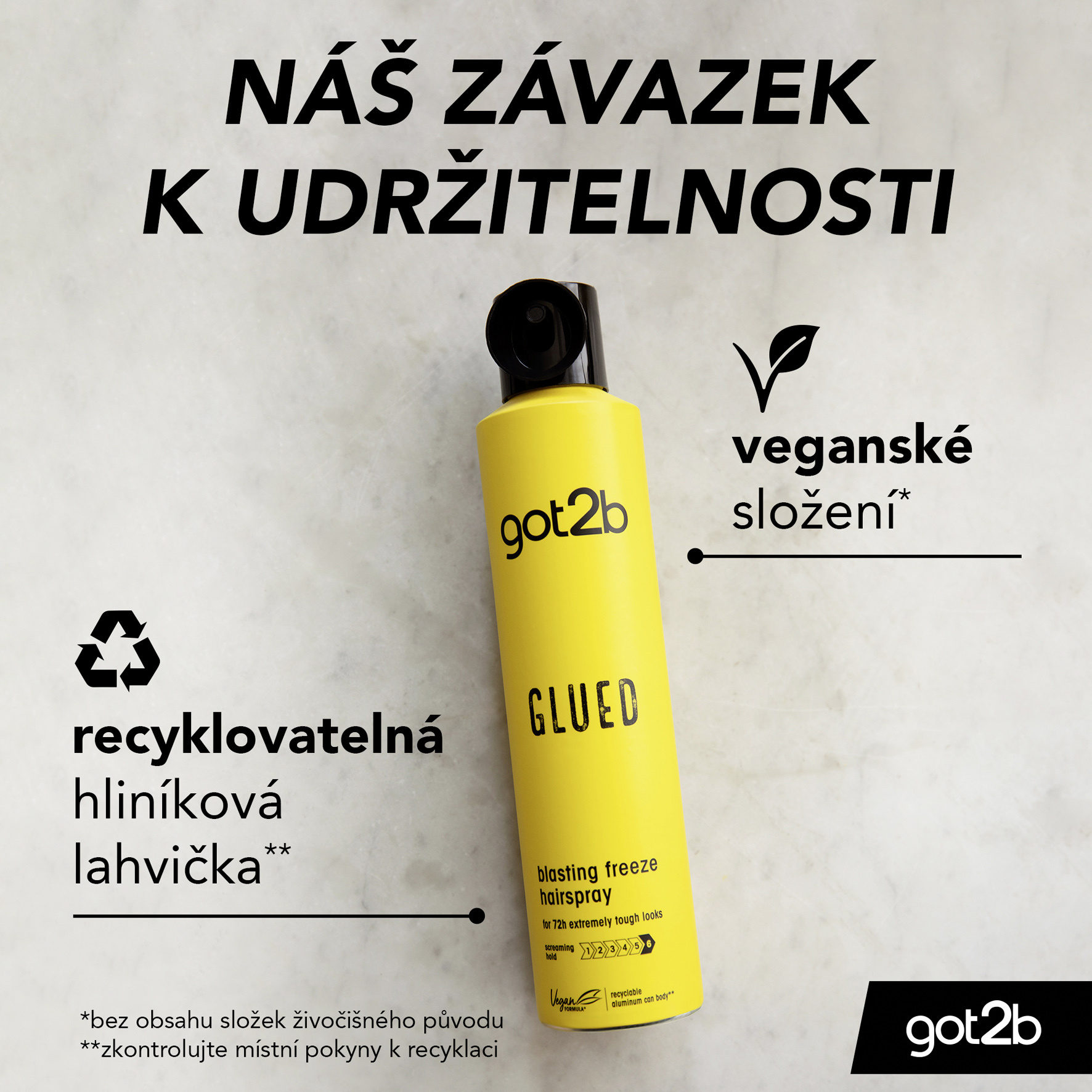 - Veganské* složení: Složení laku na vlasy got2b Glued lasting Freeze je veganské*, tedy neobsahuje složky živočišného původu.
