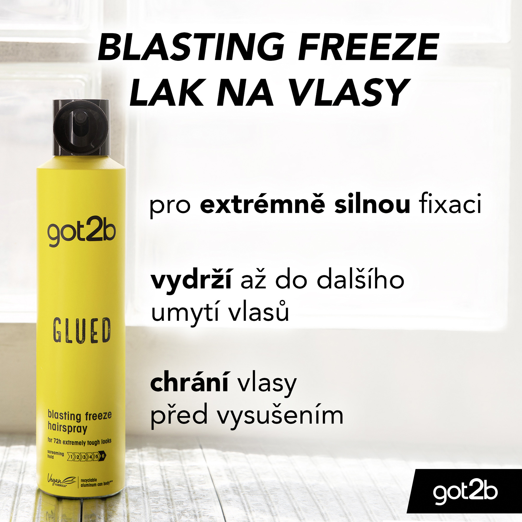 - Glued Blastin Freeze lak na vlasy: Používá se jako sprej, drží jako lepidlo! Lak na vlasy got2b Glued Blasting Freeze zafixuje odvážné účesy až do dalšího mytí