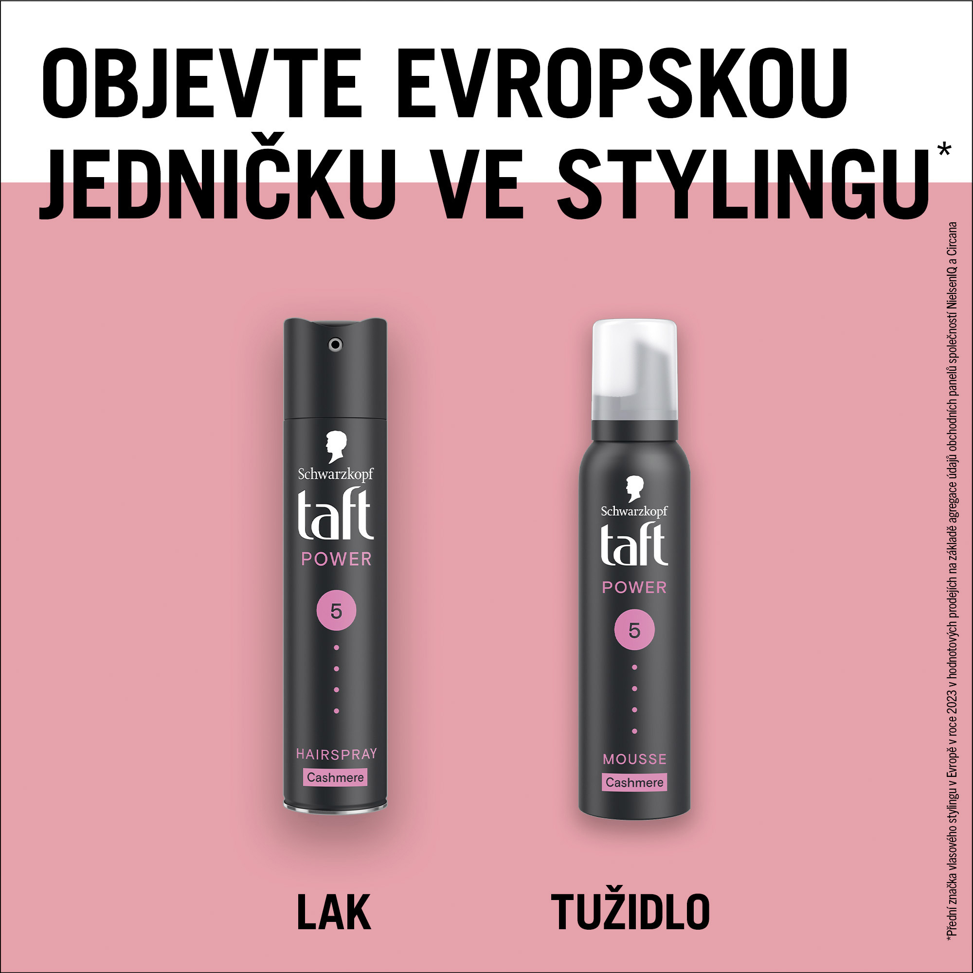 Lak na vlasy Schwarzkopf Taft Power Cashmere 400ml, Stupeň fixace 5, Lak na vlasy pro suché a poškozené Vlasy, Kašmírová poddajnost, Veganské složení*. Lak na vlasy Taft Power Cashmere 400 ml dodává vlasům jemný kašmírový dotek - speciálně pro suché a poškozené vlasy. Lak na vlasy Taft Power Cashmere 400ml - Pro kašmírovou hebkost vlasů. Inovativní složení Taft Power zaručuje kašmírovou hebkost na dotek - zejména pro suché a poškozené vlasy. Dlouhodobě drží bez slepení a zároveň se snadno vyčesává. Tento lak na vlasy Taft pro poškozené vlasy pomáhá chránit vlasy před pocitem vysušení a zároveň poskytuje silnou fixaci i při vysoké vlhkosti a větru. Lak na vlasy Taft obsahuje systém HAPTIQ, který vytváří mikrovazby a posiluje strukturu vlasů. Pro krásné účesy, které můžete vidět a cítit. Laky na vlasy Taft využívají veganské složky* a jsou schváleny organizací PETA**. Složení neobsahuje silikony.