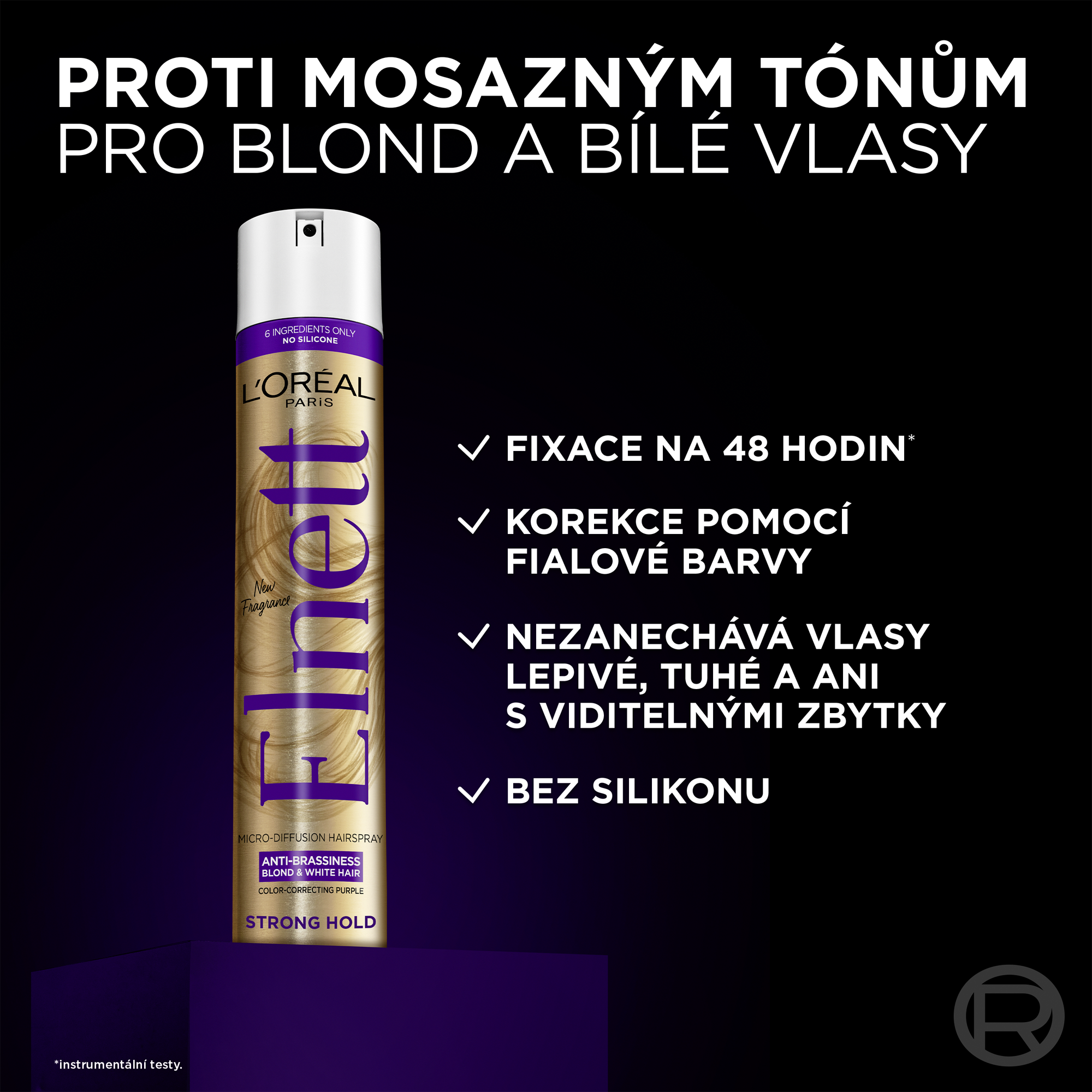 Speciálně vyvinutý pro blond a bílé vlasy, tento lak obsahuje fialové pigmenty, které účinně neutralizují nežádoucí žluté tóny a dodávají vašim vlasům zářivý, chladný odstín. Díky svému unikátnímu složení a ikonické mikrodifuzní technologii poskytuje dokonalou fixaci až na 48 hodin, aniž by vaše vlasy zatěžoval nebo lepil.