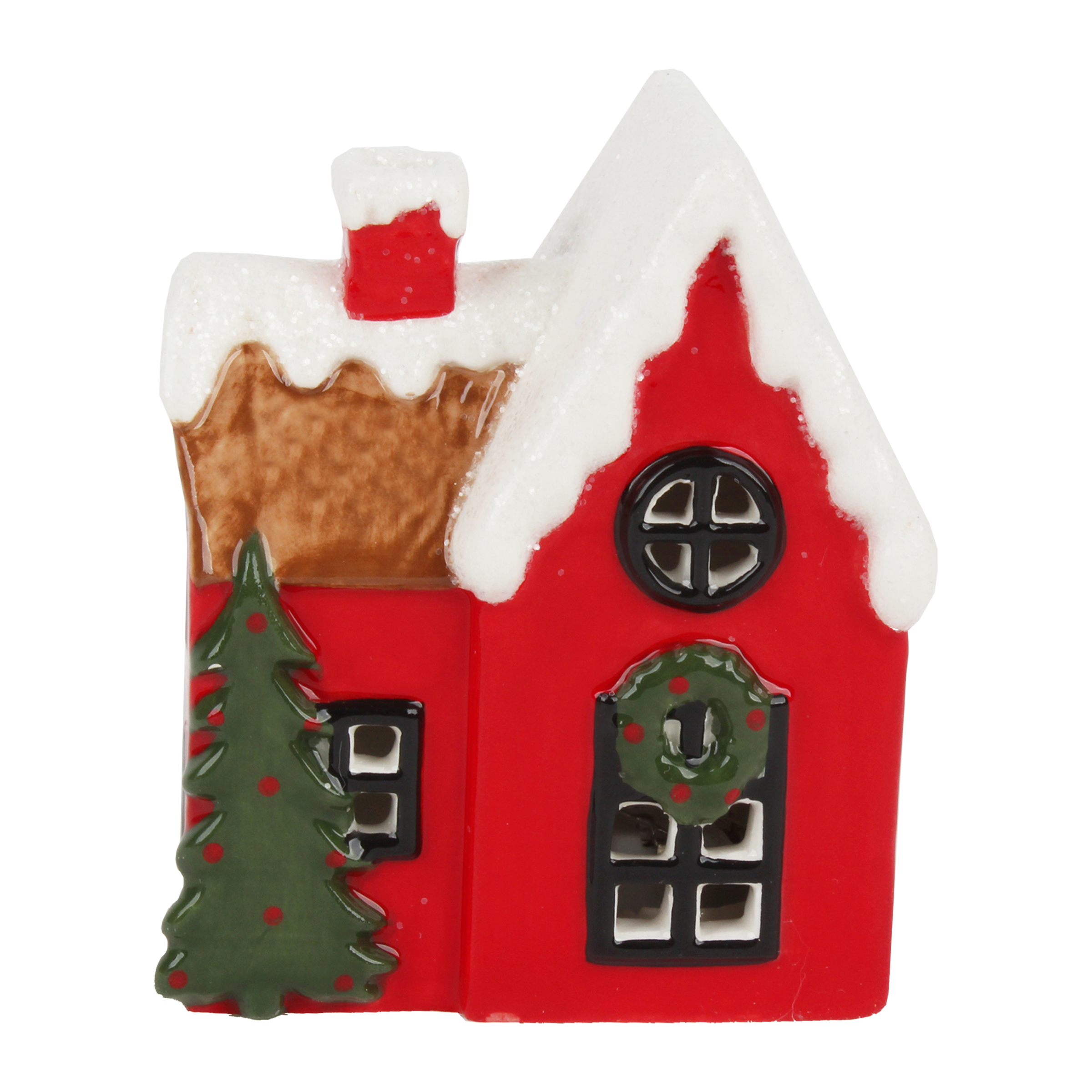 Roztomilá dekorativní chaloupka s LED osvětlením, červeným tělem a zasněženou střechou. Před domkem stojí vánoční stromeček, dveře zdobí zelený věnec s červenými detaily. Ideální pro vytvoření kouzelné sváteční atmosféry doma. Výška: 10 cm