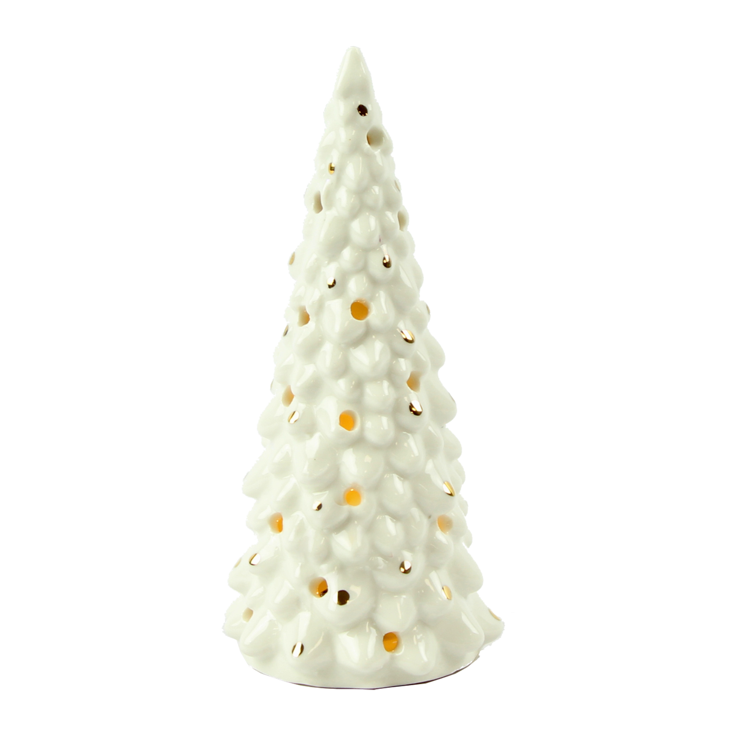 Keramický vánoční stromeček s jemnou texturou připomínající zasněžené větve. Malé otvory po povrchu umožňují jemné prosvícení LED světla, které vytváří útulnou sváteční atmosféru. Elegantní dekorace pro zimní období. Rozměry: 16 cm.