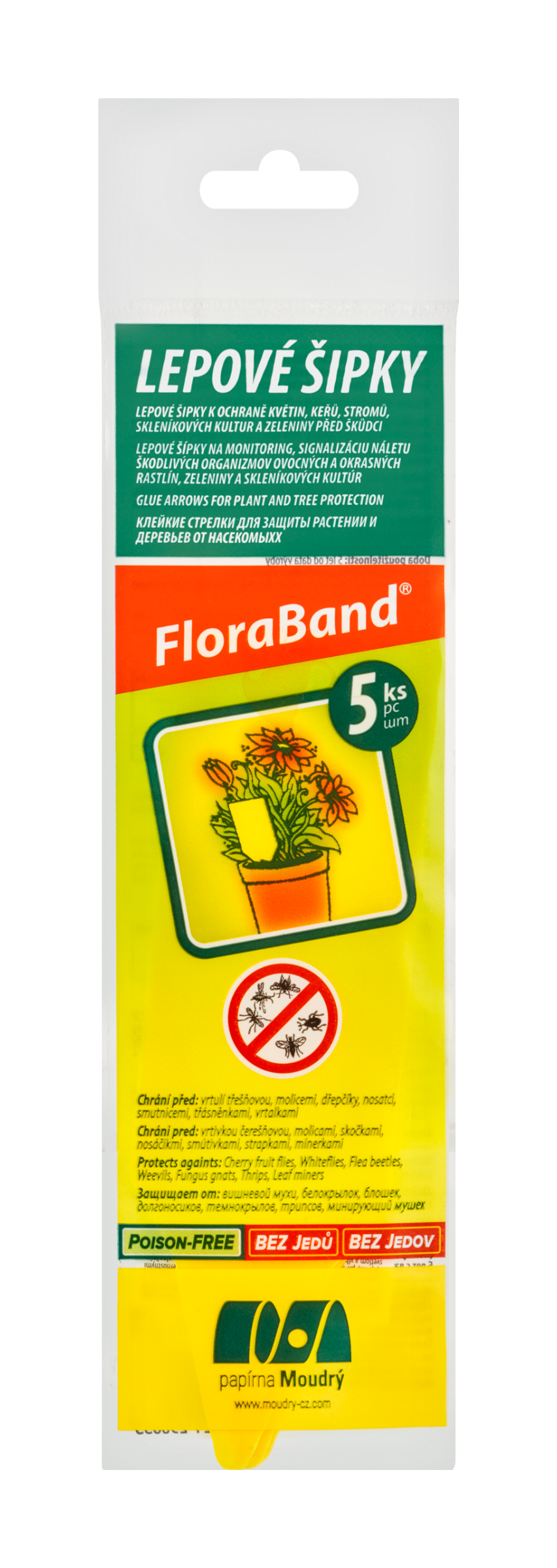 Lepové šipky k ochraně květin, keřů, stromů, skleníkových kultur a zeleniny před škůdci. Chrání před: vrtulí třešňovou, molicemi, dřepčíky, nosatci, smutnicemi, třásněnkami, vrtalkami. FloraBand - pomocný prostředek na ochranu rostlin Pasivní pomocný prostředek ve formě lepových šipek k ochraně květin, keřů, stromů, skleníkových kultur a zeleniny před škůdci.