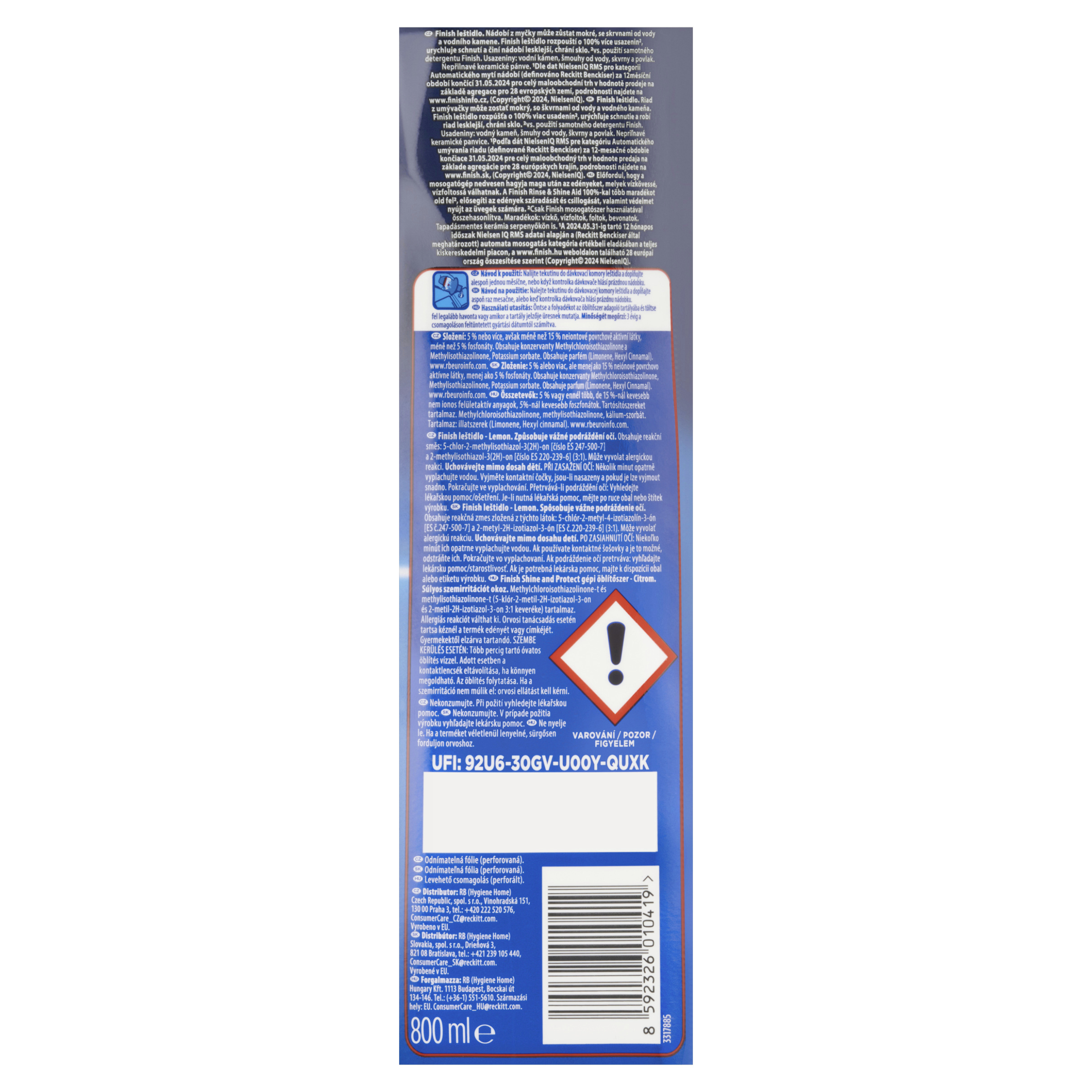 VAROVÁNÍ Finish leštidlo - Lemon. Způsobuje vážné podráždění očí. Obsahuje reakční směs: 5-chlor-2-methylisothiazol-3(2H)-on [číslo ES 247-500-7] a 2-methylisothiazol-3(2H)-on [číslo ES 220-239-6] (3:1). Může vyvolat alergickou reakci. Uchovávejte mimo dosah dětí. PŘI ZASAŽENÍ OČÍ: Několik minut opatrně vyplachujte vodou. Vyjměte kontaktní čočky, jsou-li nasazeny a pokud je lze vyjmout snadno. Pokračujte ve vyplachování. Přetrvává-li podráždění očí: Vyhledejte lékařskou pomoc/ošetření. Je-li nutná lékařská pomoc, mějte po ruce obal nebo štítek Nekonzumujte. Při požití vyhledejte lékařskou pomoc.