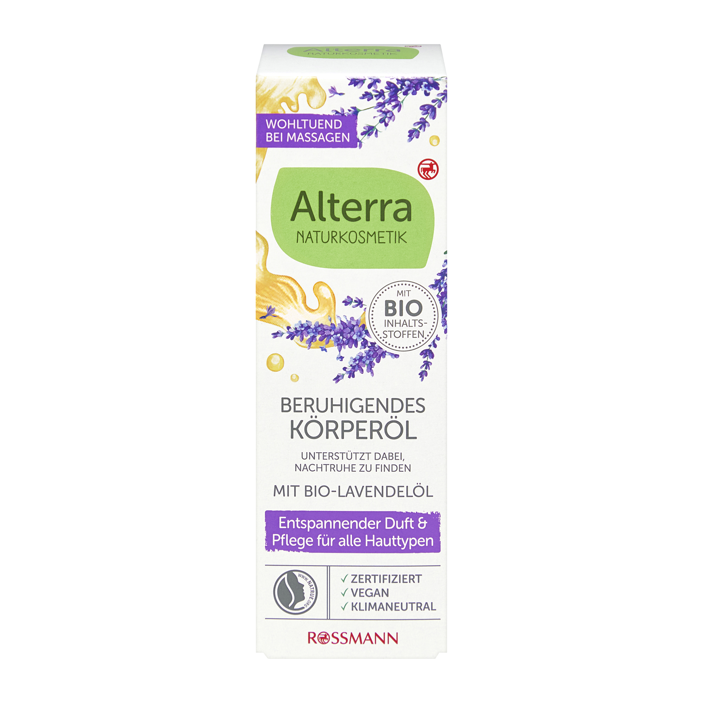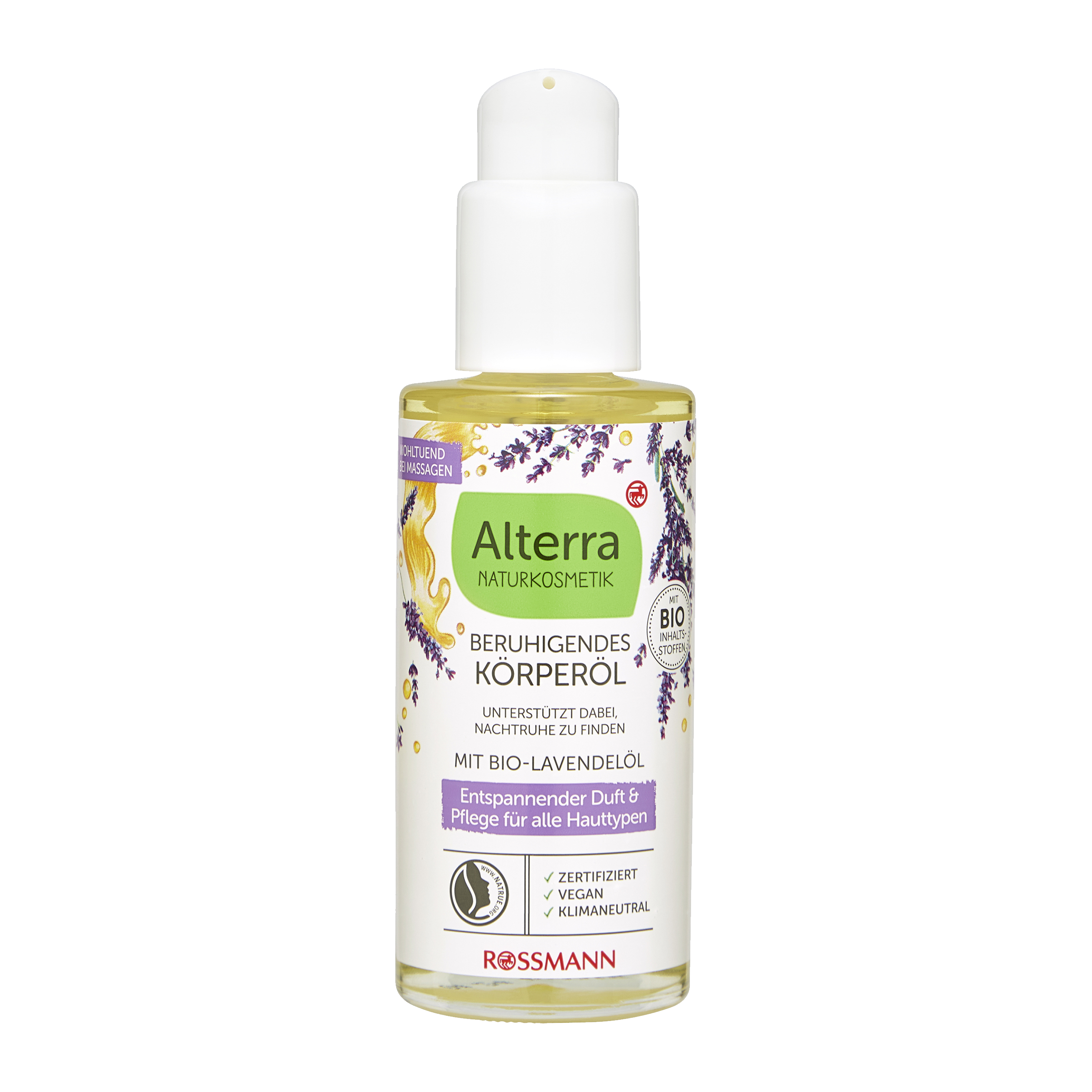 Náš zklidňující tělový olej Alterra s bio esenciálním olejem z francouzské levandule usnadňuje relaxaci a podporuje klidný spánek.
