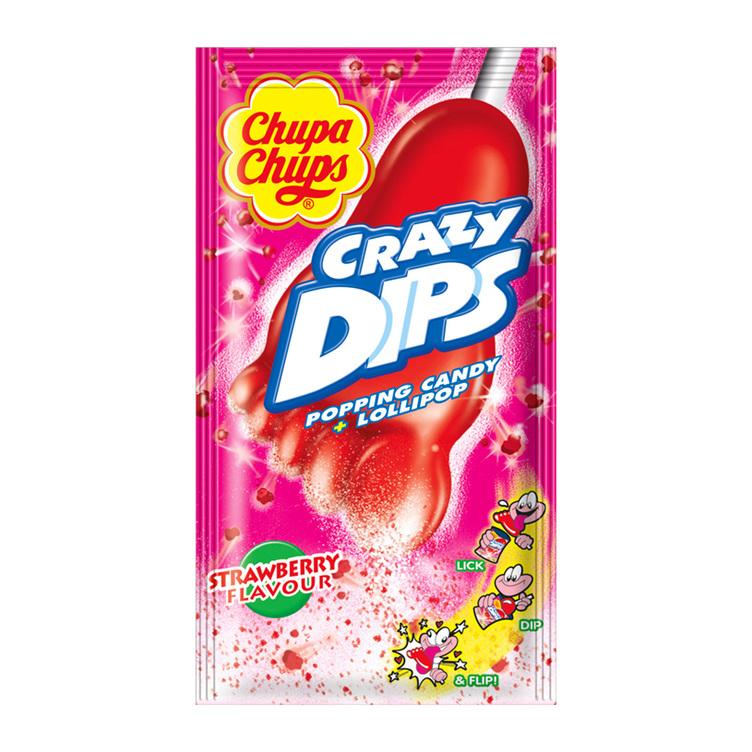 Chupa Chups Crazy Dips je bláznivé lízátko ve tvaru nohy s praskajícím práškem v balení! Vychutnejte si ho v oblíbené jahodové příchuti.