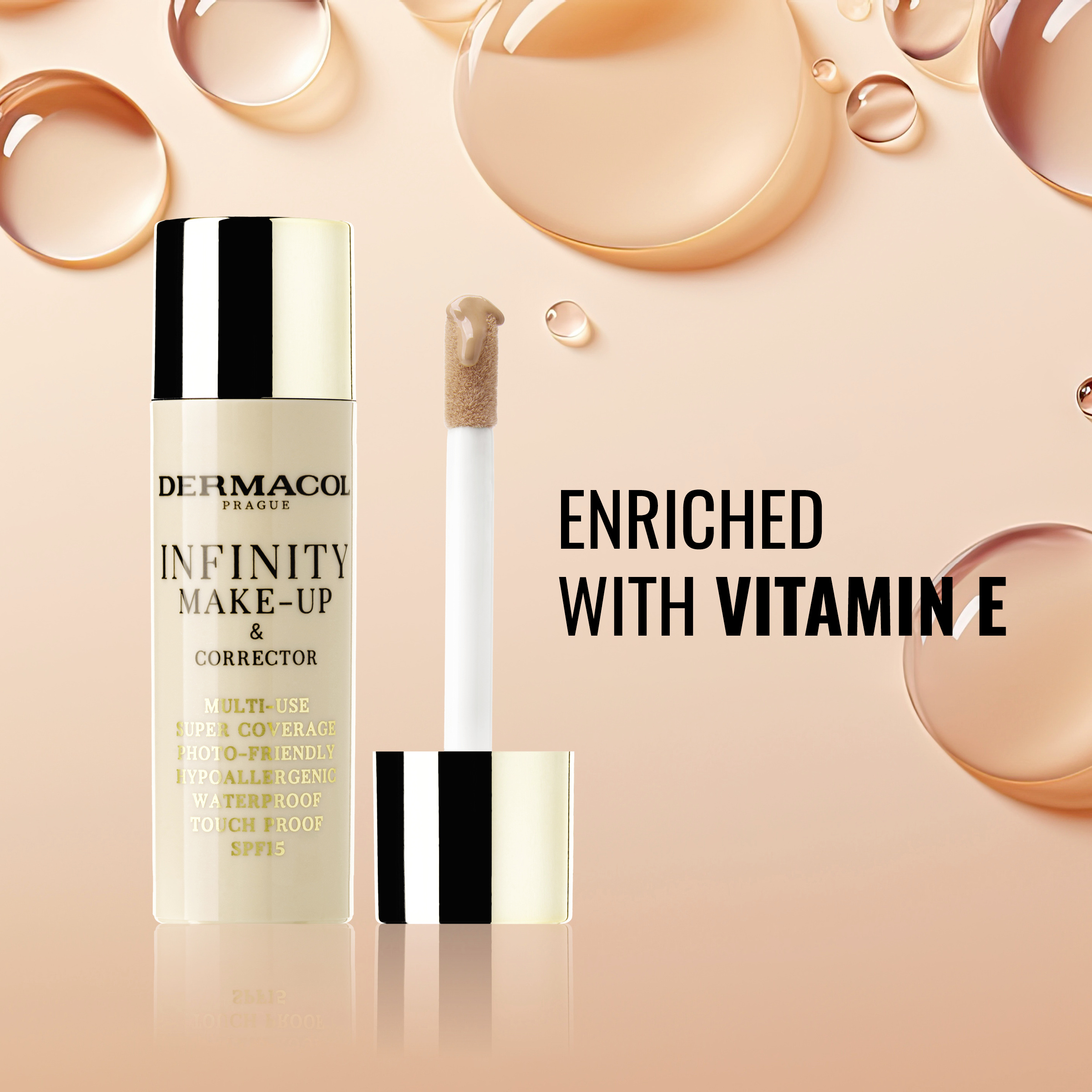 Víceúčelový, vysoce krycí make-up a korektor 2v1, zakryje všechny nedokonalosti, pigmentové skvrny a dodá pleti bezchybný sametový vzhled. Bezvodá, extra lehká, vysoce krycí fluidní textura nezanechává pocit „těžké“ pleti. Stačí velmi tenká vrstva, která vytvoří krásný a kompaktní efekt na pokožce. Obsahuje částečky jojobového vosku, který se při kontaktu s kůží rozehřeje a vytvoří tak ochrannou vrstvu. Výsledkem je hedvábně hladká a krásná pleť. Obsahuje vitamin E. Bez parabenů, konzervantů, bez parfemace, bez minerálních olejů. Hypoalergenní, voděodolný a dotekuodolný. SPF 15.