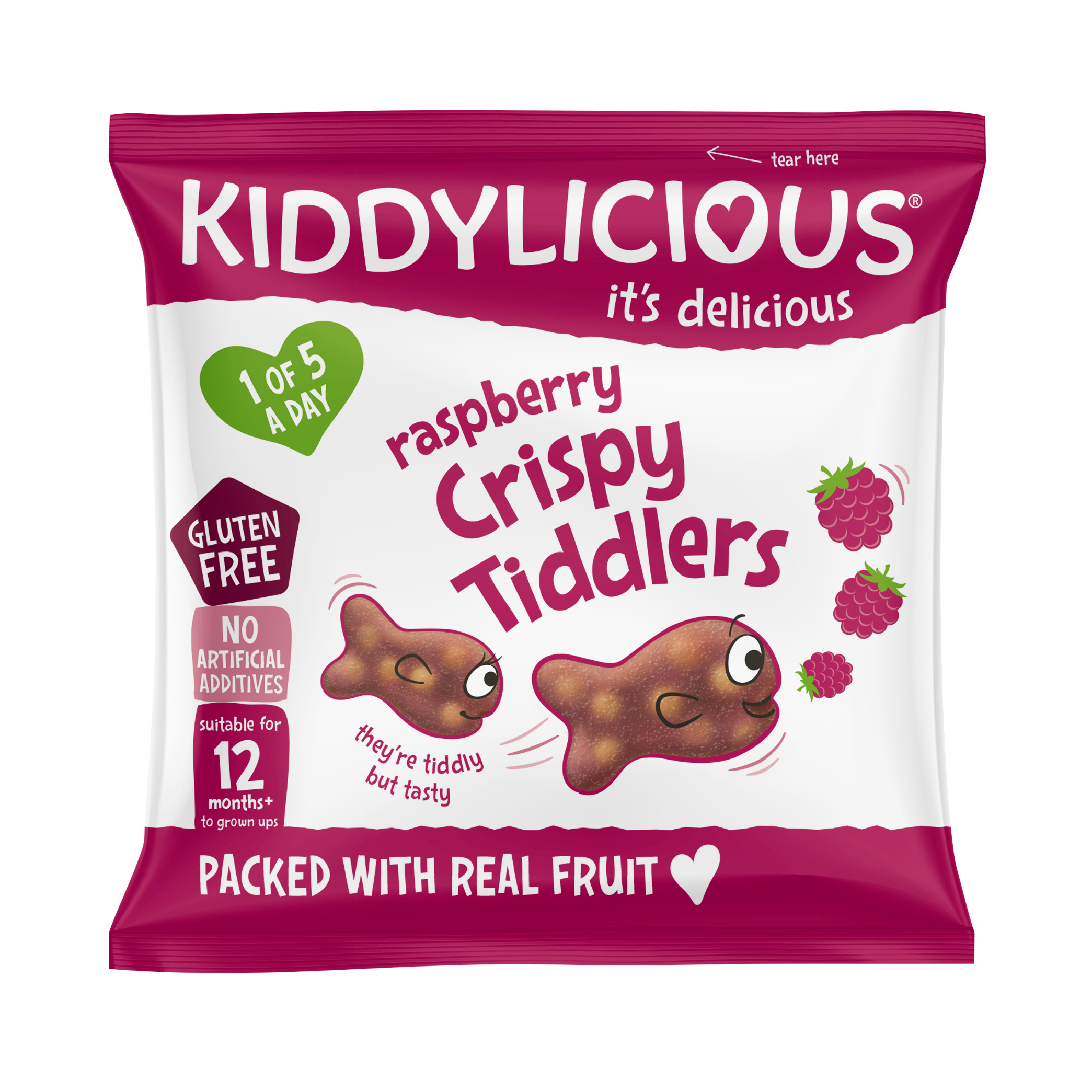 Malinové křupavé rybičky Kiddylicious jsou dokonalou a zdravou sladkostí. Jsou vyrobeny z pravého ovoce a ovocné šťávy, načež tuto směs rozmixujeme s křupavými kousíčky rýže a vytvarujeme je do rozkošného tvaru rybiček. Jsou chutnou alternativou ke gumovým medvídkům. Ideální i pro ozdobu koláčů, sušenek a dezertů. Naše křupavé rybičky obsahují pouze přirozeně se vyskytující cukry. Snack z jablečné koncentrované šťávy, z jablečného pyré, pufované rýže a malinové koncentrované šťávy. Potravina pro malé děti. Baleno v ochranné atmosféře. Vhodné pro děti od ukončeného 12. měsíce.