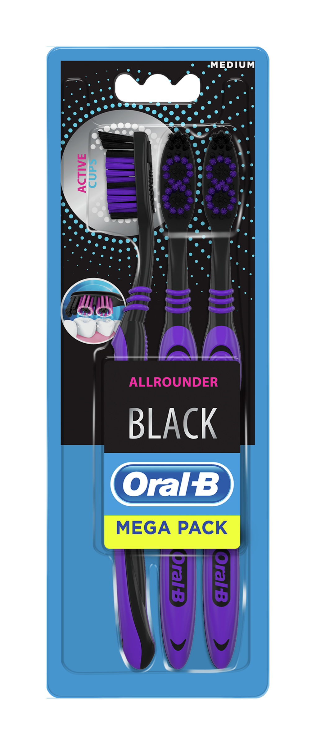 Manuální zubní kartáček Oral-B Allrounder Black má vlákna miskovitého tvaru navržená tak, aby čistila mezizubní prostory a podél linie dásní.