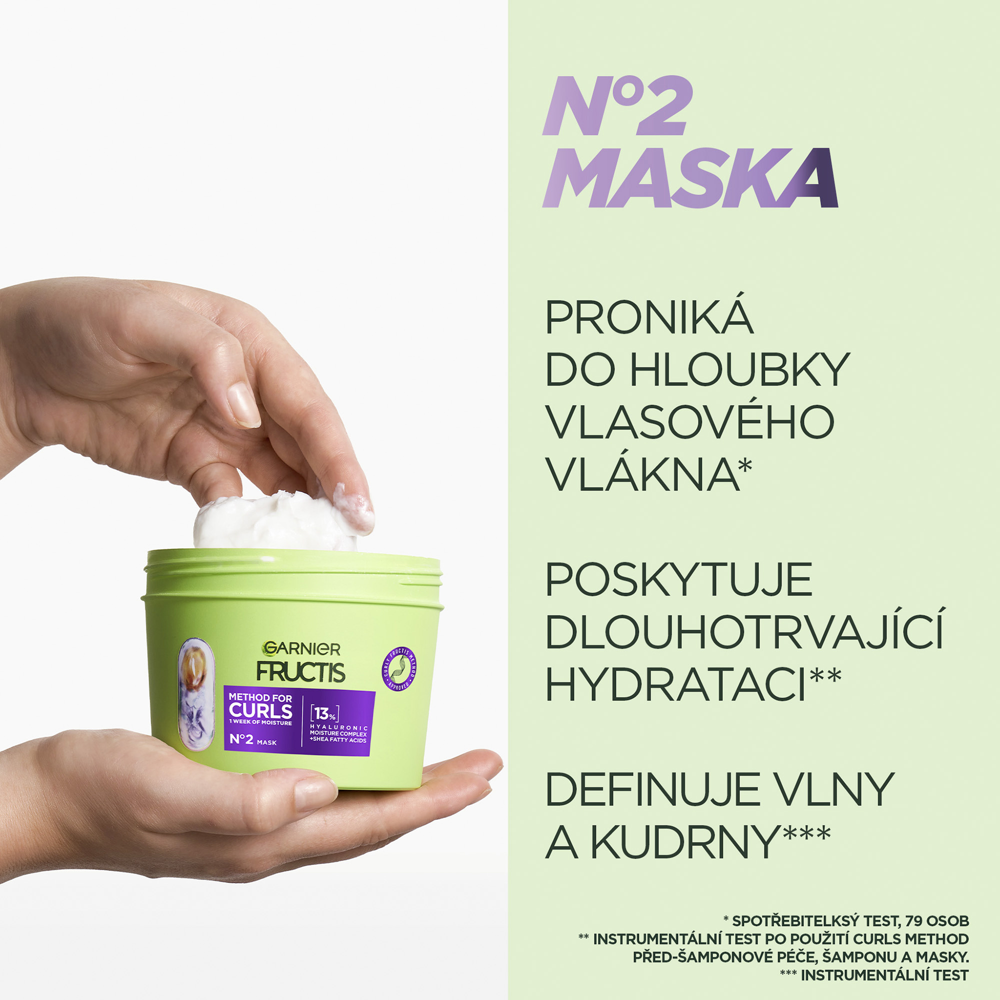 Hydratační maska na vlasy Fructis Curly Hair pro suché vlnité a kudrnaté vlasy proniká do hloubky až 5 vrstev vlasového vlákna a poskytuje dlouhotrvající hydrataci a definuje vlny i kudrny. Složení masky je obohaceno o 13% hydratační hyaluronový komplex a mastné kyseliny z bambuckého másla.