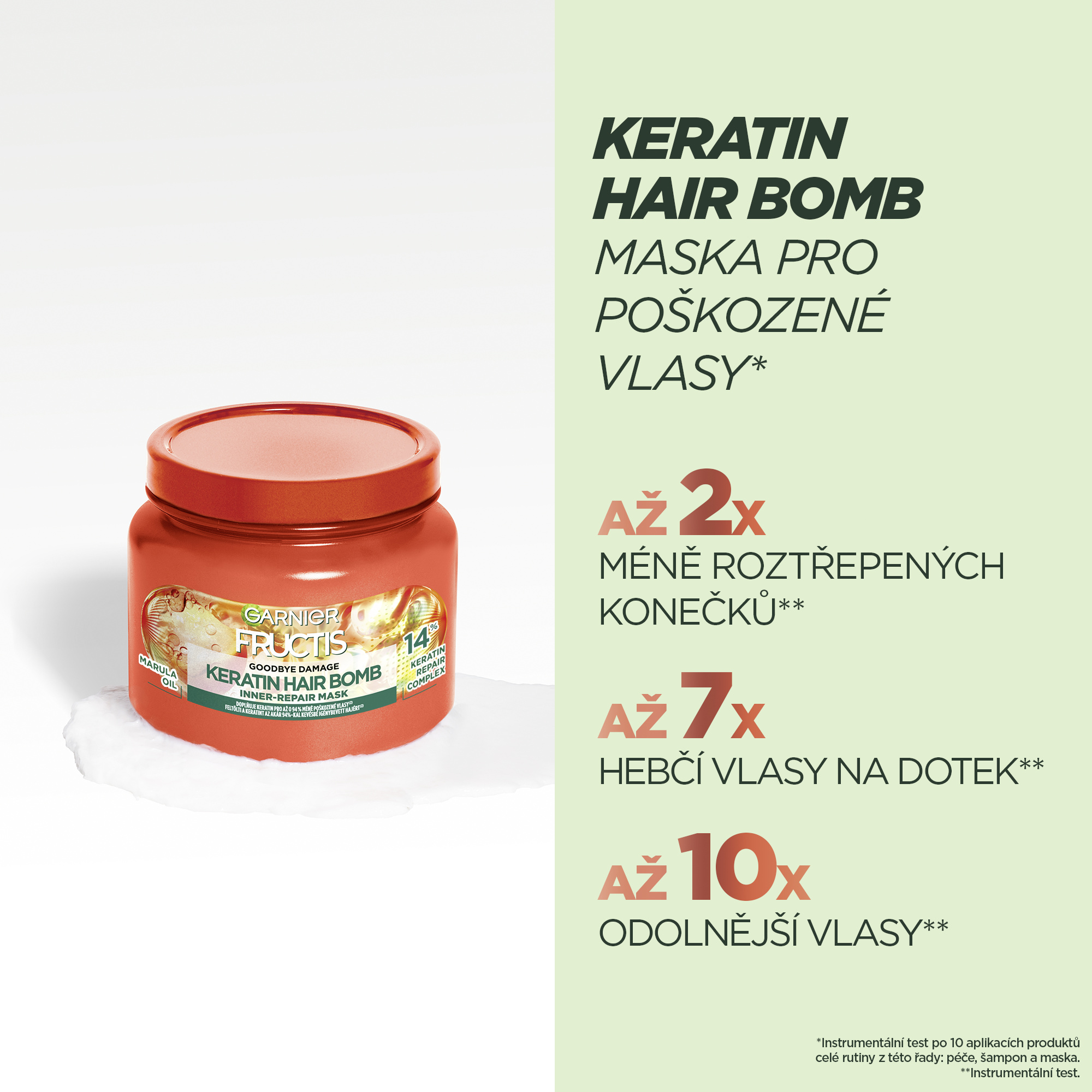 Keratin Hair Bomb maska pro poškozené vlasy (2) s technologií keratinového komplexu. Technologie s 14 % keratinového komplexu a s marulovým olejem doplňuje keratin pro až 94 % méně poškozených vlasů (1). Aktivní látka proniká až do hloubky 10 vrstev (3). Intenzivně vyplňuje a posiluje vlasové vlákno. Vlasy jsou viditelně silnější a odolnější. Přináší až 2x méně roztřepených konečků (3), až 7x hebčí vlasy na dotek (3) a až 10x odolnější vlasy (3).