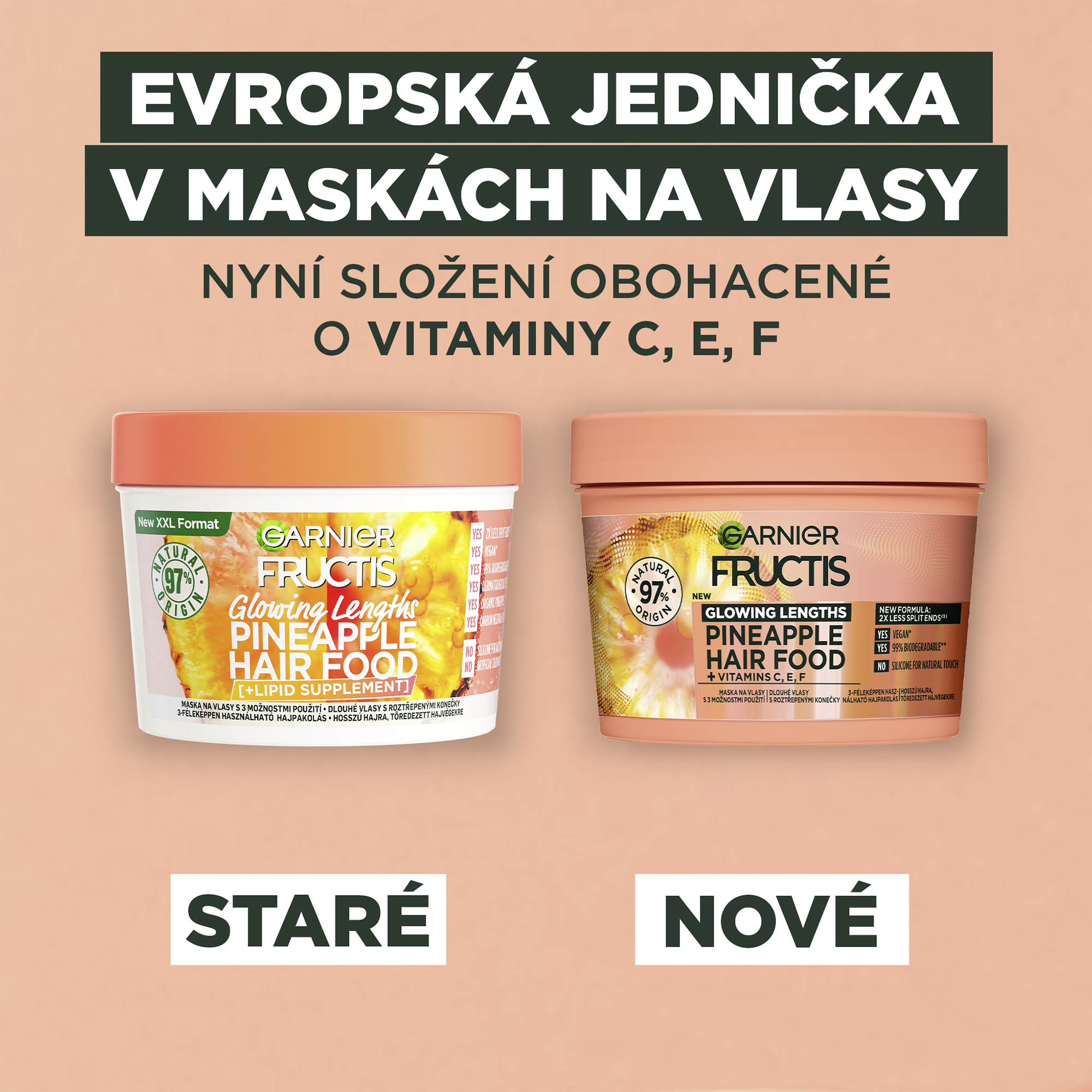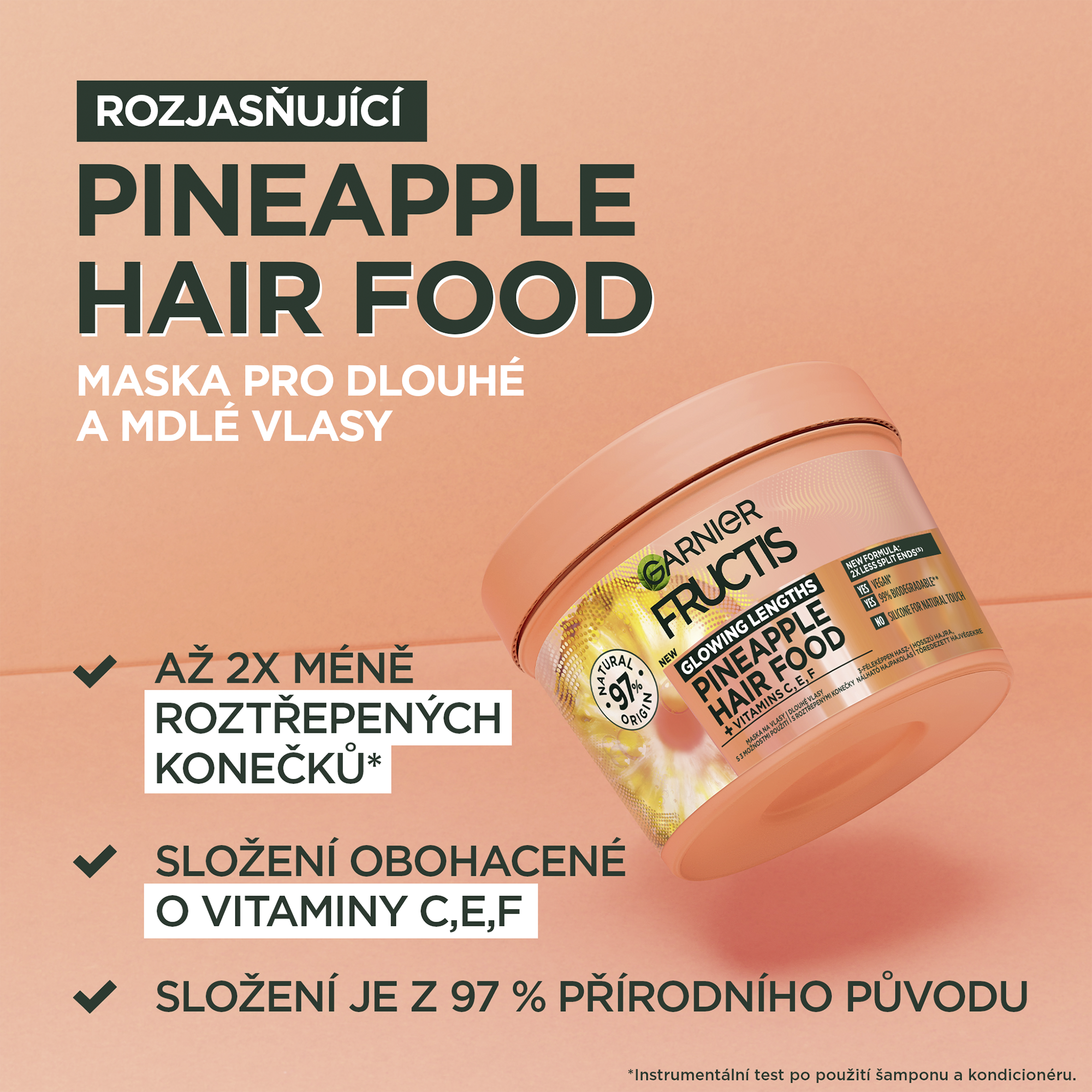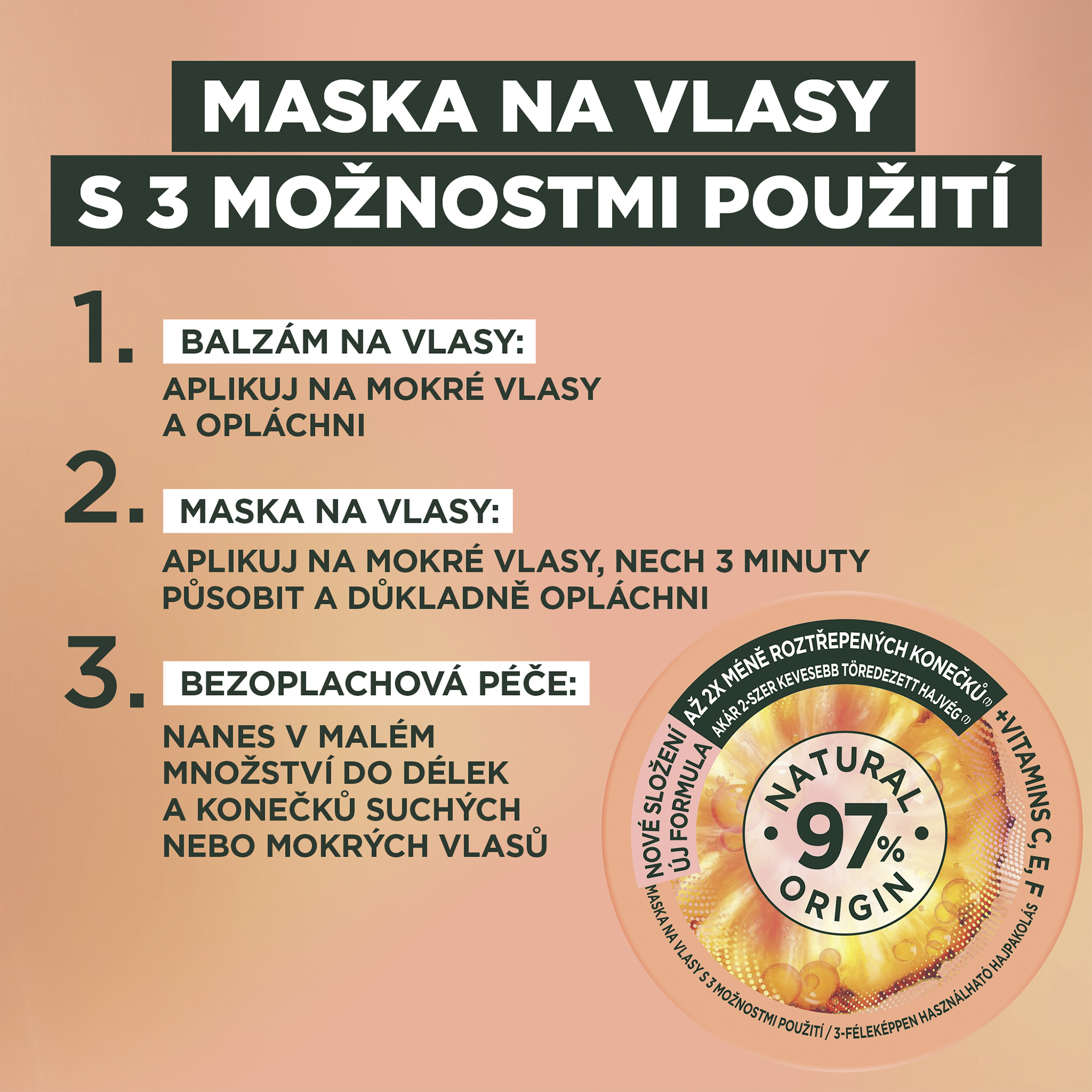 Až 2x méně roztřepených konečků (1). Složení je z 97% přírodního původu. Zbývající 3% zaručují senzorické vlastnosti a stabilitu produktu. (1) Instrumentální test po aplikaci masky a následném opláchnutí.