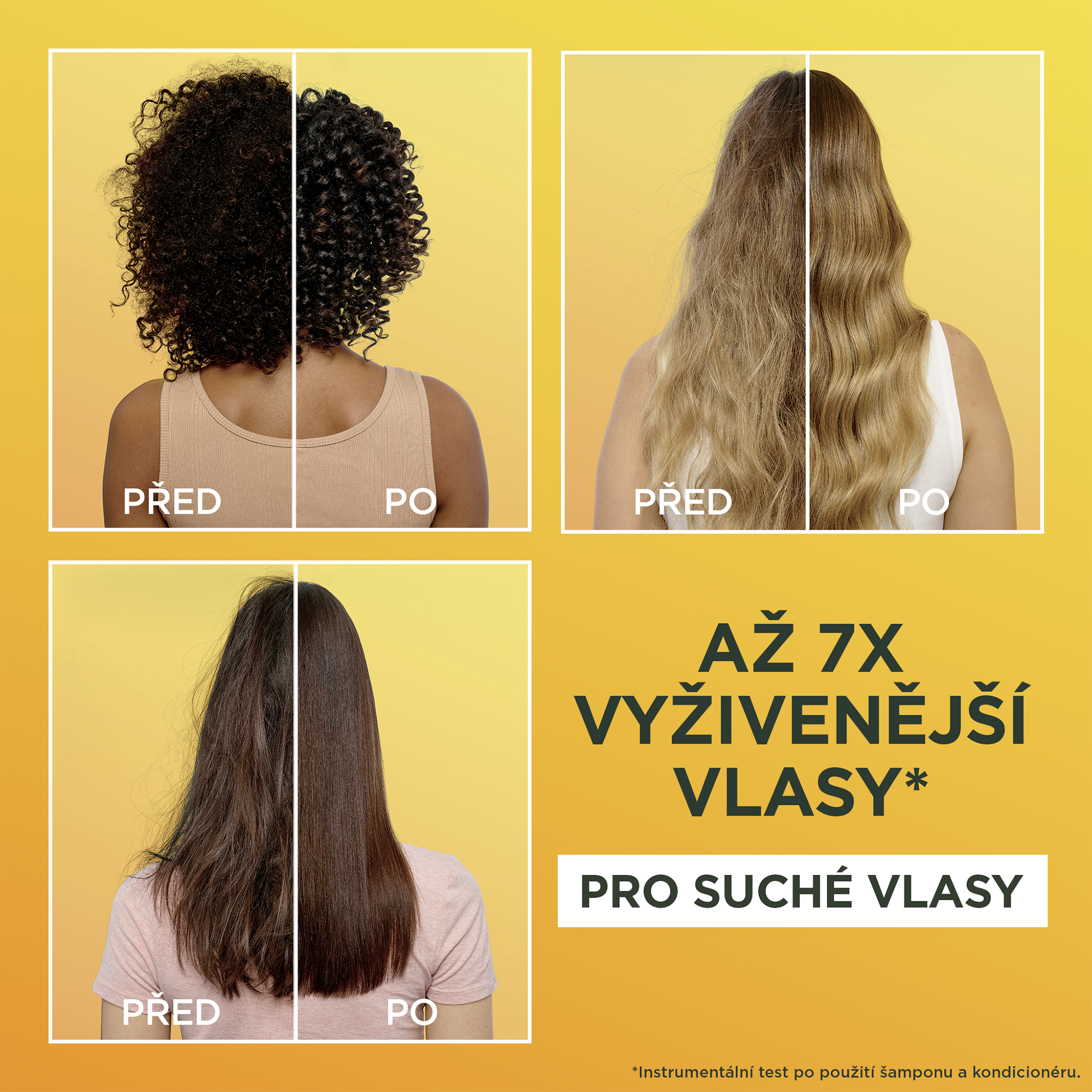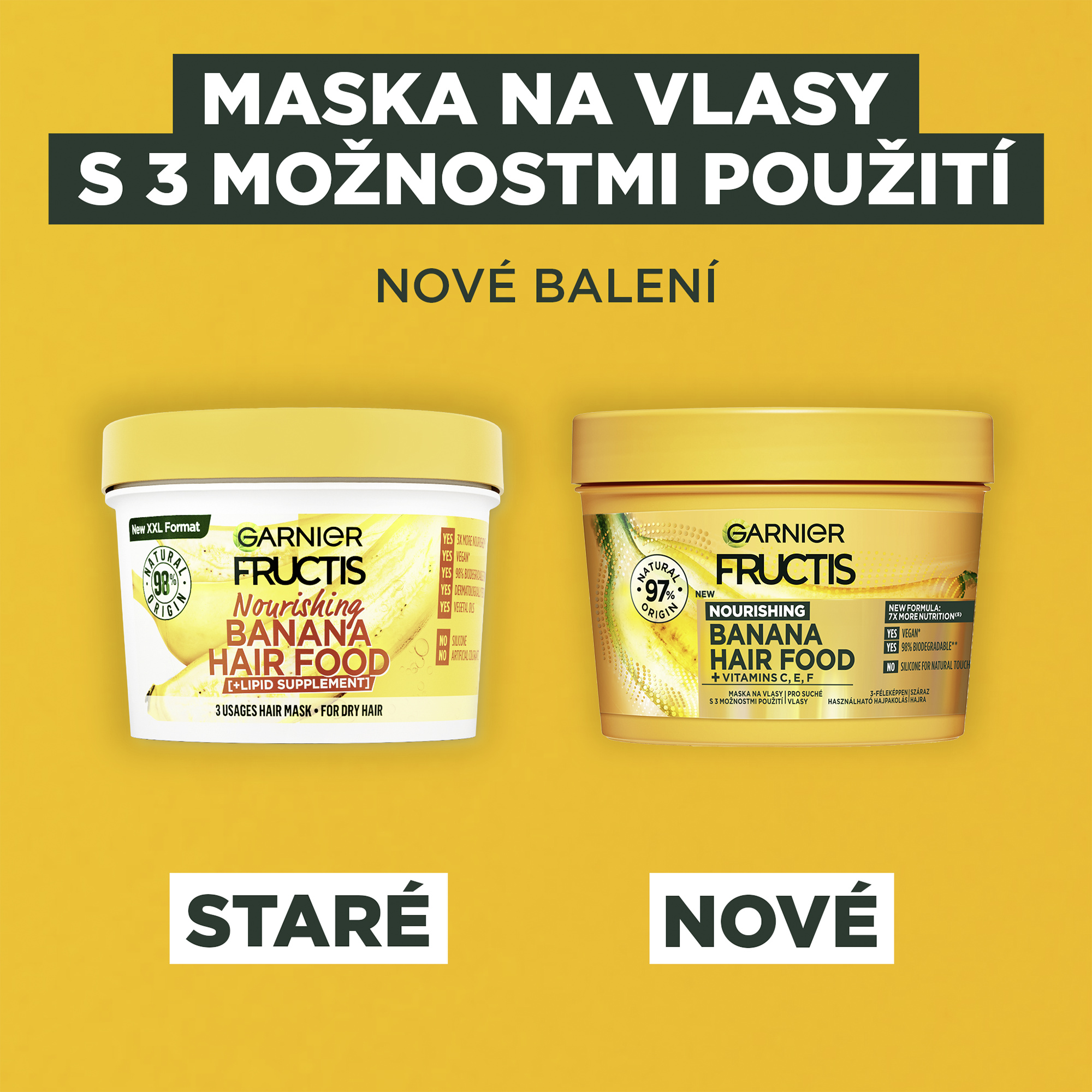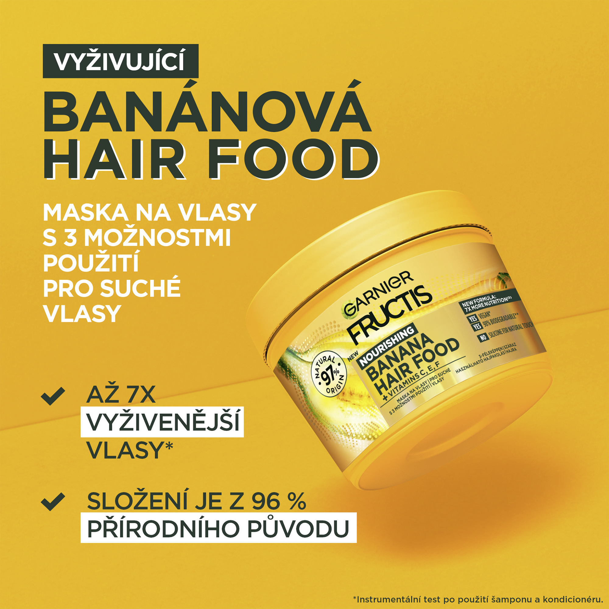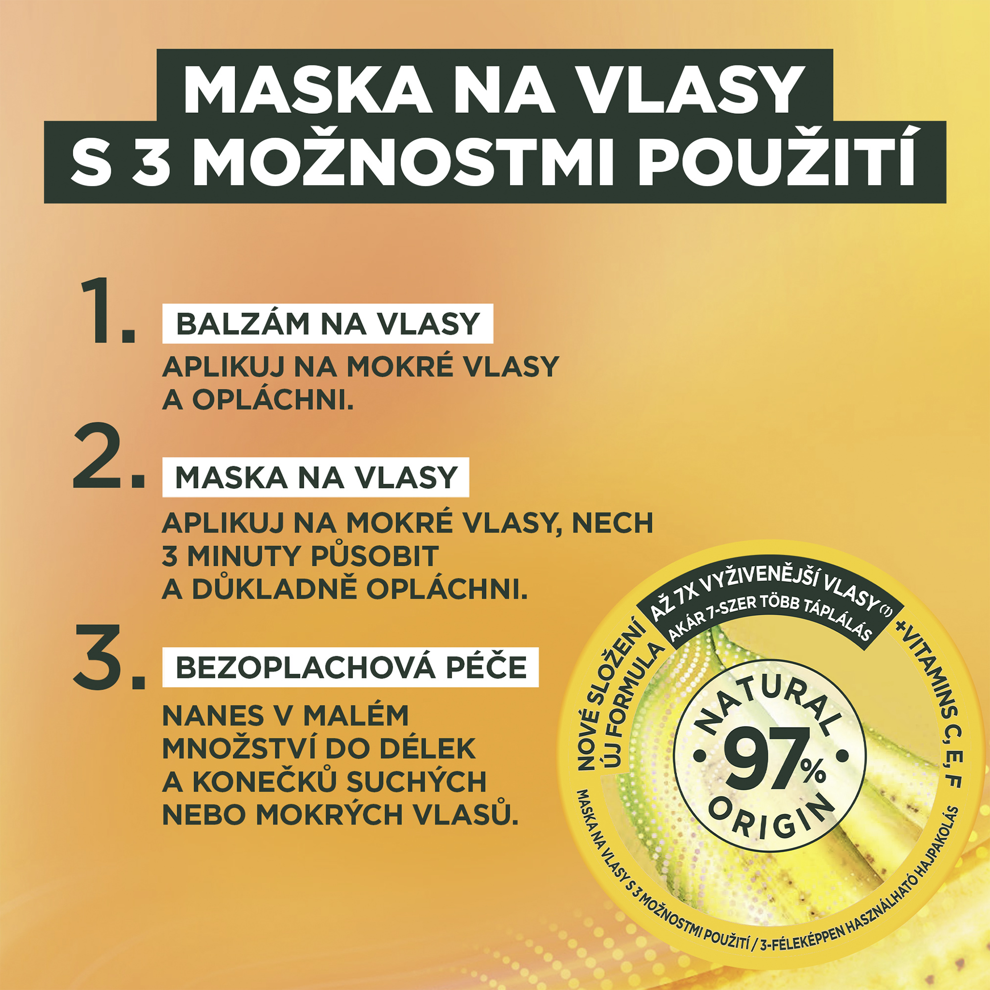 Až 7x vyživenější vlasy (1). Složení je z 97% přírodního původu. Zbývající 3% zaručují senzorické vlastnosti a stabilitu produktu. (1) Instrumentální test po aplikaci masky a následném opláchnutí.