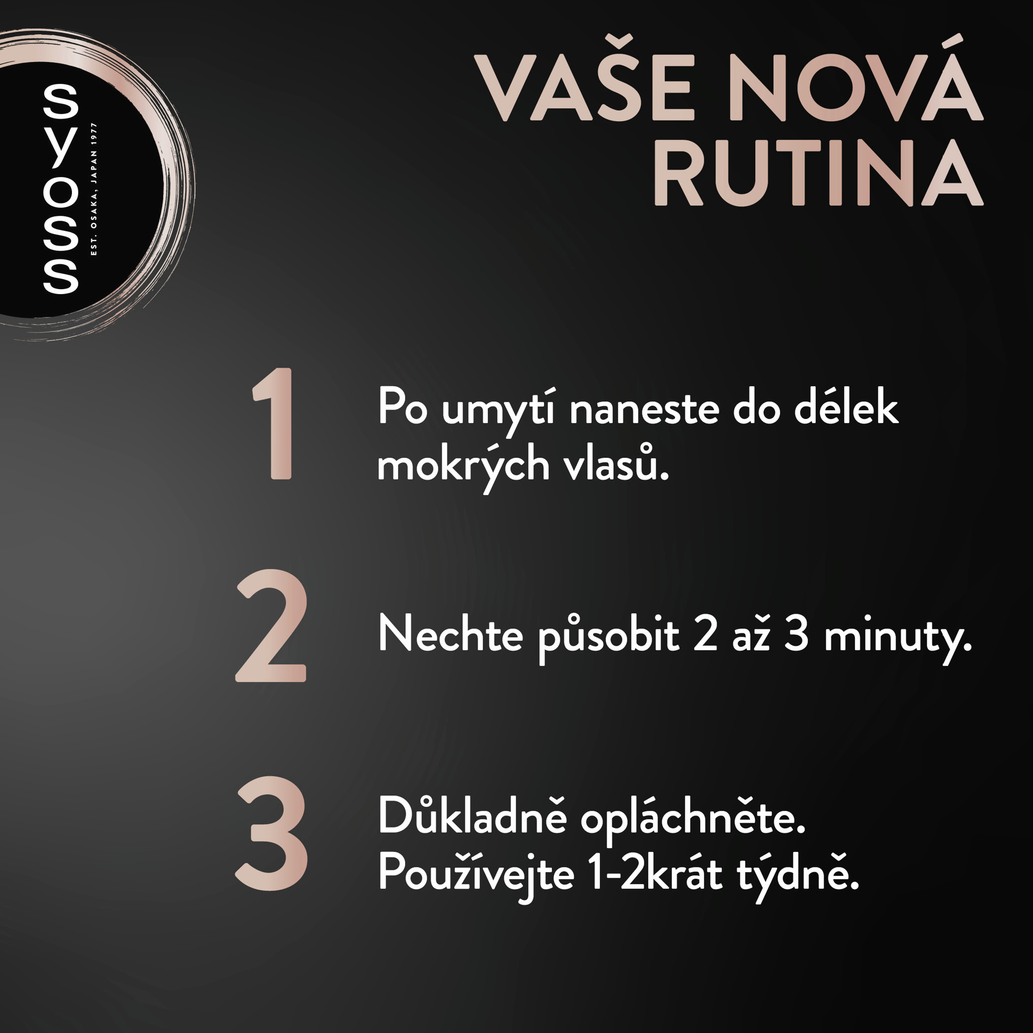 Naneste do délek mokrých vlasů a nechte působit 2 až 3 minuty. Důkladně opláchněte. Používejte 1 - 2krát týdně. Pro nejlepší výsledky použijte v kombinaci s dalšími produkty řady Syoss Intense Keratin.
