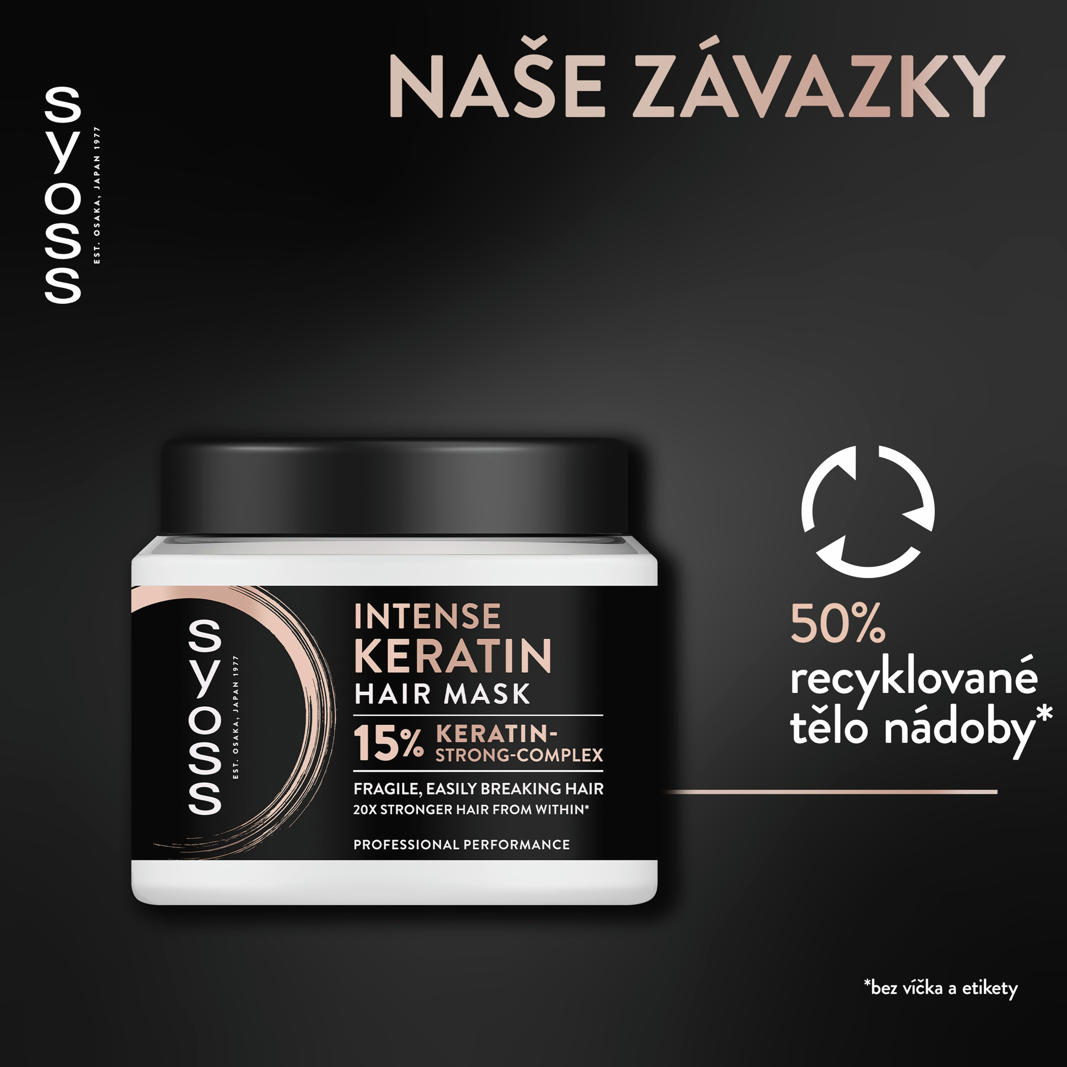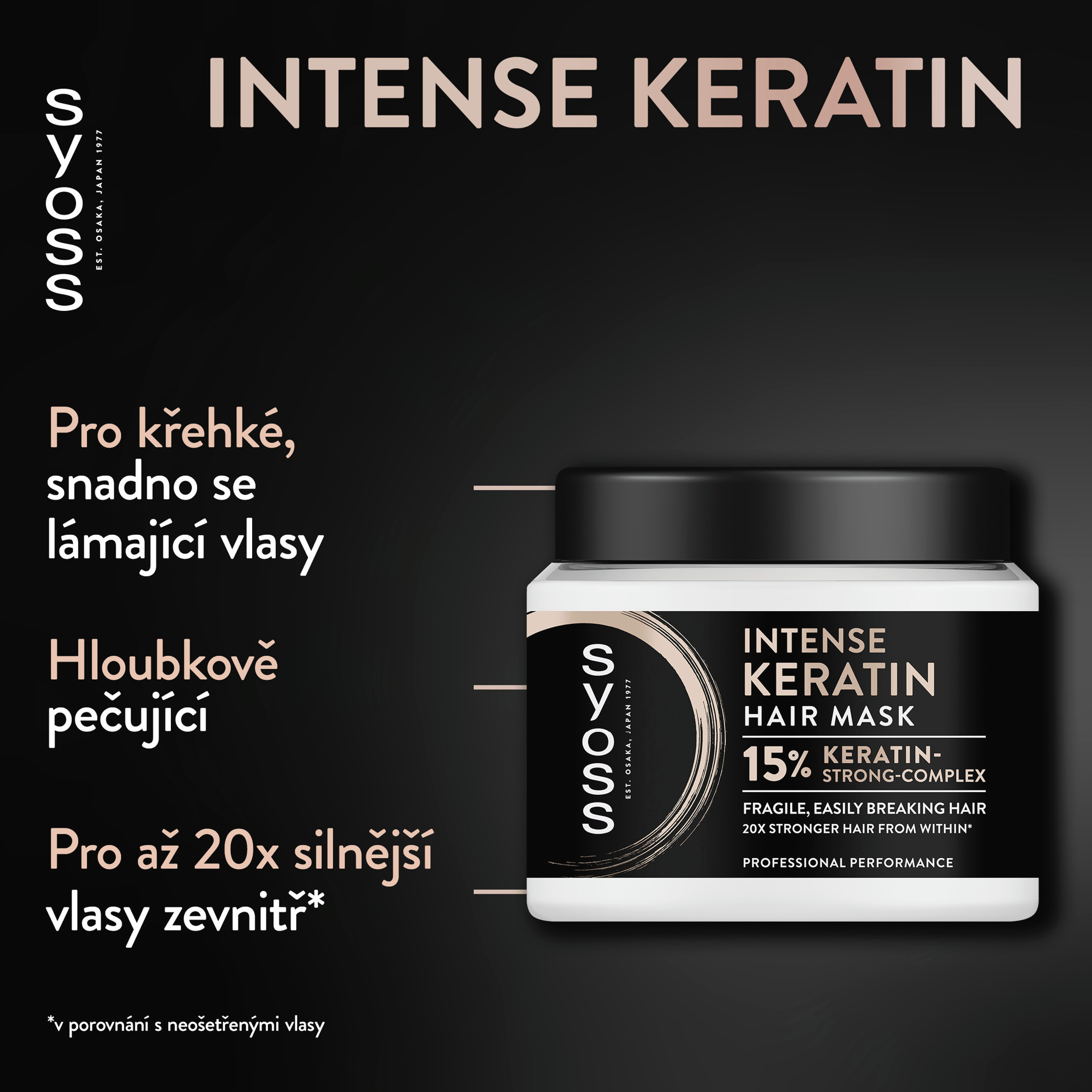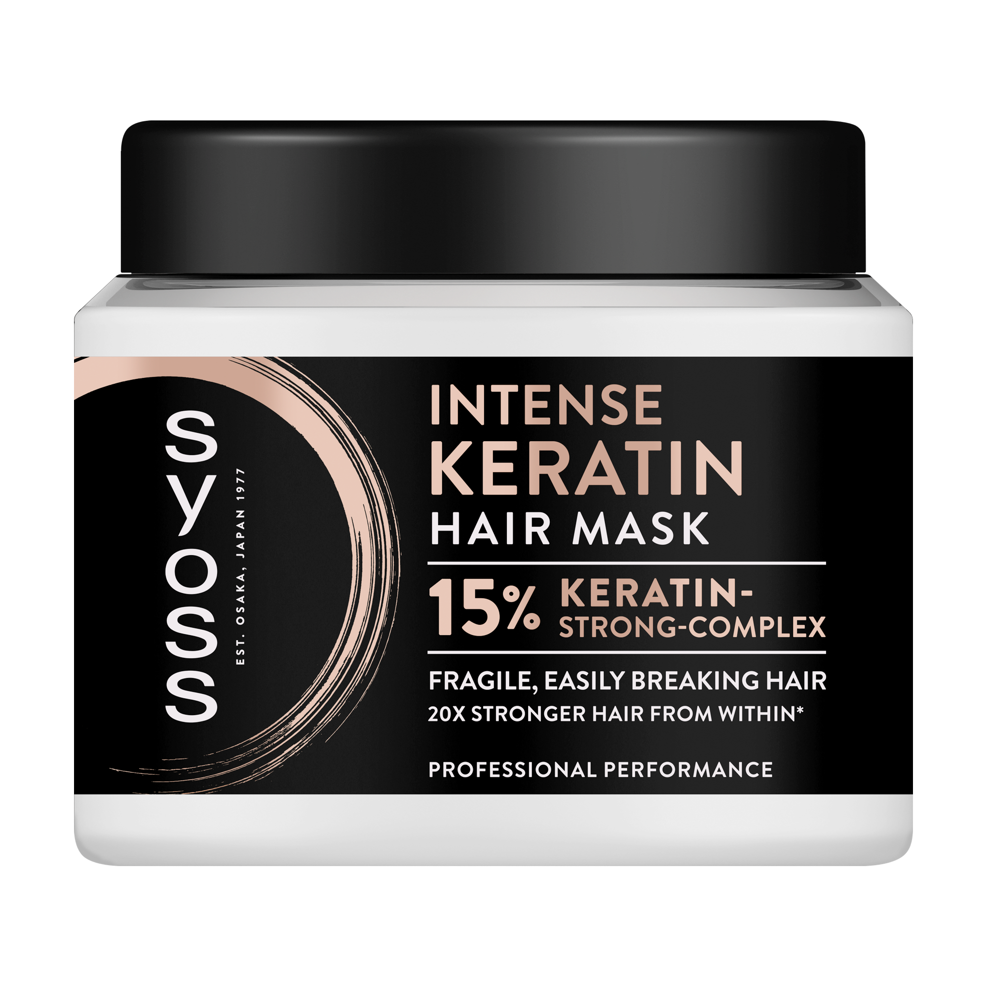 Maska na vlasy Syoss Intense Keratin pro slabé a lehce lámavé vlasy. Vlasová maska Syoss Intense Keratin obsahuje hloubkově pečující složení s posilujícím 15% keratinovým komplexem, které posílí vlasy zevnitř a díky tomu budou krásné a zdravě vypadající zevnitř i navenek. Tato keratinová maska vyživuje a obnovuje slabé, snadno se lámající vlasy a zároveň je doplňuje keratinem, který pomáhá předcházet lámání vlasů a třepení konečků. Díky tomu budou vaše vlasy až 20× silnější (ve srovnání s neošetřenými), a to bez zatížení. Tělo nádoby je vyrobeno z 50% recyklovaného materiálu (bez víčka a etikety).