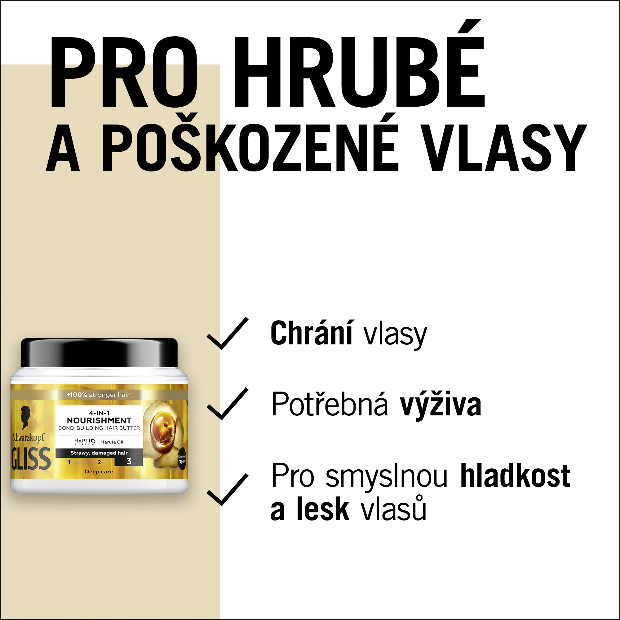 - Vyživující vlasová maska Gliss 4 v 1 vytvářející vazby díky systému Haptiq + marulový olej pro hrubé a poškozené vlasy. Dopřejte svým vlasům výživu, hebkost a lesk.