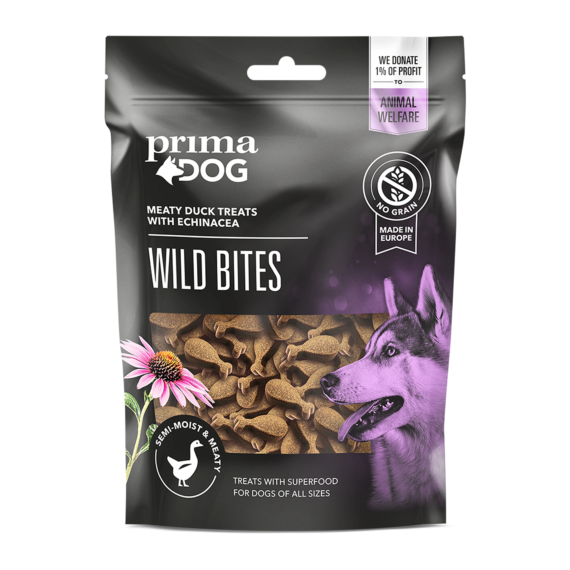 Poloměkké pamlsky PrimaDog kachna s echinaceou jsou masitou a vysoce kvalitní stravou pro vašeho psa. Všechny produkty řady Wild Bites byly obohaceny o severské superpotraviny. Každé sousto obsahuje kromě chutné kachny i třapatku, která přispívá k posílení imunity přirozeným způsobem. Tyto kousky obsahují také lososový olej, který pomáhá udržet srst vašeho psa lesklou a zdravou. Kachna jako hlavní složka dělá z Wild Bites skutečnou lahůdku pro psy. PrimaDog Wild Bites jsou ideální pamlsky pro výcvik, protože mají nízký obsah tuku. Wild Bites neobsahují žádnou pšenici, kukuřici nebo sóju. Polovlhké kousky se snadno krájí na menší kousky.