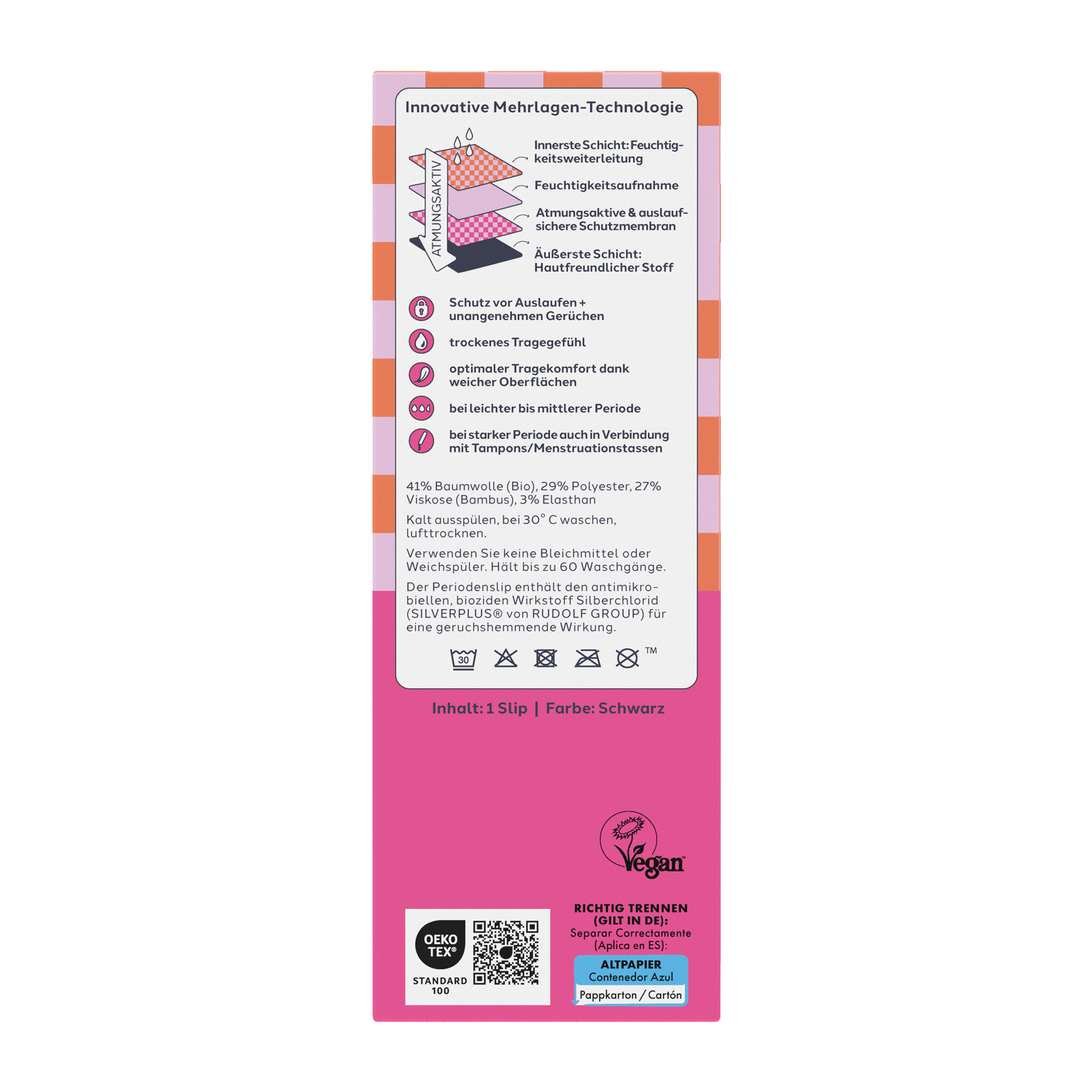 Stejně pohodlné jako běžné spodní prádlo. Ochrana proti úniku a nepříjemnému zápachu. Pocit sucha. Optimální pohodlí díky měkkému povrchu. Inovativní vícevrstvá technologie. S organickou bavlnou. Lze prát a opakovaně používat.