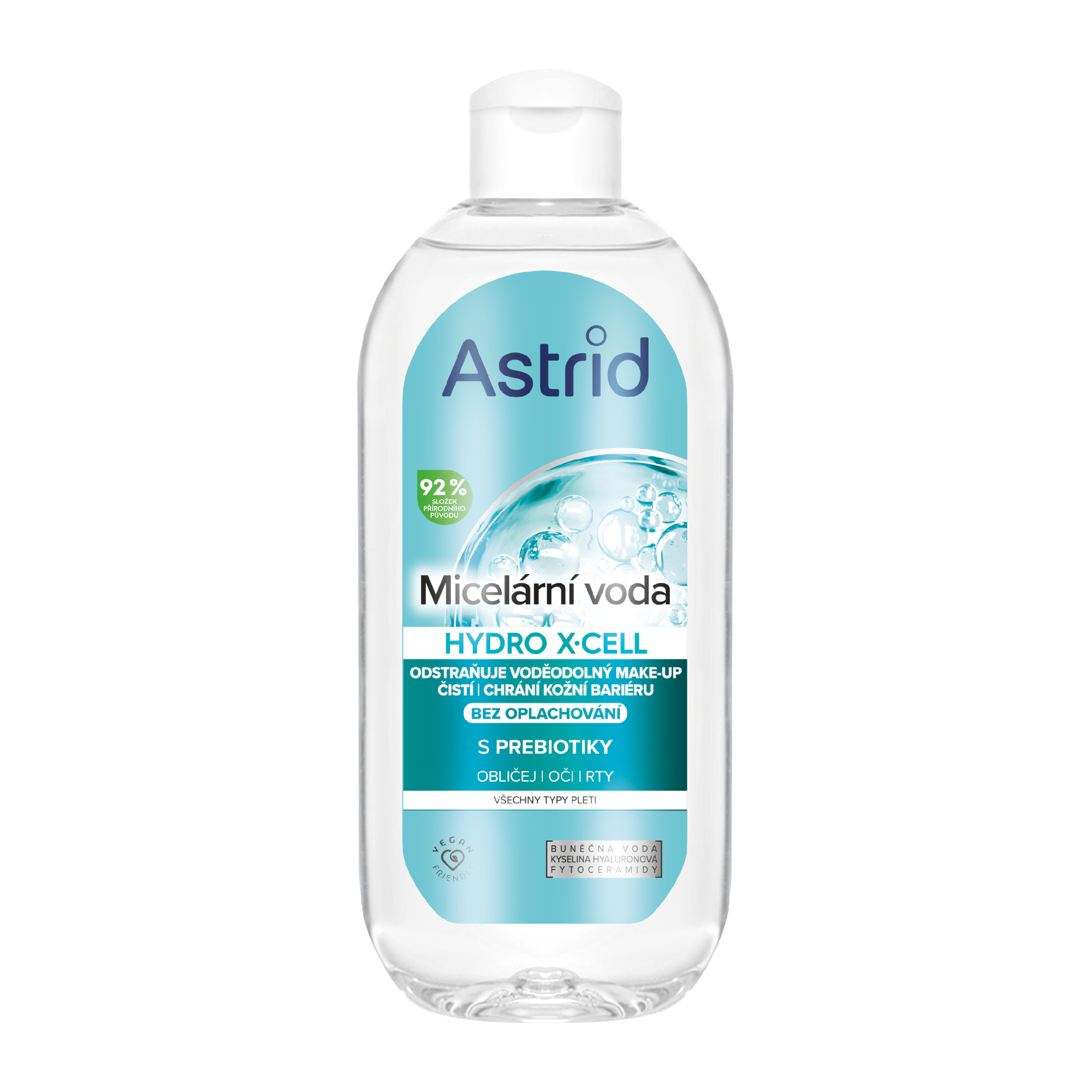 Astrid Hydro X-Cell Micelární voda pro všechny typy pleti s 92 % složek přírodního původu je váš každodenní pomocník pro dokonale čistou pleť. Jedná se o pohodlný, účinný a jemný způsob, jak odstranit make-up a nečistoty jedním tahem. Její pokročilé složení, které obsahuje jemné částečky oleje a vody, zachytí a odstraní i voděodolný make-up a nečistoty, aniž by pleť vysušilo. Obohacená o 100% přírodní buněčnou vodu ze spiruliny, kyselinu hyaluronovou a fytoceramidy pomáhá chránit kožní bariéru. Účinek: Tato jemná čisticí micelární voda účinně odstraňuje i voděodolný make-up z obličeje, očí a rtů. Zanechává pleť jemnější, hladší a osvěženou, protože pomáhá předcházet dehydrataci.