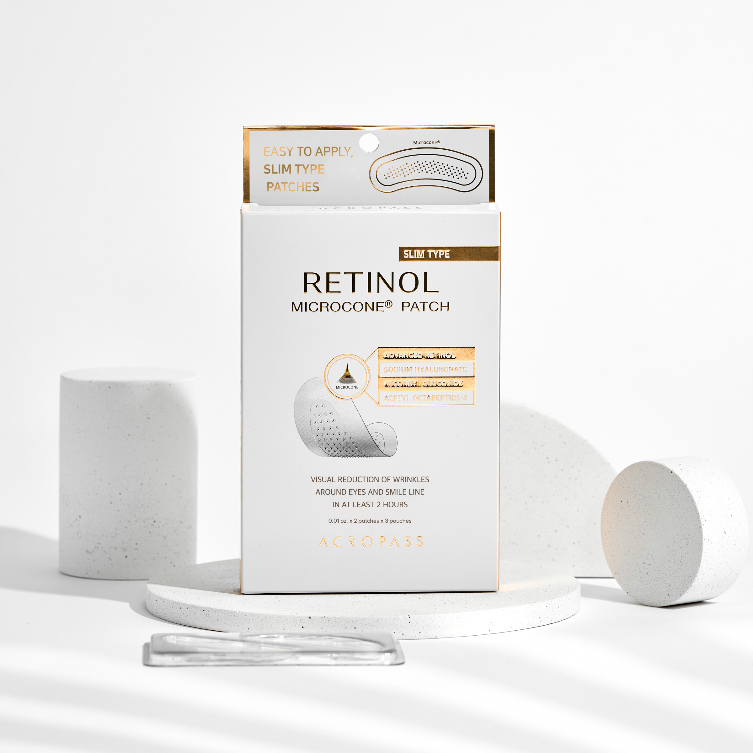 Mikrojehličkové náplasti s retinolem a kyselinou hyaluronovou s účinnou a patentovanou technologií Retinol Microcone®. Pomáhají redukovat jemné vrásky, vyhlazují texturu pleti a zpevňují ošetřovanou oblast. Ideální pro lokální aplikaci na oblast vrásek kolem očí, čela či úst.