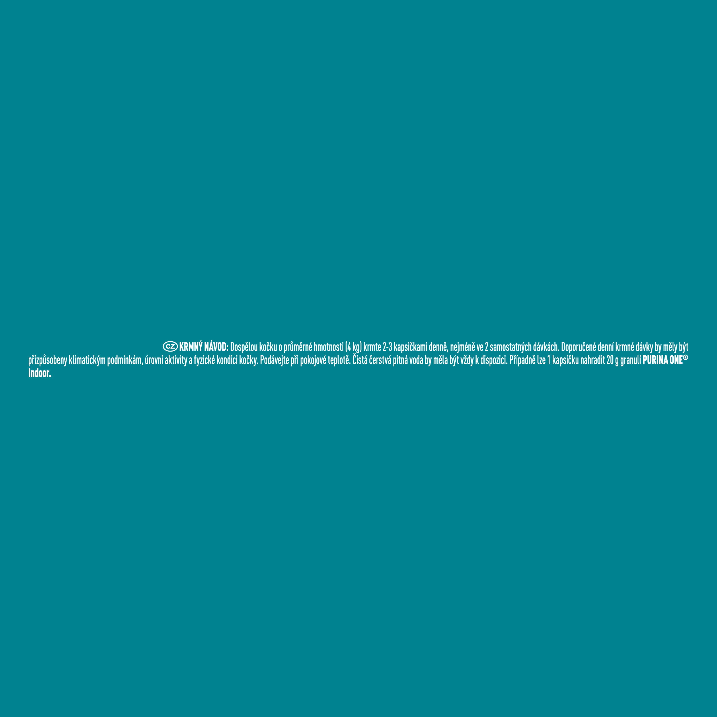 Krmný návod: Dospělou kočku o průměrné hmotnosti (4 kg) krmte 2-3 kapsičkami denně, nejméně ve 2 samostatných dávkách. Doporučené denní krmné dávky by měly být přizpůsobeny klimatickým podmínkám, úrovni aktivity a fyzické kondici kočky. Podávejte při pokojové teplotě. Čistá čerstvá pitná voda by měla být vždy k dispozici. Případně lze 1 kapsičku nahradit 20 g granulí Purina ONE Indoor.