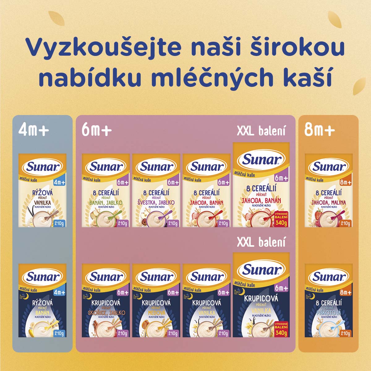 Cereální mléčné kaše jsou nedílnou součástí pestrého a vyváženého jídelníčku dítěte. Při podávání prvních příkrmů je důležité, aby si dítě co nejméně zvykalo na sladkou chuť a vytvořilo si tak správné stravovací návyky do budoucnosti. Proto do našich mléčných kaší Sunar nepřidáváme žádné cukry*.
