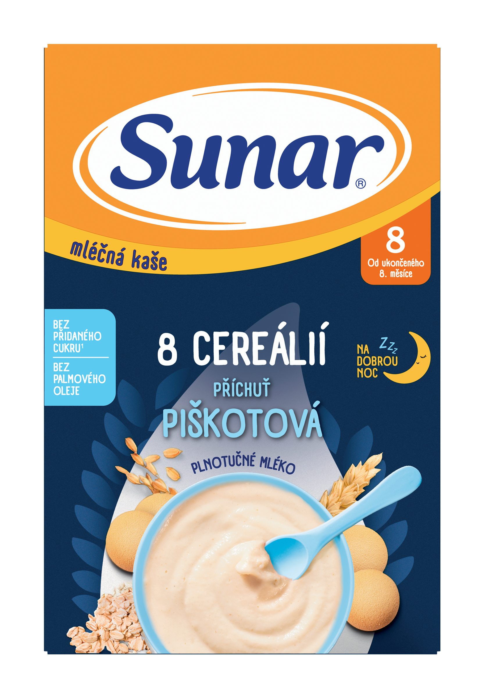 Sunar mléčná kaše s 8 cereáliemi skvěle chutná díky obsahu plnotučného mléka a zajistí spokojené bříško před spaním. S celozrnnými cereáliemi. Obsahuje lepek. Vhodné pro děti od ukončeného 8. měsíce. Sunar mléčná kaše 8 cereálií s příchutí piškotu je příkrm vhodný pro děti od ukončeného 8. měsíce. Kaše neobsahuje žádný přidaný cukr. Svou skvělou chuť si získává díky obsahu plnotučného mléka. Multicereální kaše obsahuje také celozrnné cereálie, které obsahují řadu výživných látek a jsou hlavním zdrojem vlákniny. Kaše je navíc obohacena o vitaminy a minerální látky, které jsou důležité pro správný růst a vývoj kojenců a malých dětí např. železo přispívá ke správné funkci imunitního systému.